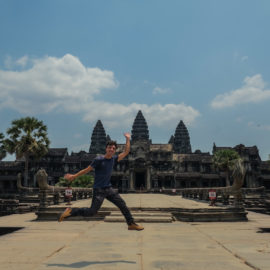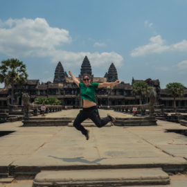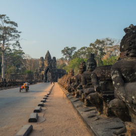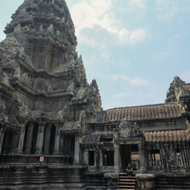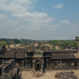 Les temples d’Angkor se trouvent à plusieurs kilomètres de la ville donc nous avons décidé de prendre un tuk tuk pour cette journée et le lendemain. Comme nos jours étaient comptés nous devions aller au plus vite ! Pour ce 1er jour nous sommes partis vers 10h de l’hôtel, nous voulions profiter mais aussi nous reposer. La première visite commençait fort car notre chauffeur, avec qui nous avions déterminé le tour à faire, venait de nous déposer juste derrière le temple d’Angkor Wat, le plus connu de tous. Nous étions seul au monde, voilà un avantage (pour nous voyageur) de ce virus. Les masses de touristes n’étaient pas là et même si nous avons pu croiser quelques personnes ça n’était rien comparé au nombre de personne qui visite ces temples habituellement. En un mois les temples peuvent accueillir plus de 200 000 visiteurs, là je pense que le nombre de touriste pouvait se compter en petite centaine. En tout cas la visite de ce temple était géniale, les lieux sont magnifiques, les grands espaces qui entourent le temple le sont également. On s’est régalé à le contempler sous tous les angles !