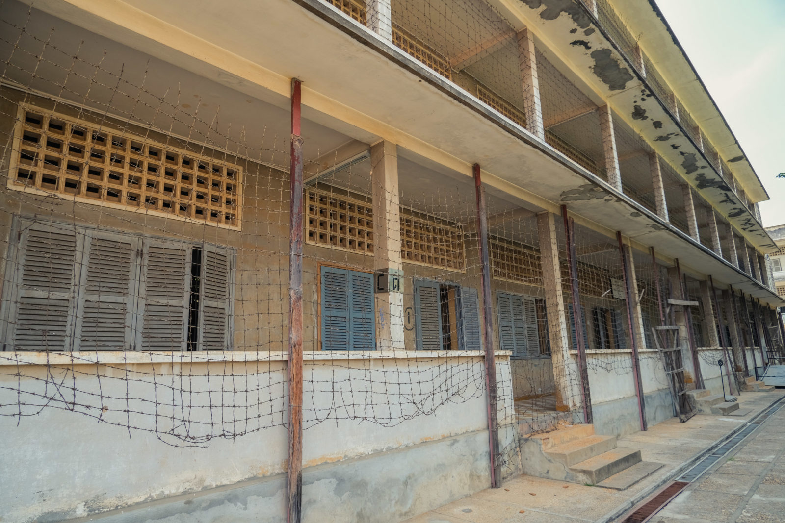 Pendant leur détention, les prisonniers étaient entassé dans ce qui avait été les salles de classe. Ils étaient accrochés les uns aux autres par une barre de fer sur laquelle il y avait des crochets qui maintenait les chevilles de chacun. Ils ne pouvaient donc pas bouger car de toute façon ça leur était interdit. Ils étaient accrochés par dizaine et installés allongé au sol. Si l’un d’eux voulait bouger ou s’asseoir, il devait demander la permission et ses camardes devaient suivre le mouvement. Dans quelques salles de classe des murs en brique avaient été construit pour parquer les prisonniers dans des cellules d’un mètre carré toujours avec les chevilles maintenues par un crochet figé dans le sol bétonné.