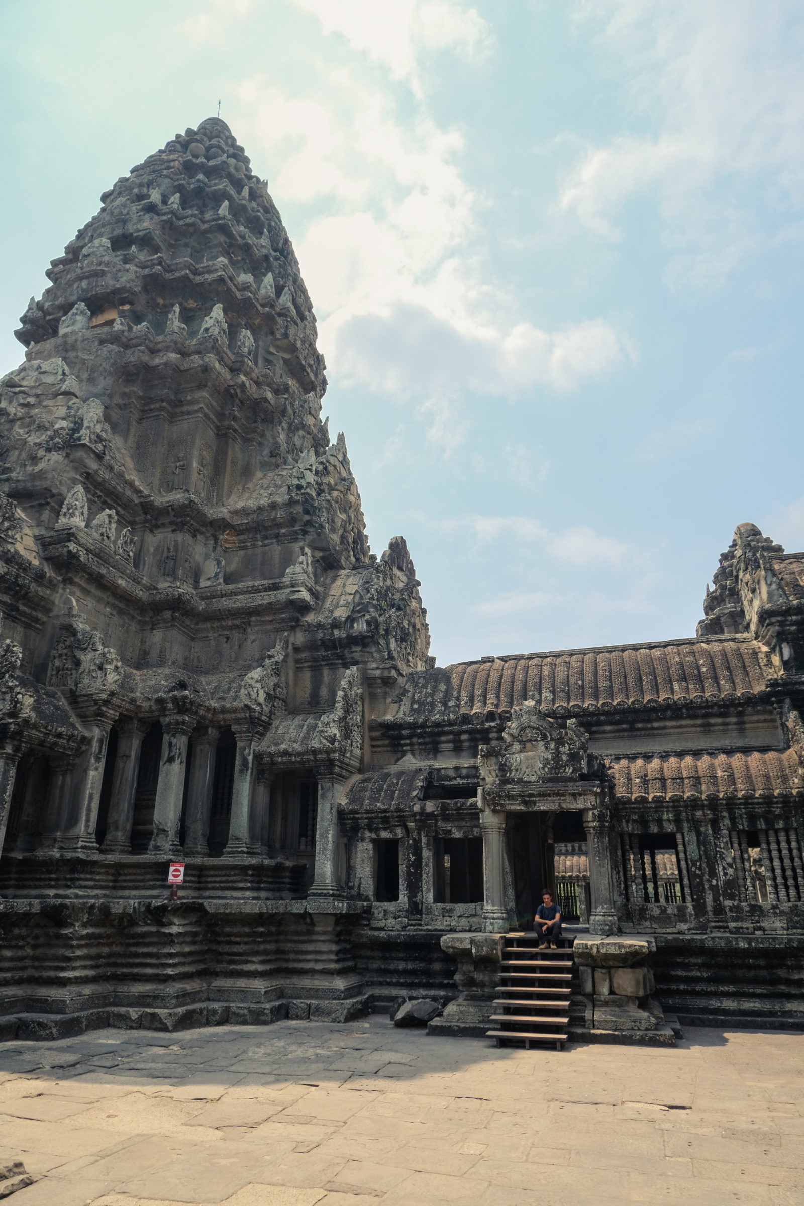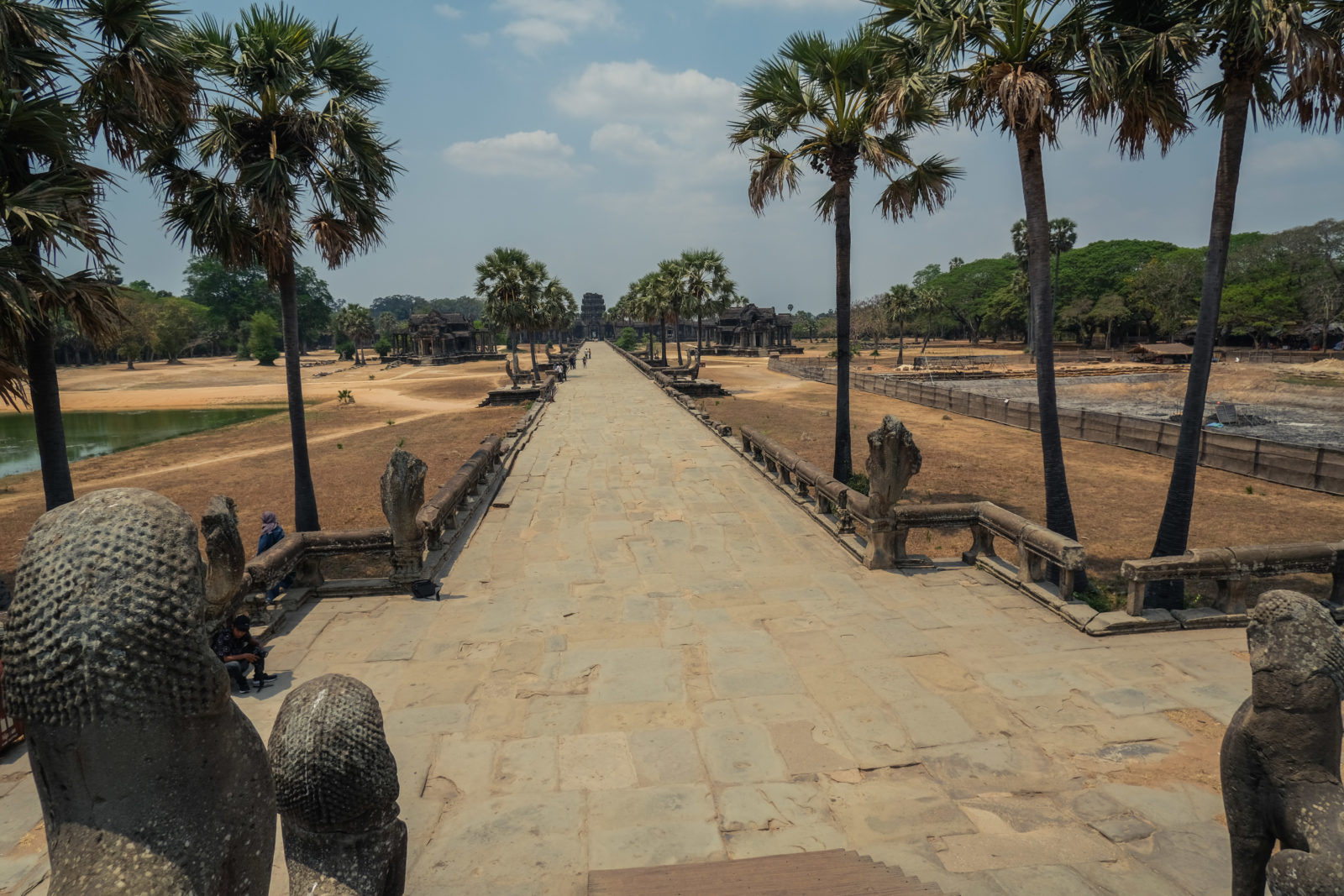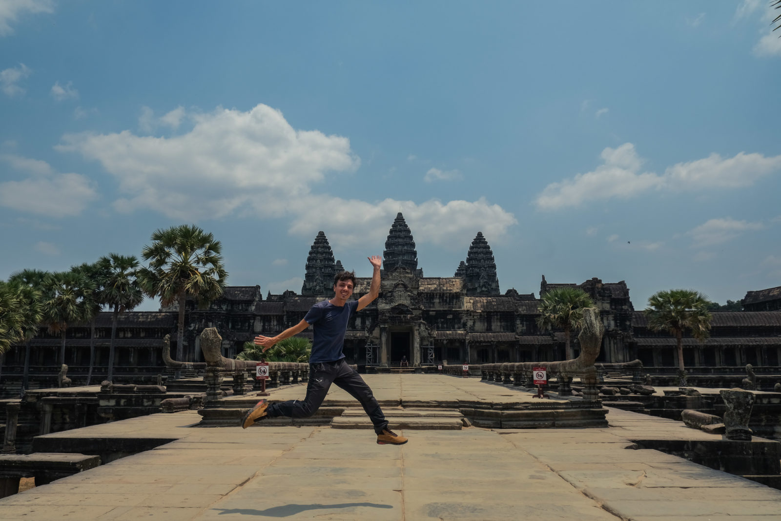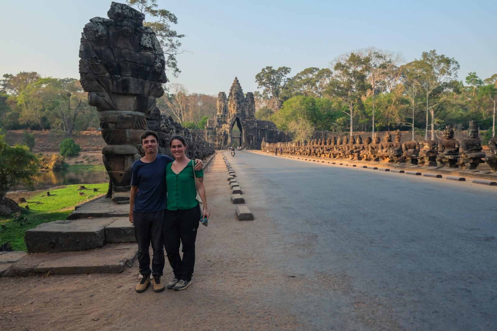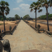 Les temples d’Angkor se trouvent à plusieurs kilomètres de la ville donc nous avons décidé de prendre un tuk tuk pour cette journée et le lendemain. Comme nos jours étaient comptés nous devions aller au plus vite ! Pour ce 1er jour nous sommes partis vers 10h de l’hôtel, nous voulions profiter mais aussi nous reposer. La première visite commençait fort car notre chauffeur, avec qui nous avions déterminé le tour à faire, venait de nous déposer juste derrière le temple d’Angkor Wat, le plus connu de tous. Nous étions seul au monde, voilà un avantage (pour nous voyageur) de ce virus. Les masses de touristes n’étaient pas là et même si nous avons pu croiser quelques personnes ça n’était rien comparé au nombre de personne qui visite ces temples habituellement. En un mois les temples peuvent accueillir plus de 200 000 visiteurs, là je pense que le nombre de touriste pouvait se compter en petite centaine. En tout cas la visite de ce temple était géniale, les lieux sont magnifiques, les grands espaces qui entourent le temple le sont également. On s’est régalé à le contempler sous tous les angles !