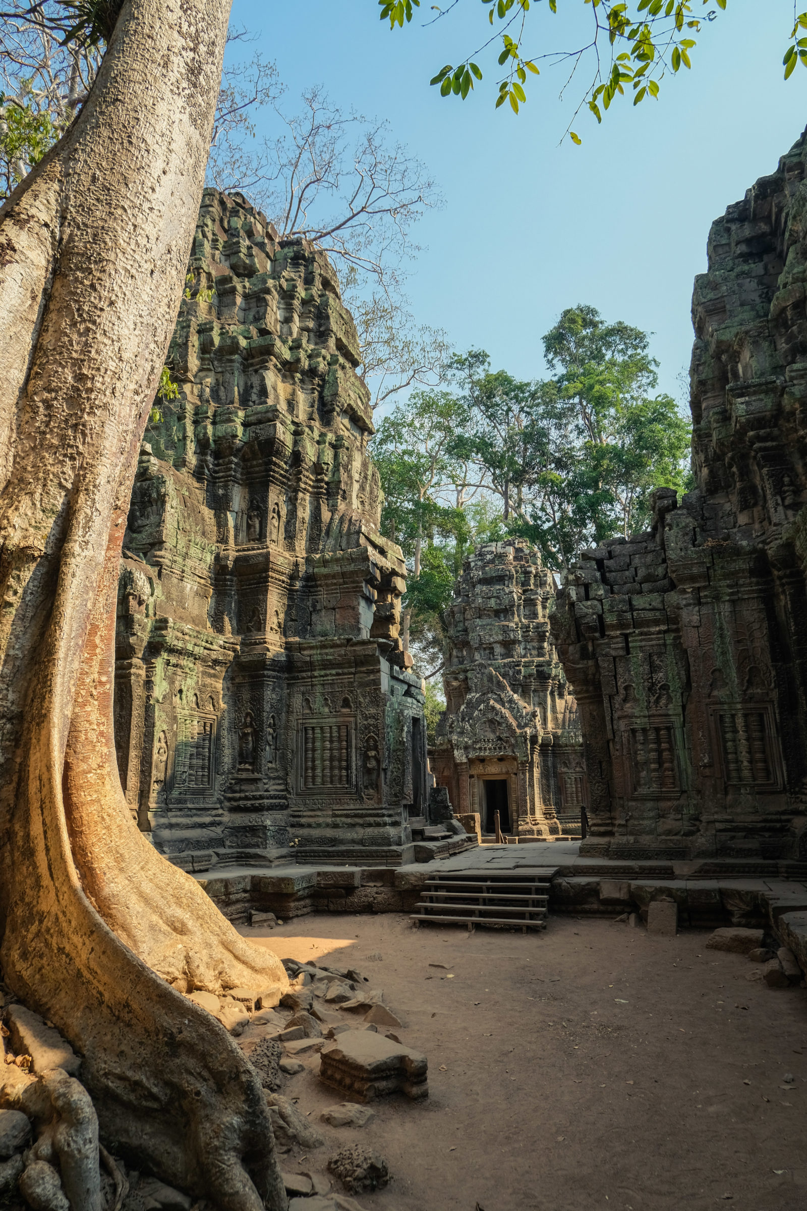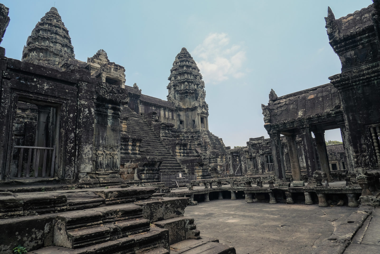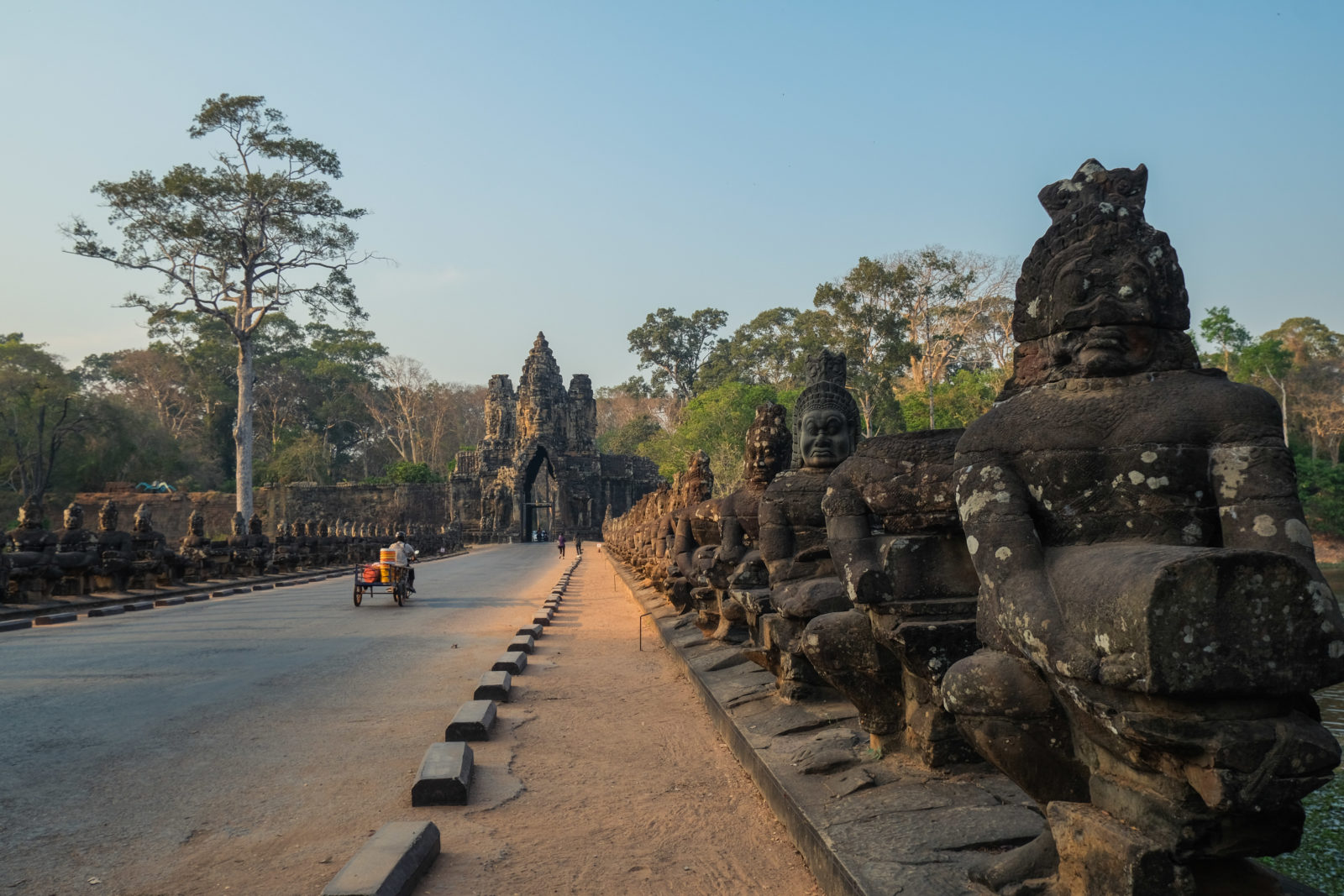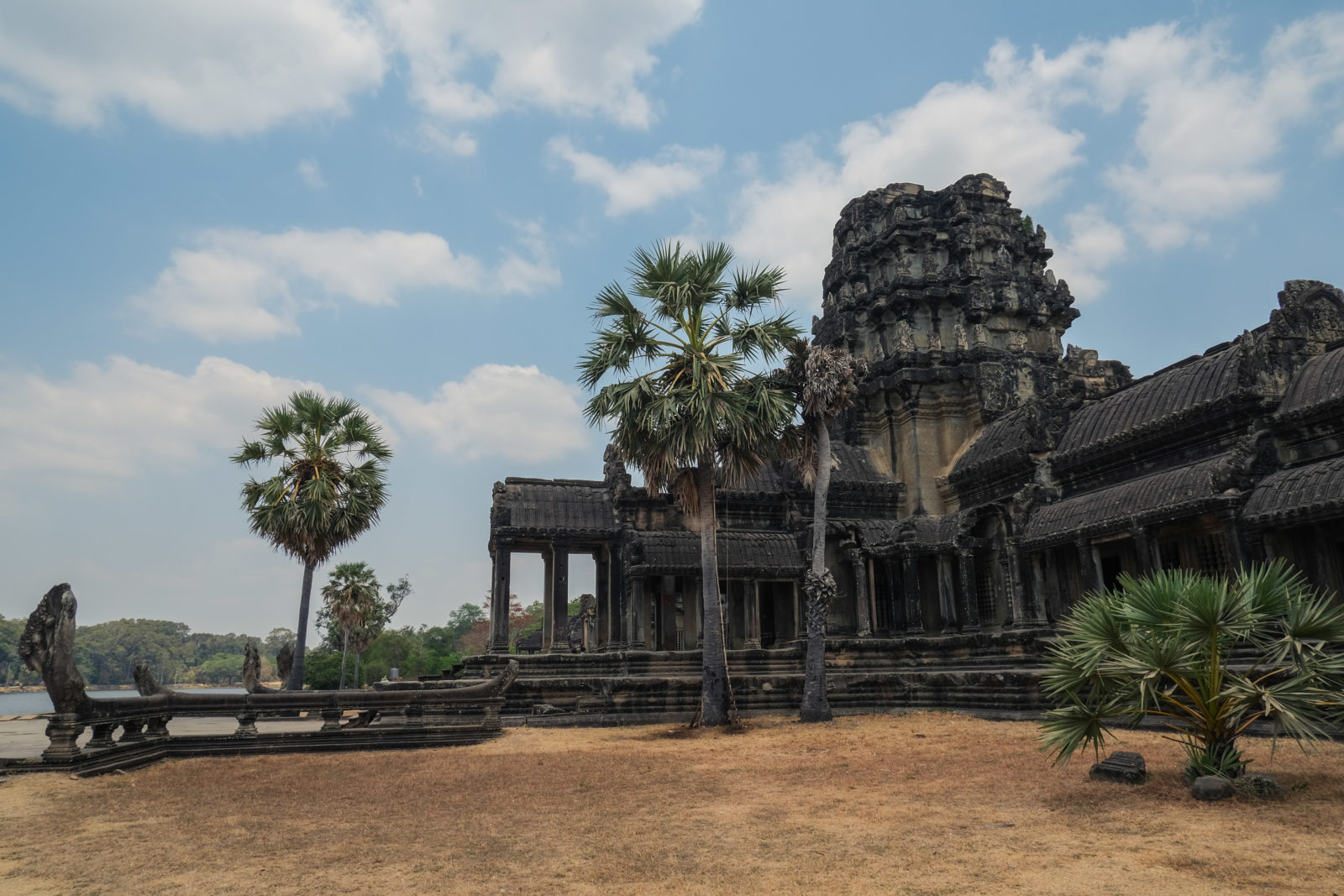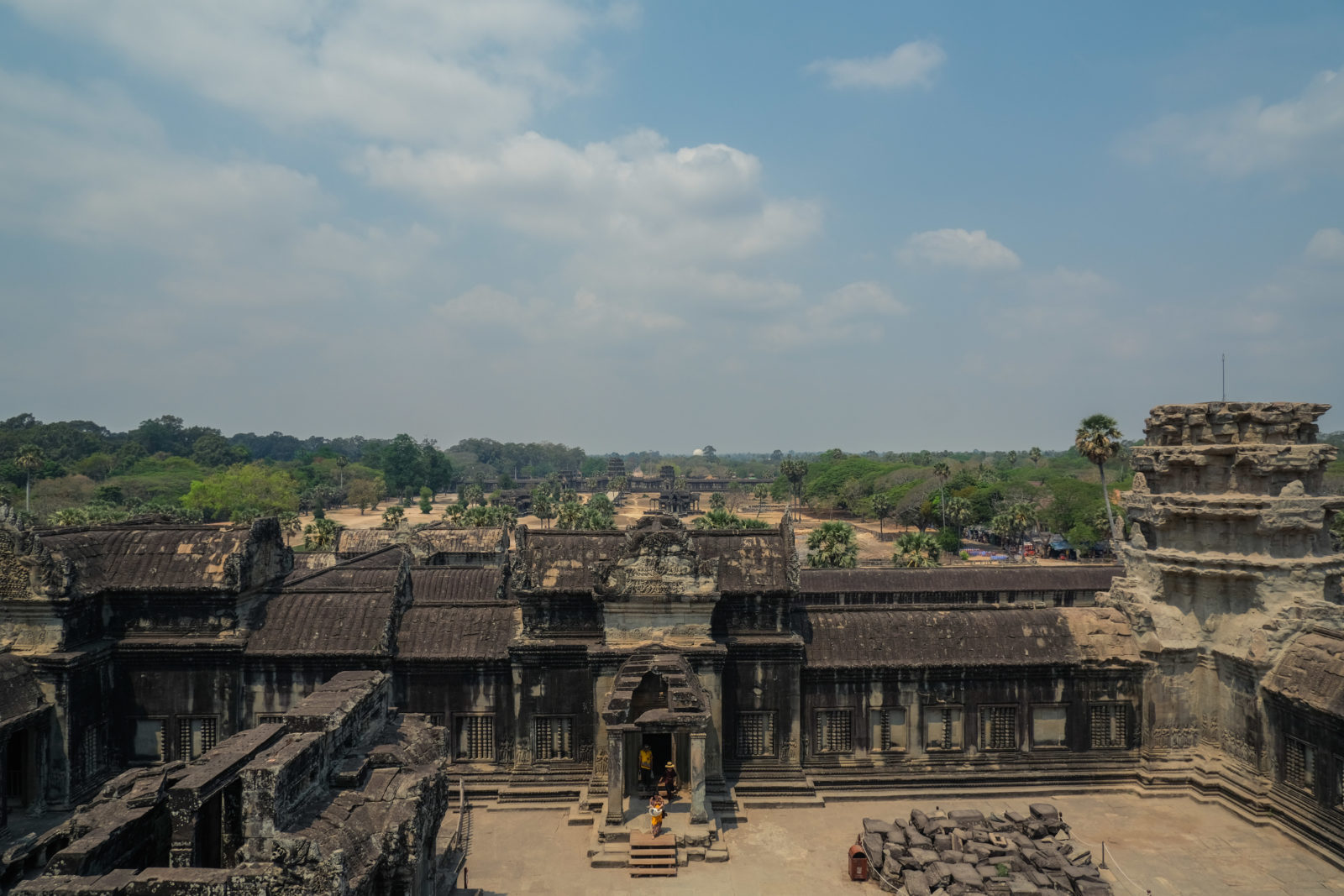 Les temples d’Angkor se trouvent à plusieurs kilomètres de la ville donc nous avons décidé de prendre un tuk tuk pour cette journée et le lendemain. Comme nos jours étaient comptés nous devions aller au plus vite ! Pour ce 1er jour nous sommes partis vers 10h de l’hôtel, nous voulions profiter mais aussi nous reposer. La première visite commençait fort car notre chauffeur, avec qui nous avions déterminé le tour à faire, venait de nous déposer juste derrière le temple d’Angkor Wat, le plus connu de tous. Nous étions seul au monde, voilà un avantage (pour nous voyageur) de ce virus. Les masses de touristes n’étaient pas là et même si nous avons pu croiser quelques personnes ça n’était rien comparé au nombre de personne qui visite ces temples habituellement. En un mois les temples peuvent accueillir plus de 200 000 visiteurs, là je pense que le nombre de touriste pouvait se compter en petite centaine. En tout cas la visite de ce temple était géniale, les lieux sont magnifiques, les grands espaces qui entourent le temple le sont également. On s’est régalé à le contempler sous tous les angles !