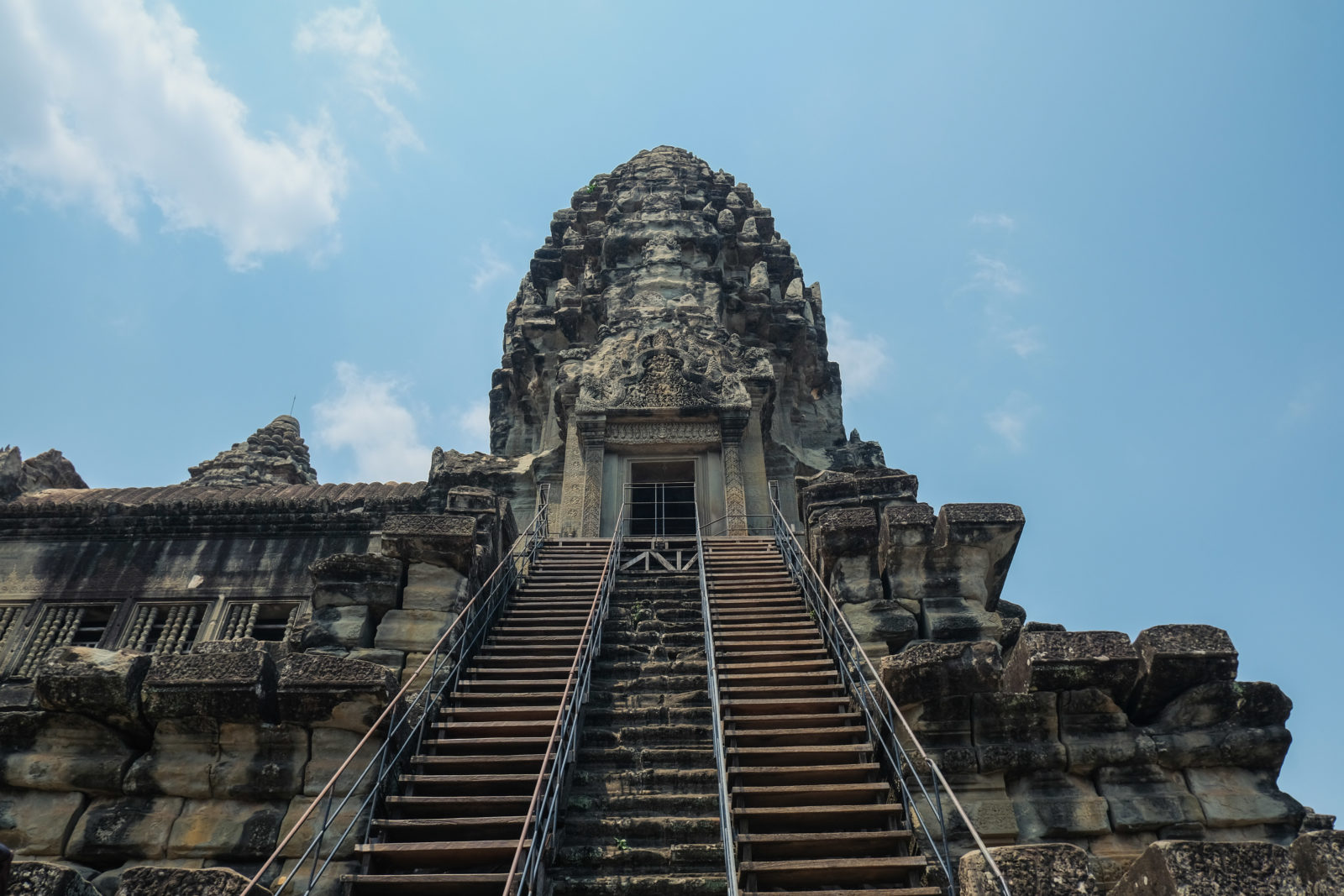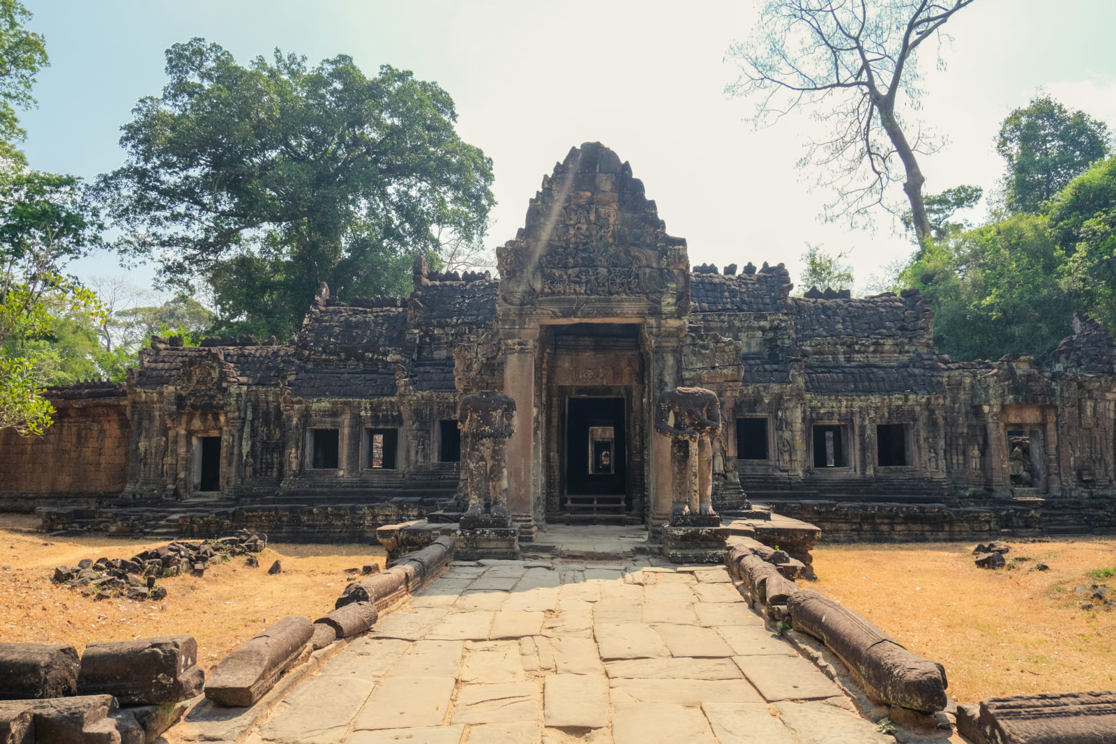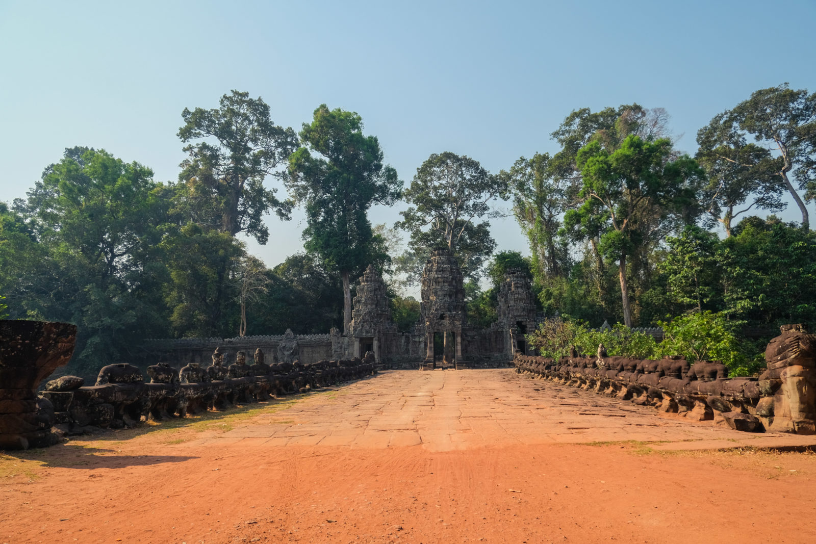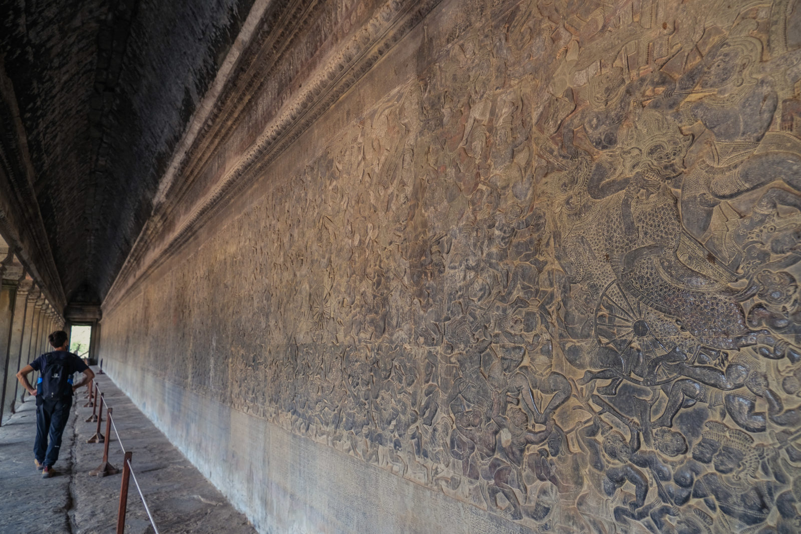Les temples d’Angkor se trouvent à plusieurs kilomètres de la ville donc nous avons décidé de prendre un tuk tuk pour cette journée et le lendemain. Comme nos jours étaient comptés nous devions aller au plus vite ! Pour ce 1er jour nous sommes partis vers 10h de l’hôtel, nous voulions profiter mais aussi nous reposer. La première visite commençait fort car notre chauffeur, avec qui nous avions déterminé le tour à faire, venait de nous déposer juste derrière le temple d’Angkor Wat, le plus connu de tous. Nous étions seul au monde, voilà un avantage (pour nous voyageur) de ce virus. Les masses de touristes n’étaient pas là et même si nous avons pu croiser quelques personnes ça n’était rien comparé au nombre de personne qui visite ces temples habituellement. En un mois les temples peuvent accueillir plus de 200 000 visiteurs, là je pense que le nombre de touriste pouvait se compter en petite centaine. En tout cas la visite de ce temple était géniale, les lieux sont magnifiques, les grands espaces qui entourent le temple le sont également. On s’est régalé à le contempler sous tous les angles !