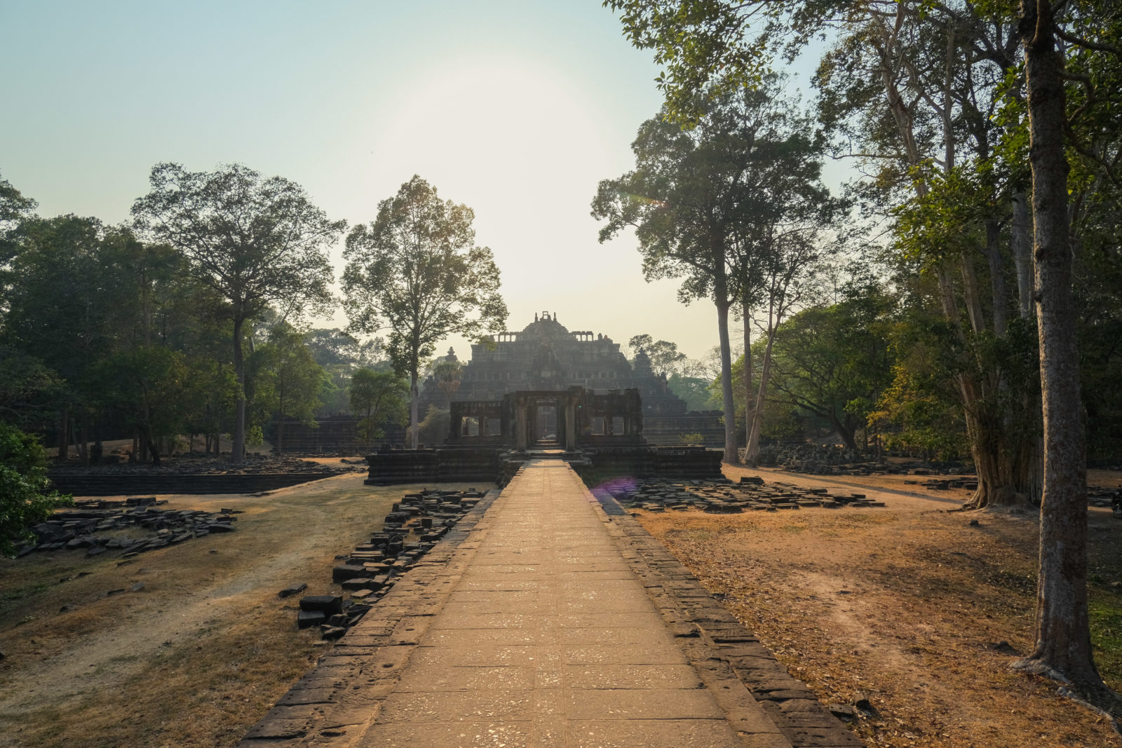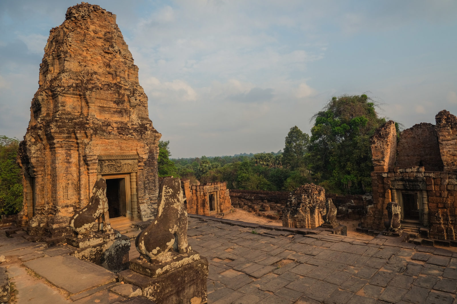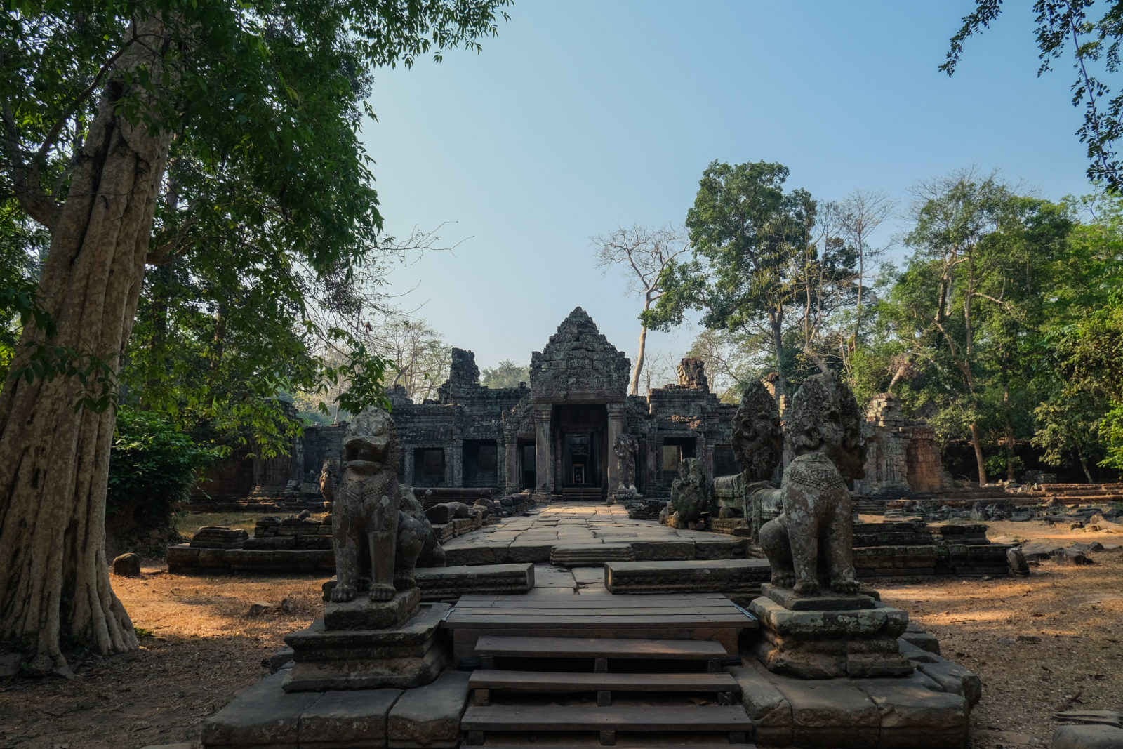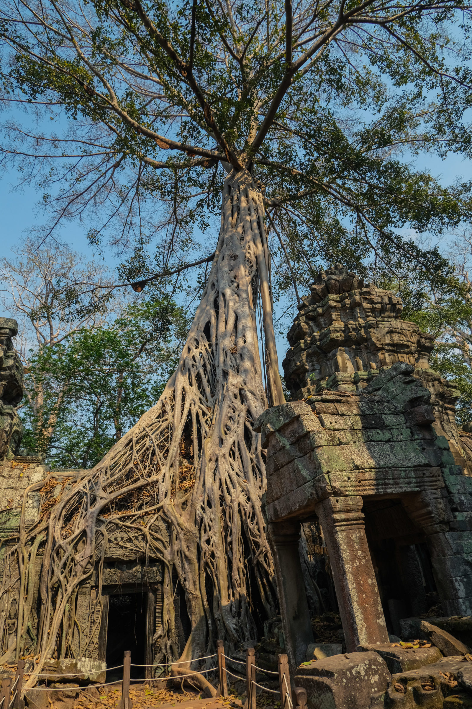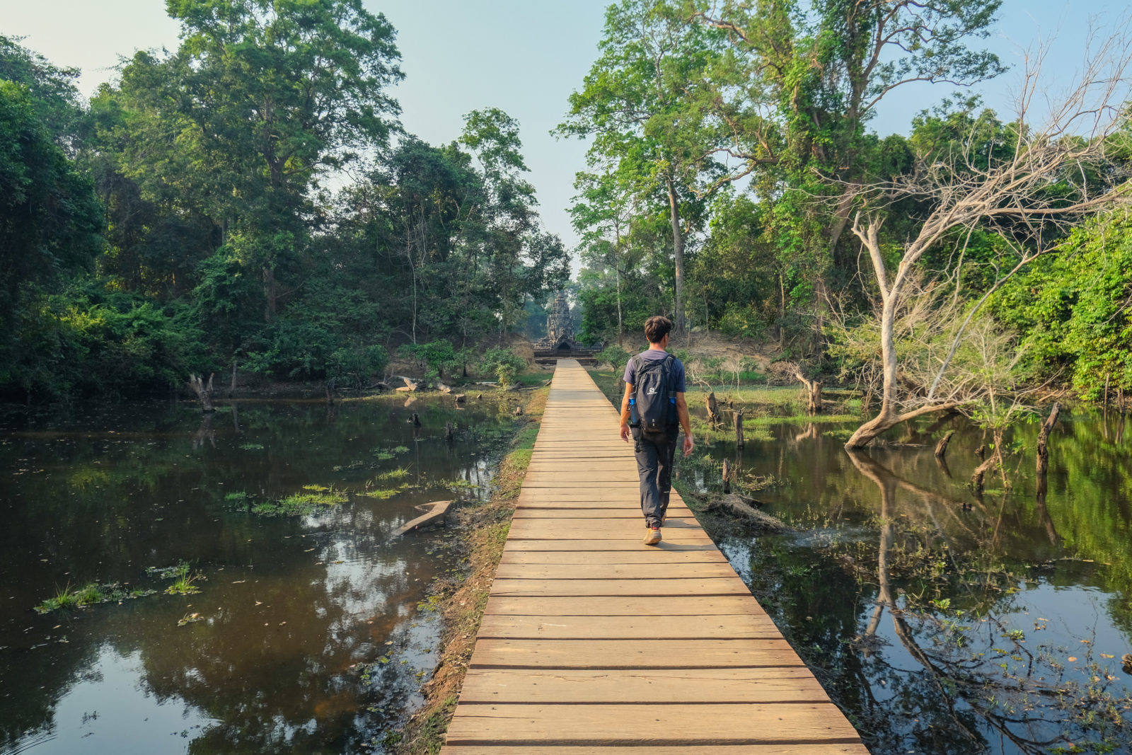 Ensuite nous avons poursuivi avec la visite de plusieurs autres temples. Ils étaient tous plus petits et plus isolés que ceux déjà visités la veille mais chacun avait son petit quelque chose de sympa. Il y en avait un posé sur l’eau et constituait à lui seul une île. La passerelle pour rejoindre l’île était entourée d’arbre posé dans l’eau, c’était très joli. Voilà, cette journée prenait fin et nos plans pour rejoindre la France se précisait. Nous avions réservé un vol pour le 27/03. Ce soir là nous prenions un bus de nuit pour rejoindre l’île de Koh Rong où nous avions décidé de terminer notre séjour au Cambodge.