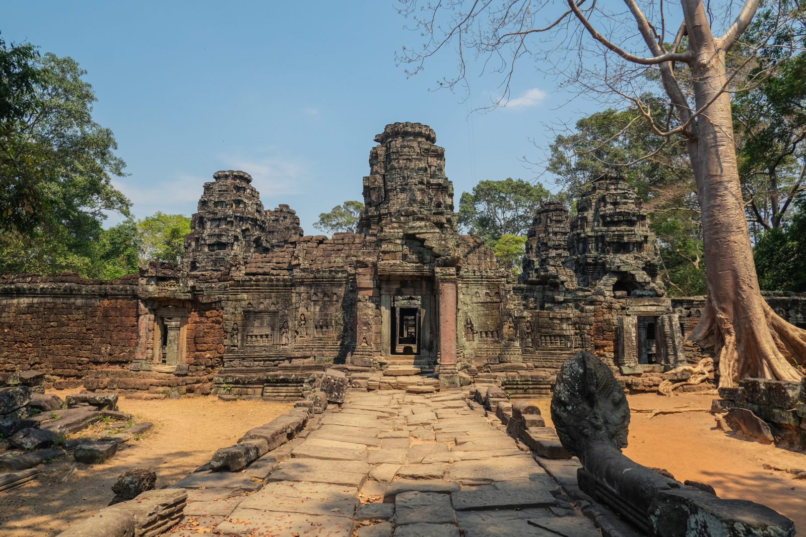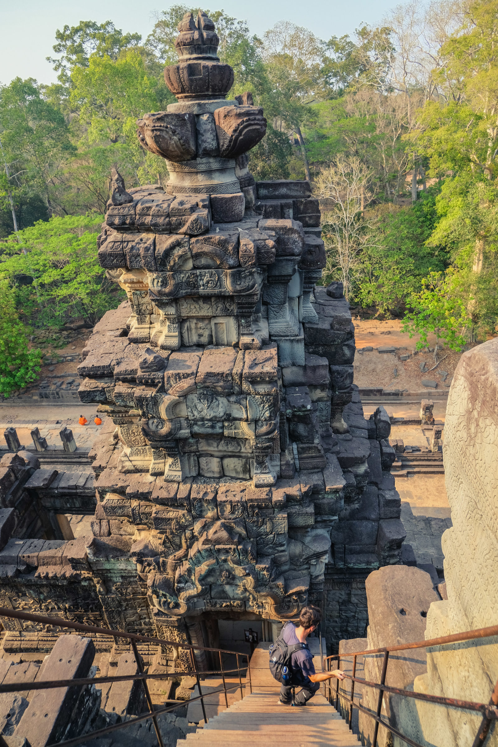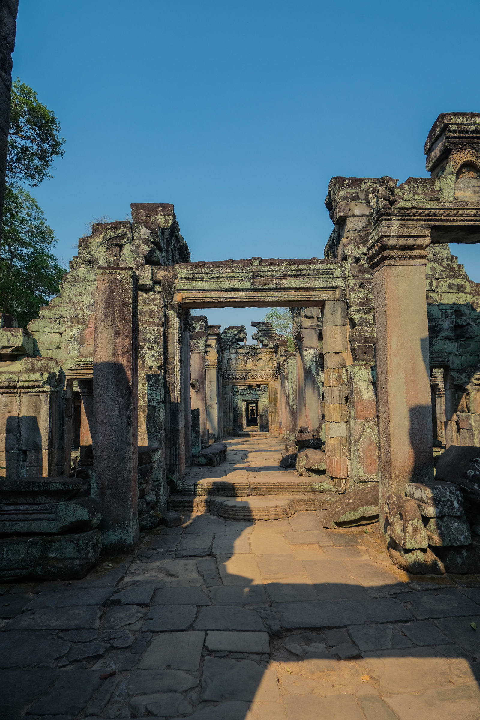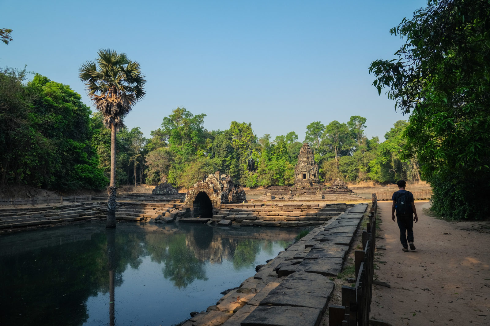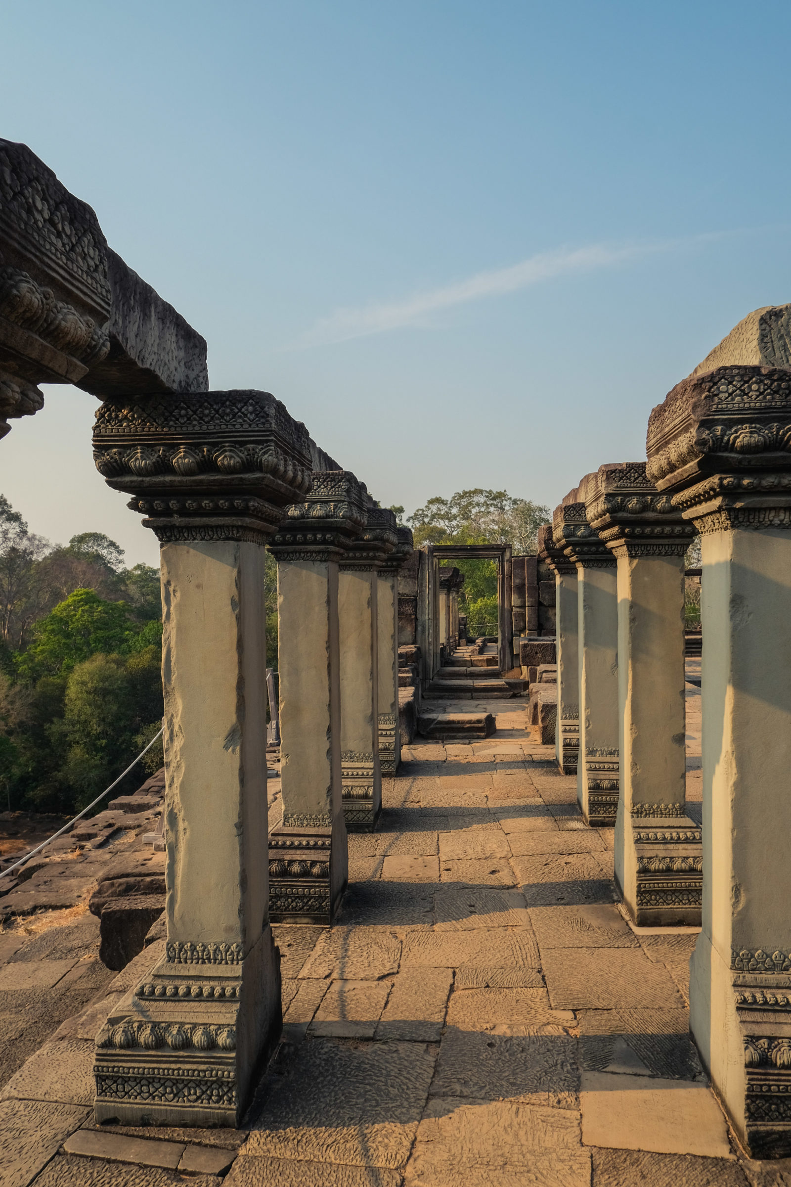 Ensuite nous avons poursuivi avec la visite de plusieurs autres temples. Ils étaient tous plus petits et plus isolés que ceux déjà visités la veille mais chacun avait son petit quelque chose de sympa. Il y en avait un posé sur l’eau et constituait à lui seul une île. La passerelle pour rejoindre l’île était entourée d’arbre posé dans l’eau, c’était très joli. Voilà, cette journée prenait fin et nos plans pour rejoindre la France se précisait. Nous avions réservé un vol pour le 27/03. Ce soir là nous prenions un bus de nuit pour rejoindre l’île de Koh Rong où nous avions décidé de terminer notre séjour au Cambodge.