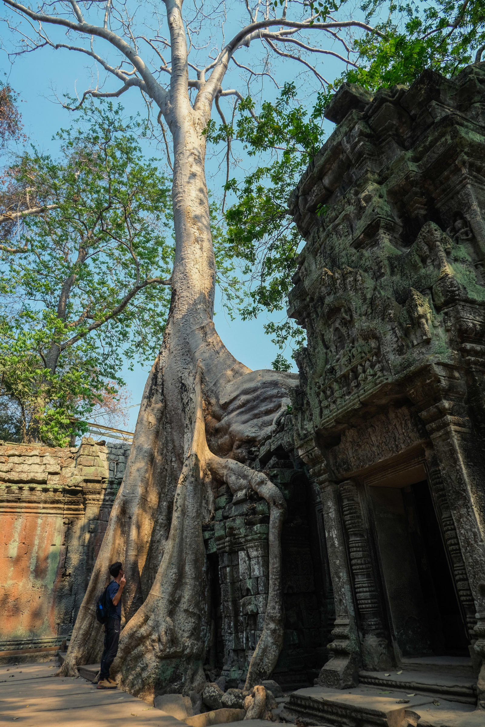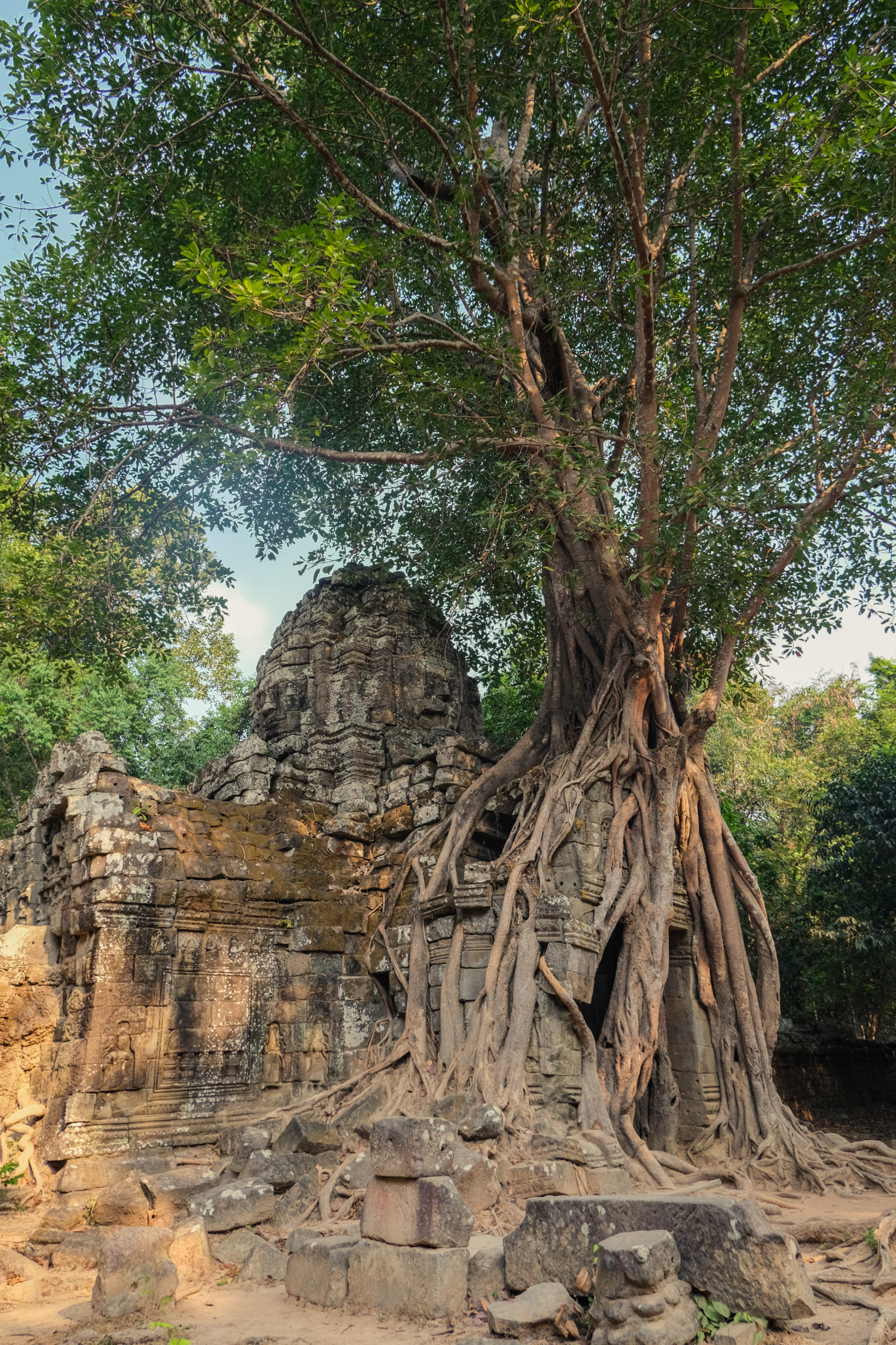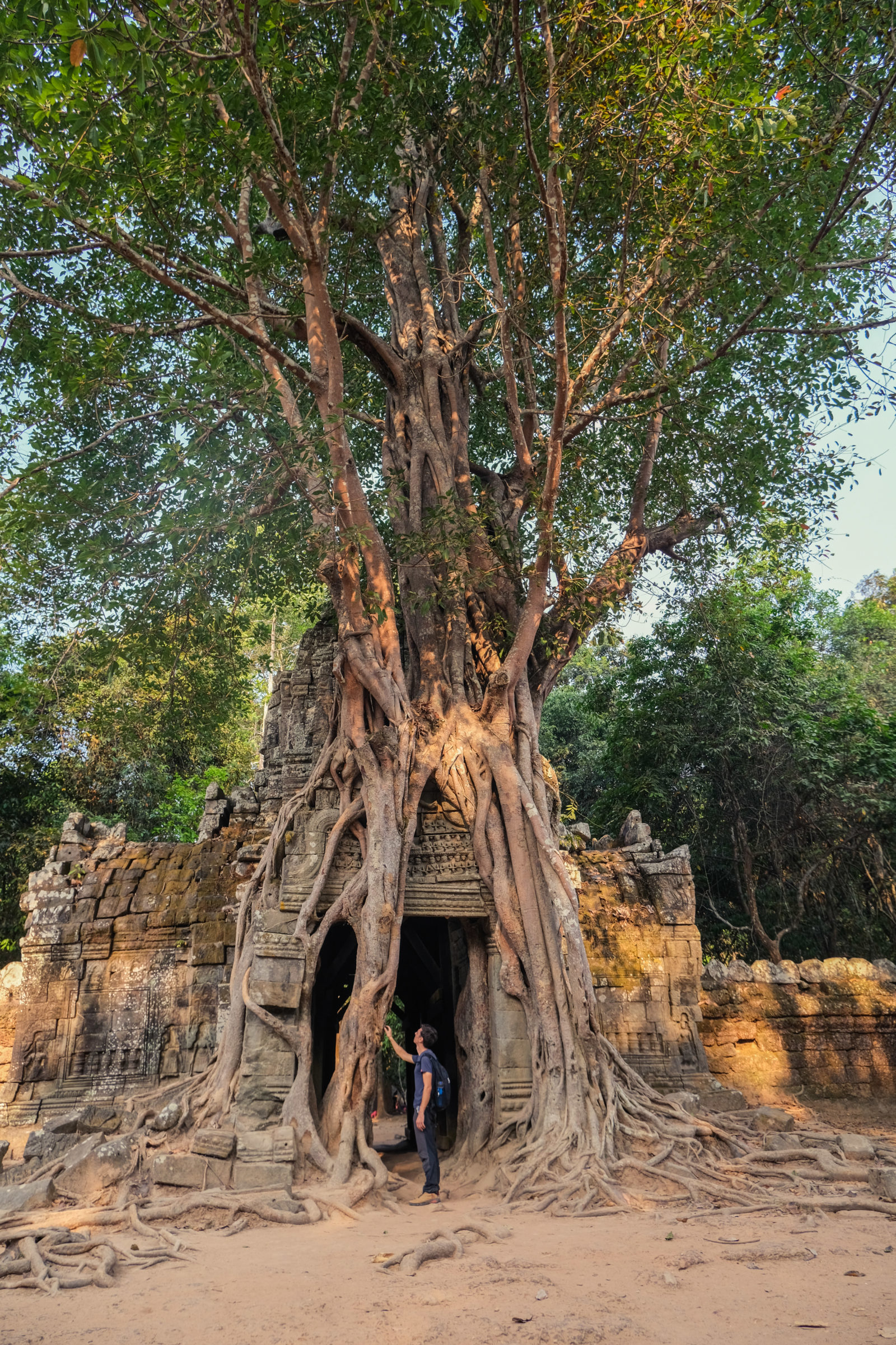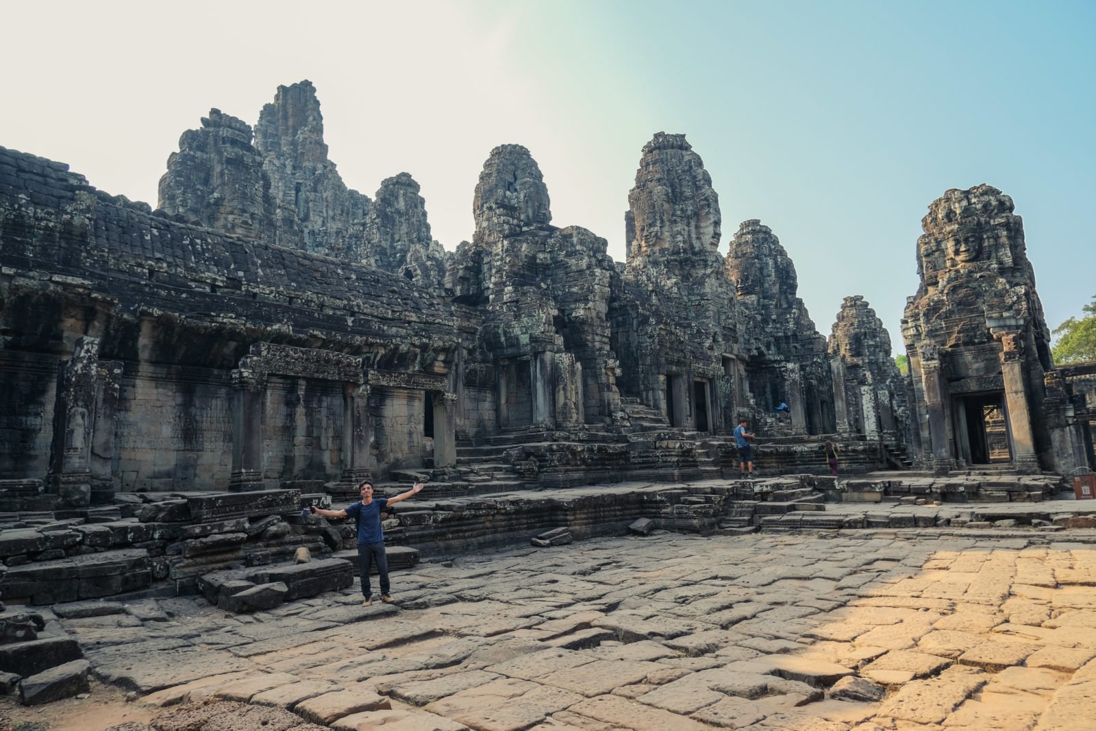 Nous avons continué avec la visite de plusieurs autres temples, une petite dizaine je dirais pour finir avec l’autre temple le plus connu: Angkor Thom avec tous ces visages de bouddha répartis sur ce site. Les temples ont été construits au temps des rois et monarques. Chacun faisait construire son temple au milieu de la forêt et beaucoup, du fait des guerres et des années passées, n’ont pas tenu le choc. Nous avons beaucoup apprécié ces visites et découvrir la façon dont la nature a repris du terrain avec ces arbres majestueux posé sur le toit d’un temple ou au milieu d’un gros mur de délimitation. La taille de ces arbres est toujours très impressionnante. Nous ne sommes pas à nos premiers arbres géant mais l’étonnement reste intacte et ce sentiment de petitesse à côté d’eux est toujours le même.