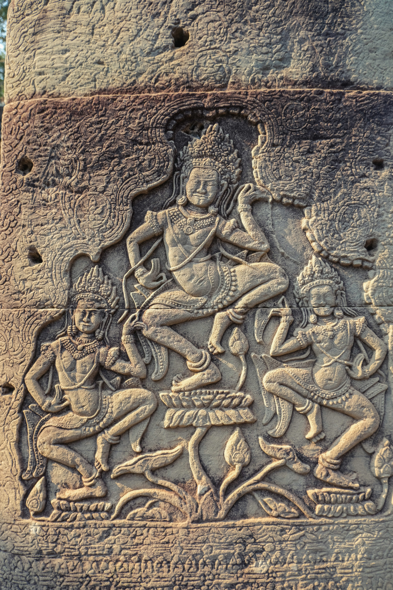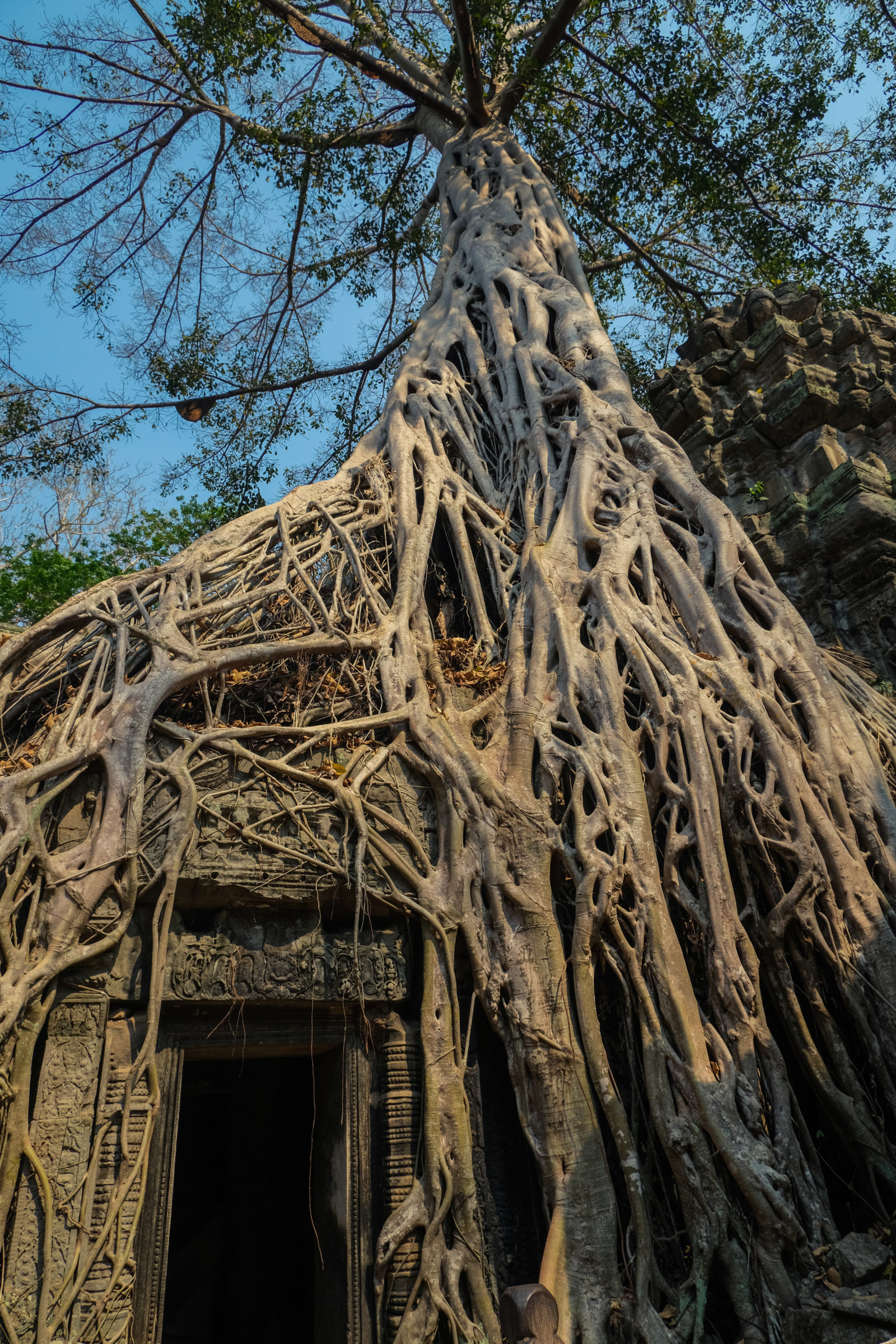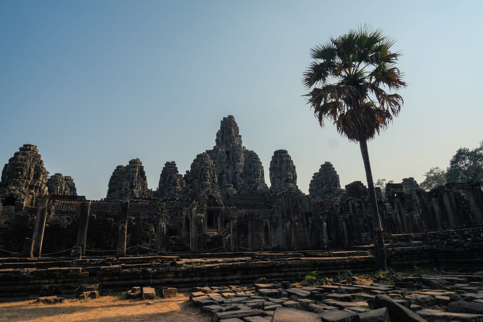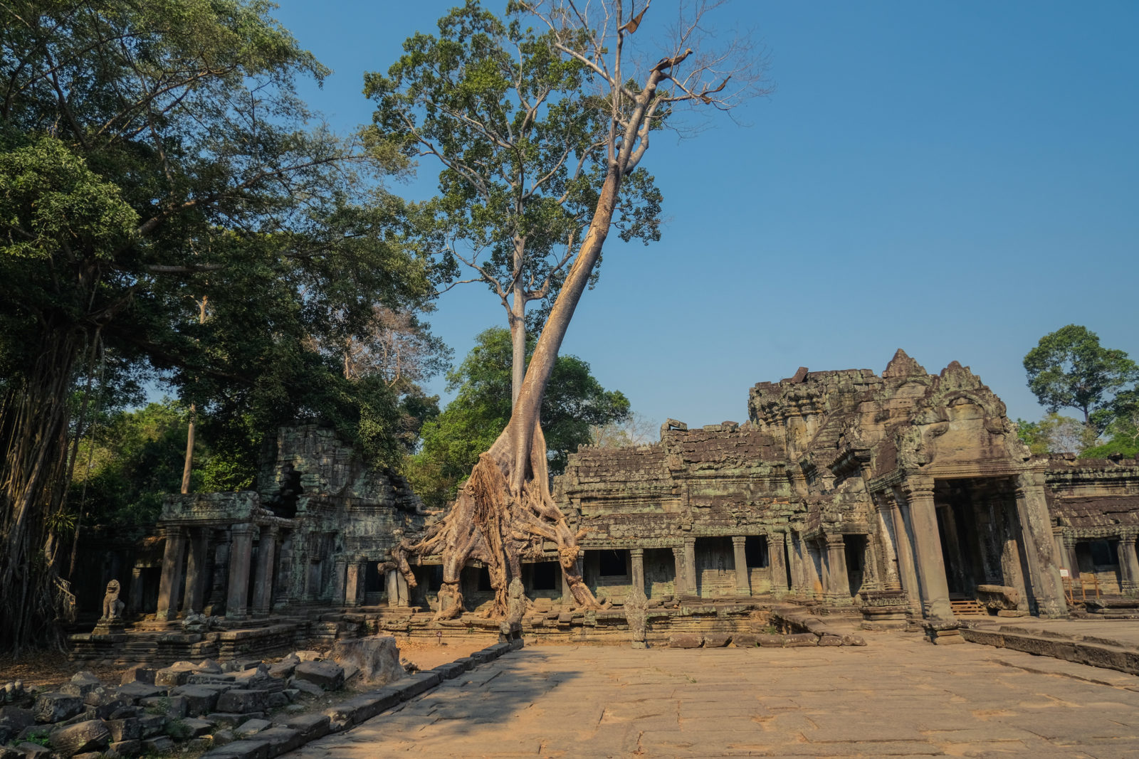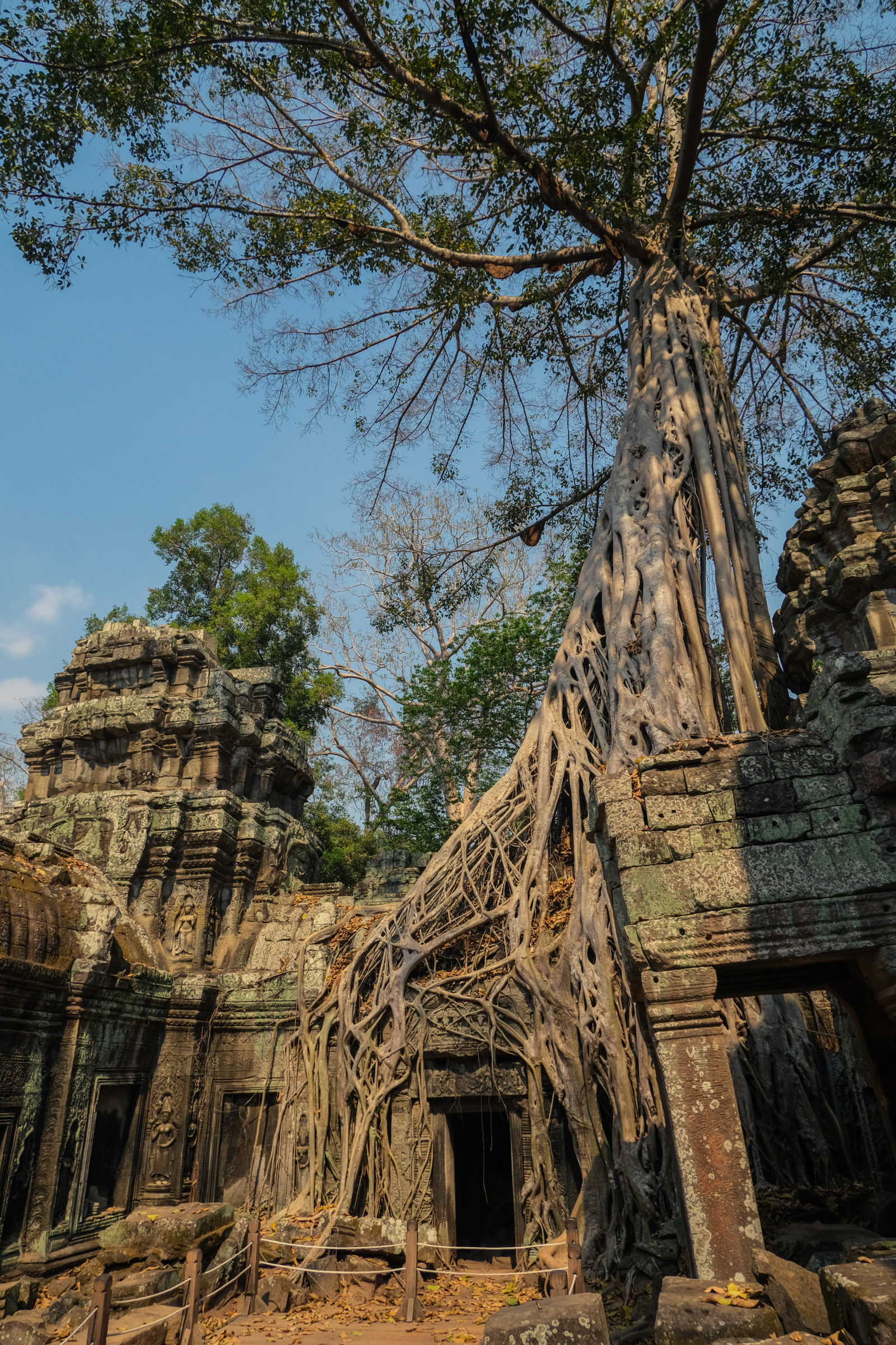Nous avons continué avec la visite de plusieurs autres temples, une petite dizaine je dirais pour finir avec l’autre temple le plus connu: Angkor Thom avec tous ces visages de bouddha répartis sur ce site. Les temples ont été construits au temps des rois et monarques. Chacun faisait construire son temple au milieu de la forêt et beaucoup, du fait des guerres et des années passées, n’ont pas tenu le choc. Nous avons beaucoup apprécié ces visites et découvrir la façon dont la nature a repris du terrain avec ces arbres majestueux posé sur le toit d’un temple ou au milieu d’un gros mur de délimitation. La taille de ces arbres est toujours très impressionnante. Nous ne sommes pas à nos premiers arbres géant mais l’étonnement reste intacte et ce sentiment de petitesse à côté d’eux est toujours le même.