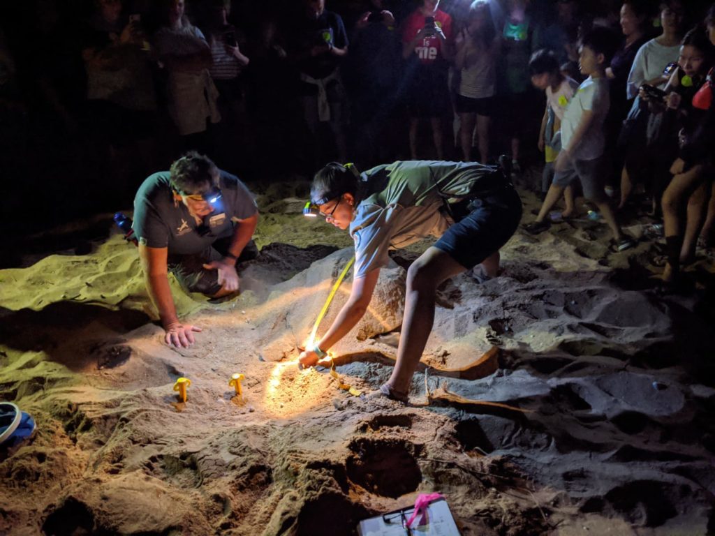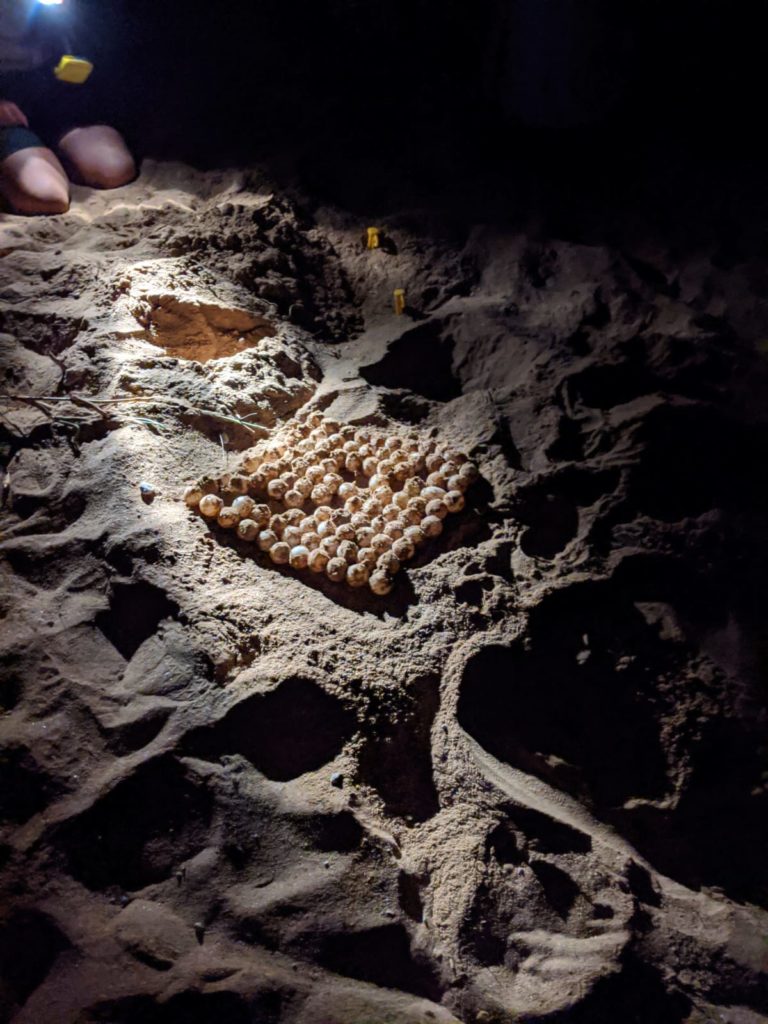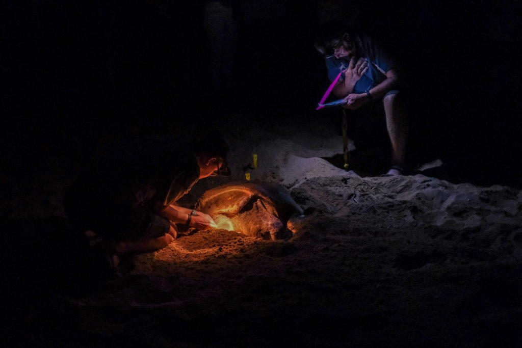 À notre arrivée au centre des tortues nous avons été accueillis par des belles chauves-souris (elles étaient assez balaise) et après avoir été présenté à notre guide nous sommes partis sur la plage. La mauvaise surprise fut d’être quasiment une cinquantaine de personne à faire cette découverte. On se marchait quand même un peu dessus et la pauvre tortue que nous avons vu s’est pris plein de flash dans la tête. Heureusement que nous n’avons eu l’autorisation de prendre des photos qu’une seule fois ! Bref, cette rencontre avec une tortue venue sur la plage pondre ses œufs était carrément folle. Lorsque nous sommes arrivés pour la voir, elle était déjà installée, son trou était fait et elle avait déjà commencé à pondre. La guide et un autre biologiste ont pris plusieurs mesures, lui ont posés une bague pour éventuellement la retrouver l’année prochaine et après qu’elle ait terminé de pondre, ils ont déplacé les œufs (un peu plus haut) pour éviter que les personnes venant sur cette plage la journée s’allongent dessus sans le savoir. Nous avons également puis suivre et regarder cette énorme tortue regagner l’océan… c’était fou de vivre cet instant.