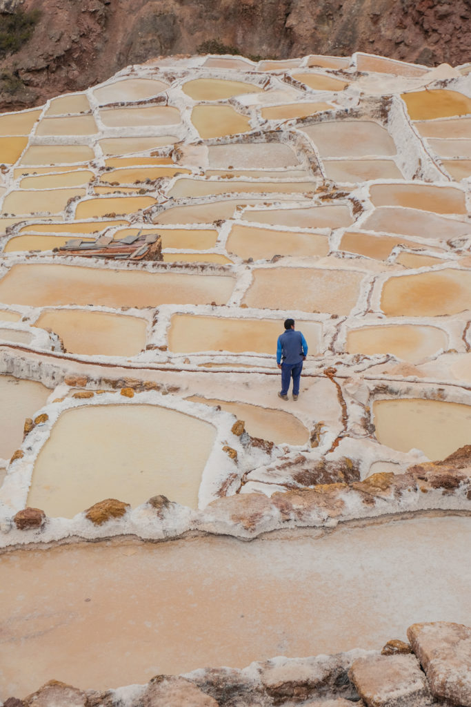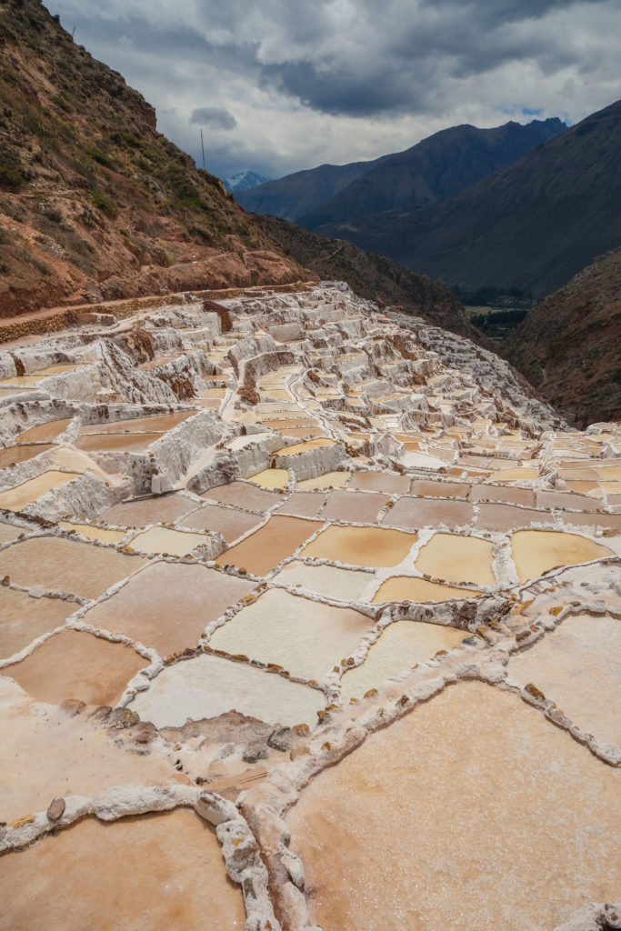 Et nous avons fini la journée avec la visite des salines de Maras. C’était assez joli et impressionnant de voir tous ces bassins de sel de couleur différente regroupés dans un trou de montagne. L’explication est qu’il existe une roche « spéciale » sur laquelle coule une petite source d’eau qui devient salée (même très salée, on l’a goûté 🤢) et qui vient finir son chemin dans ces bassins. Une fois que l’eau a été acheminée il suffit d’attendre qu’elle s’évapore pour ensuite donner du sel. Il y a plusieurs teinte de bassin car l’eau ne s’évapore pas à la même vitesse. Lorsque les bassins sont blanc, ça signifie que le sel est prêt à être récolté. Mais, dans cette saline ils produisent 3 sortes de sels : le sel pour les animaux (pour les faire grossir) ; le sel médicinal et le sel de table ou la fleur de sel. Celle-ci serait la seule à être consommable pour l’homme car sa teneur en sel est la moins élevée.
