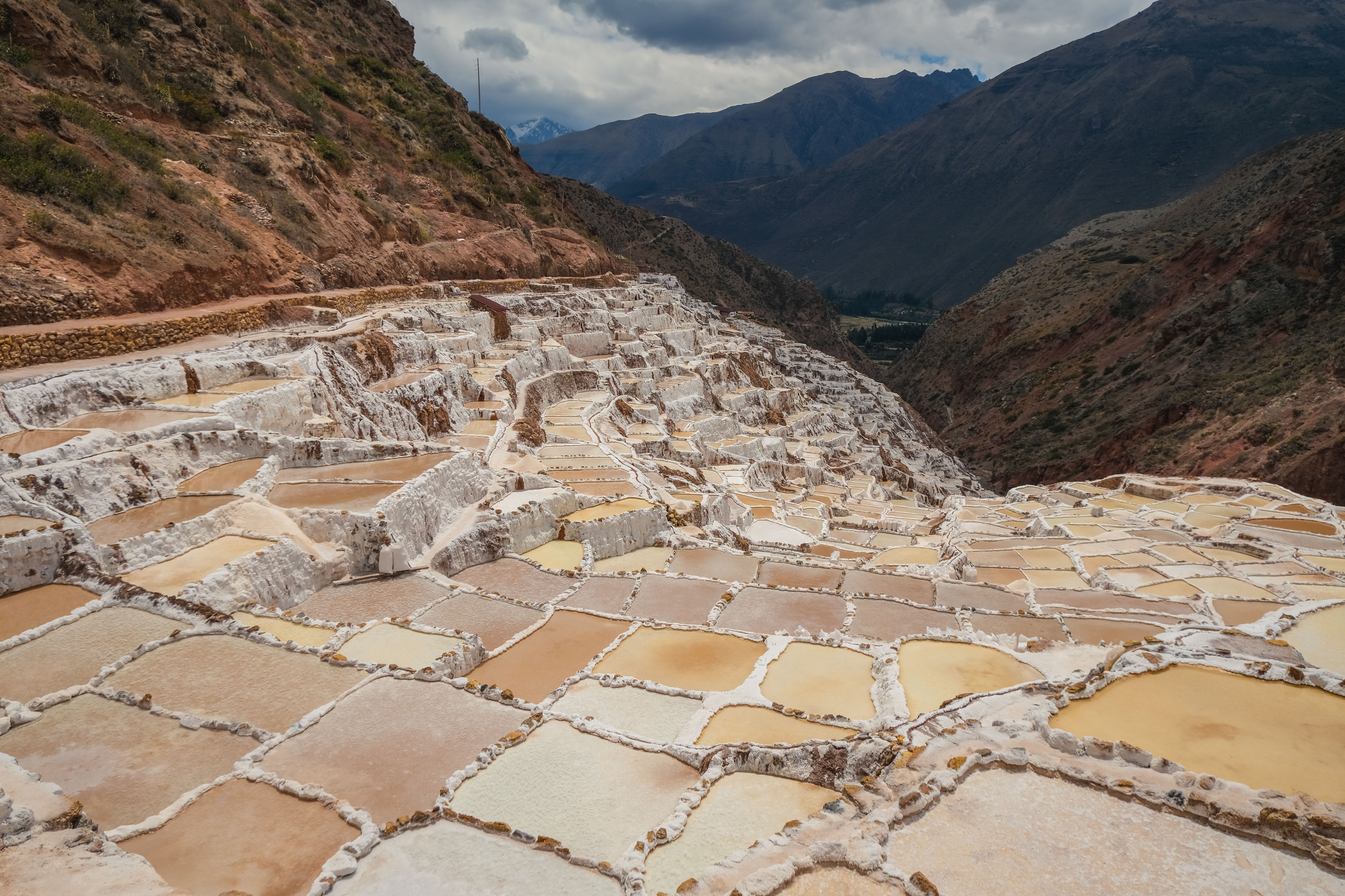 Et nous avons fini la journée avec la visite des salines de Maras. C’était assez joli et impressionnant de voir tous ces bassins de sel de couleur différente regroupés dans un trou de montagne. L’explication est qu’il existe une roche « spéciale » sur laquelle coule une petite source d’eau qui devient salée (même très salée, on l’a goûté 🤢) et qui vient finir son chemin dans ces bassins. Une fois que l’eau a été acheminée il suffit d’attendre qu’elle s’évapore pour ensuite donner du sel. Il y a plusieurs teinte de bassin car l’eau ne s’évapore pas à la même vitesse. Lorsque les bassins sont blanc, ça signifie que le sel est prêt à être récolté. Mais, dans cette saline ils produisent 3 sortes de sels : le sel pour les animaux (pour les faire grossir) ; le sel médicinal et le sel de table ou la fleur de sel. Celle-ci serait la seule à être consommable pour l’homme car sa teneur en sel est la moins élevée.
