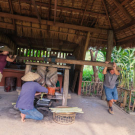 13 : la meilleure étape, la dégustation !! Et on s’est régalé, tout était très bon et en prime on a eu le droit de confectionner un jus de canne à sucre auquel on a ajouté un jus de citron vert, c’était divin ! Cette après-midi aura été canon. Les fermiers et autres paysans travaillant dans cet endroit ont été adorables et très accueillant. Nous avons commencé notre visite avec un groupe de touristes américains mais ils se sont arrêtés à l’étape numéro 5 ces fainéasses (tant mieux pour nous), ensuite nous avons poursuivi que tous les deux avec notre guide jardinier. Dans cette ferme il y a 7 familles qui travaillent tous les jours de l’année. Le guide nous expliquait avoir quand même deux semaines de vacances par an. En dehors de cette toute petite période de repos, il travaille 7 jours sur 7, du levé au couché du soleil. Sachant que le job est quasi exclusivement dehors donc sous cette chaleur, avec des conditions de travail pas toujours facile (les jambes recouverte pour partie dans la boue, c’est agréable mais physique). Et, avec des machines archaïques qui sont lourdes et qui demandent, pour réaliser seulement une étape, plusieurs heures de travail consécutif où les mouvements sont toujours les mêmes. Chapeau ! Je ne dégusterait plus le riz de la même manière.