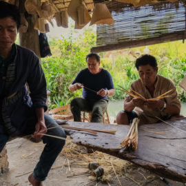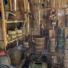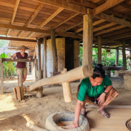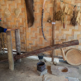 C’était vraiment sympa ! En continuant plus loin dans le village, une autre dame nous a accueilli en habit traditionnel (juste pour le folklore et les touristes car en vrai ils sont habillés comme nous) et nous a montré les différents outils leurs permettant de chasser, de transformer le riz ou le maïs en poudre pour les utiliser comme farine par exemple. C’est du vrai travail manuel et comme le riz est la base de leur alimentation, les étapes d’égrainage (du riz) et de broyage sont réalisées quotidiennement. C’est intéressant mais on voit que c’est un « circuit » très touristique ! Après nous c’est pas moins de vingt personnes qui sont arrivées pour faire la même chose.