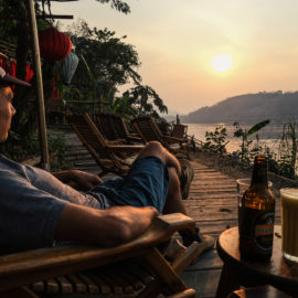 Voilà, notre croisière touchait à sa fin, le bateau nous a fait débarquer dans la ville de Luang Prabang non loin de notre auberge où nous sommes allé déposer nos affaires. Ensuite nous sommes allé faire un tour dans la rue principale de la vieille ville, nous avons englouti un sandwich et récupéré des pâtisseries (oui oui, des pâtisseries !! Je vais le dire assez souvent, cette ville est un petit paradis notamment parce qu’il y a du pain, des pâtisseries et des viennoiseries) avant de nous poser sur la terrasse de l’auberge. Un p’tit gars était tout seul assis à côté de nous. Nous avons pu faire sa connaissance et c’est en écoutant son récit de voyage qu’on s’est rendu compte que nous ne sommes pas de vrais voyageurs ! Le mec (un allemand, on en croise beaucoup) est parti il y a deux ans avec son vélo. Il a commencé en Nouvelle Zélande, puis en Amérique du Sud et en Asie. Il vit tranquillement au rythme de ses envies et ne se prend pas du tout la tête ! On a échangé nos impressions sur nos voyages et expériences vécues. C’était sympa d’avoir la vision d’un autre voyageur sur des pays que nous avions aussi visités ! C’était une chouette rencontre.