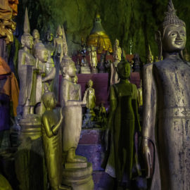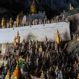 Nous continuions notre croisière sur le Mékong avec au programme de l’après-midi, visite de la grotte de Pak Ou. Cette dernière est connue pour ses 5000 statues de bouddha disposées un peu partout et répartis dans les deux chambres du haut et du bas. Je m’attendais à quelque chose de vraiment impressionnant car quasiment tous les guides, site internet ou blog que j’ai pu lire en parlaient. Ça me paraissait être un véritable incontournable des alentours de Luang Prabang. En réalité je n’dirais pas ça ! Pour nous c’était plus un trou dans la roche décoré de bouddha donc payer une entrée pour visiter ce site, bif bof ! Ensuite nous avons rejoins un petit village situé en bord de rive où les habitants produisent du « whisky ». C’est évidemment pas celui qu’on connaît mais c’était sympa d’aller voir comment ils produisent cet alcool local. On a aussi pu faire une dégustation que je n’ai pas vraiment apprécié contrairement à Tom ! Vous avez vu c’est sympa les serpents et scorpions dans les bouteilles, huuuum ! 🙂
