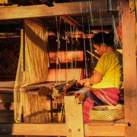 Outre cette ville très agréable, Luang Prabang offre aussi un accès à une belle campagne située aux alentours. Pour découvrir ces nouveaux joyaux de la nature, nous avons pris les services d’un tuk tuk à la journée pour aller voir le village de Hmong puis les cascades de Kuang Si. La route ou plutôt le chemin que nous empruntions était fait de nid de poule et de cailloux. C’était poussiéreux et ça secouait grave mais après une bonne demi-heure de trajet nous arrivions sur notre première destination. D’abord nous avons fait une halte chez un couple qui travaille le coton. Ils fabriquent toute sorte de vêtement qui sont très sympa ! La dame nous a expliqué, montré et installé à côté d’elle pour essayer chacune des étapes du travail du coton.
