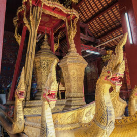 Notre premier jour à Luang Prabang me fera confirmer mon impression de la veille : j’adore cette ville. L’ambiance qui y règne a fait son p’tit effet, les maisons sont mignonnes, le Mékong qui borde la ville et qui nous incite à suivre les jolies rives… Pour cette journée nous n’avions rien prévu de spécial à part découvrir les alentours. Ça nous a emmené vers un temple. Même si on s’était dit qu’on les mettrait désormais de côté (je pense qu’on a fait une overdose de temple en Thaïlande), on s’est laissé tenter. Il était sympa. À l’intérieur d’une des annexes se trouve le char funéraire de la famille royale. Voilà, rien de bien foufou ! On a continué à découvrir les beautés de cette ville et les petites boutiques de madames qui fabriquent tout plein de chose en bambou (paniers pour cuire le riz et pour le présenter à table, des pailles, des chapeaux…) et qui tissent pas mal de truc sympa (vêtement, sac, écharpe même si ça doit pas leur servir souvent ici, doudou, plaid…). C’est vraiment tout joli ce qu’elles font ! Là j’ai eu envie d’avoir une grande valise pour leur acheter toutes ces belles choses.