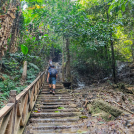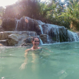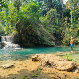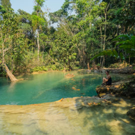 En faisant le tour du village on se rend compte du peu de chose que les Hmong possèdent. L’intérieur des maisons est vide, ils mangent à même le sol avec leur poule à leur côté. C’est vraiment triste et malheureusement on ne peut pas acheter de boui boui à chacune des dames, ça faisait mal au cœur ! Une fois le village visité nous avons rejoint les cascades. La chaleur était bien présente et on avait hâte de nous baigner mais avant nous sommes monté tout en haut du site. On s’est vite rendu compte que l’eau manquait cruellement. Les bassins n’étaient pas vraiment rempli et l’eau qui coulait des cascades ne représentait qu’un mince filet. La grande cascade située à mi-chemin entre le haut et bas du site était vraiment jolie, la couleur de l’eau bleu lacté est très particulière à cet endroit car c’est le jeu de la lumière et la couleur de la terre qui donne cette combinaison magique. Après s’être émerveillé, on avons enfilé nos maillots pour nous jeter à l’eau. En vrai, on ne s’est pas vraiment jeté car la température n’est pas très élevée. Peut-être 15 degrés maximum, c’était très rafraîchissant et en prime on a même eu droit à un nettoyage de pied grâce aux poissons qui venaient nous grignoter les orteils !! C’était une bonne après-midi passé là bas. À notre retour à Luang Prabang, nous nous sommes posé dans un bar-restau très chouette, situé au bord du Mékong et avec une déco très singulière et sympathique ma foi.