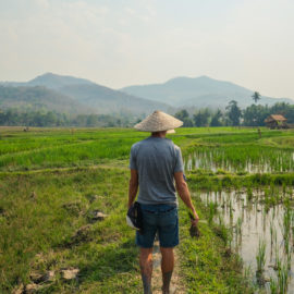 Pour plus de légèreté dans cette journée, nous sommes partis en direction d’une ferme où la culture du riz est reine. Nous avions prévu la visite des rizières et l’apprentissage des différentes étapes de cette culture et là nous n’avons pas été déçu !! C’était vraiment très très bien et on a vite compris pourquoi les laotiens ne sont pas bien gros, pour eux la salle de sport c’est tous les jours dans les champs ! C’est avec le fermier puis le jardinier que nous avons appris les 13 étapes pour faire du riz. Je vais essayer de me souvenir de chacune d’elle :