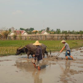 3 : travailler la terre à l’aide de Suzanne (la belle bufflone d’eau) où les pousses seront plantées