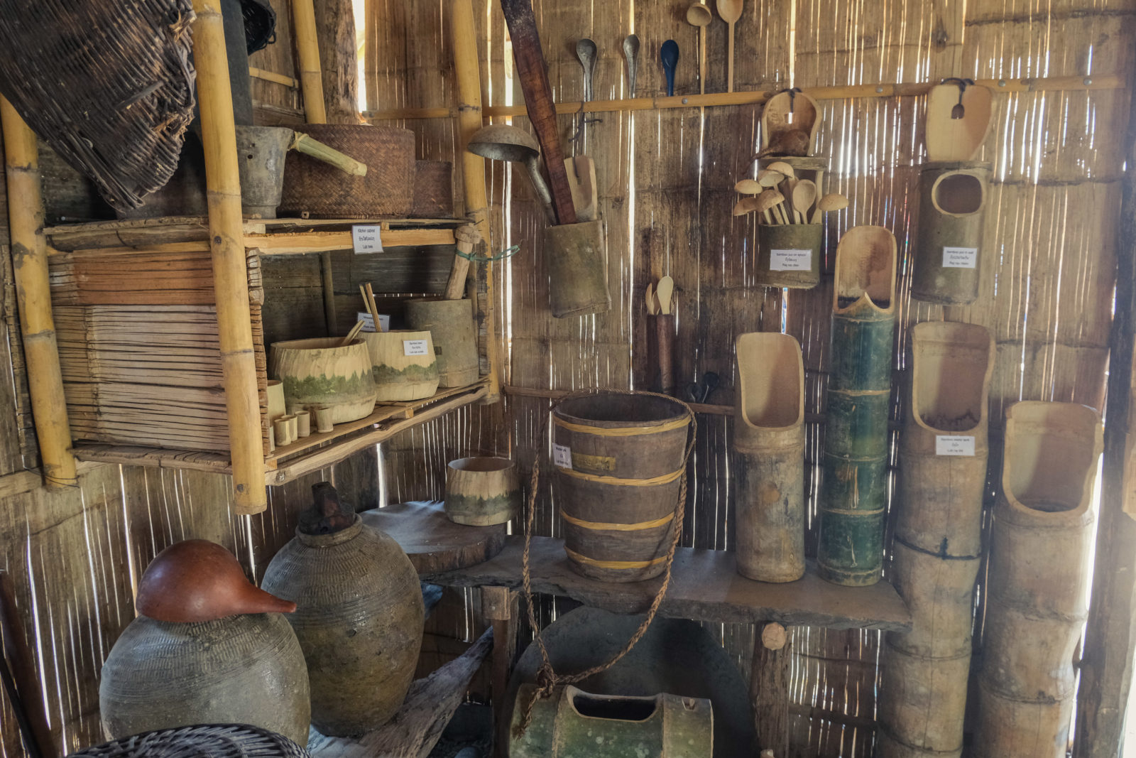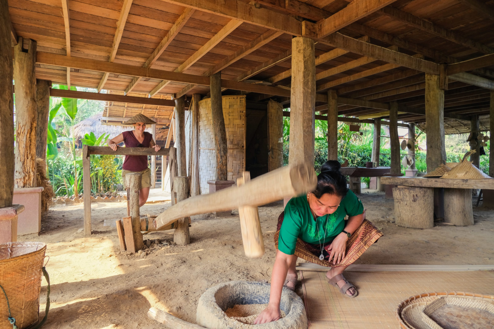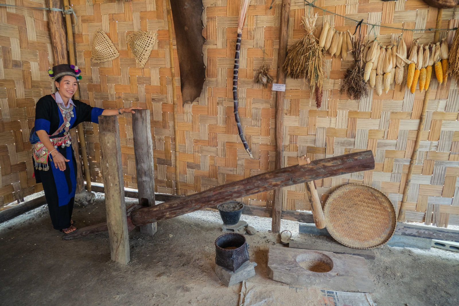 C’était vraiment sympa ! En continuant plus loin dans le village, une autre dame nous a accueilli en habit traditionnel (juste pour le folklore et les touristes car en vrai ils sont habillés comme nous) et nous a montré les différents outils leurs permettant de chasser, de transformer le riz ou le maïs en poudre pour les utiliser comme farine par exemple. C’est du vrai travail manuel et comme le riz est la base de leur alimentation, les étapes d’égrainage (du riz) et de broyage sont réalisées quotidiennement. C’est intéressant mais on voit que c’est un « circuit » très touristique ! Après nous c’est pas moins de vingt personnes qui sont arrivées pour faire la même chose.