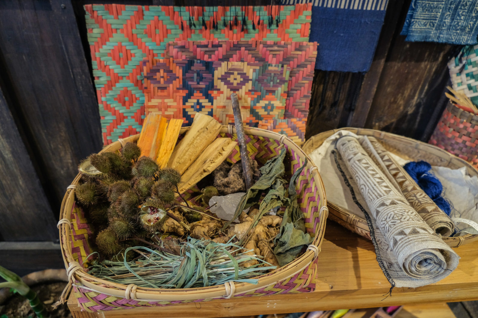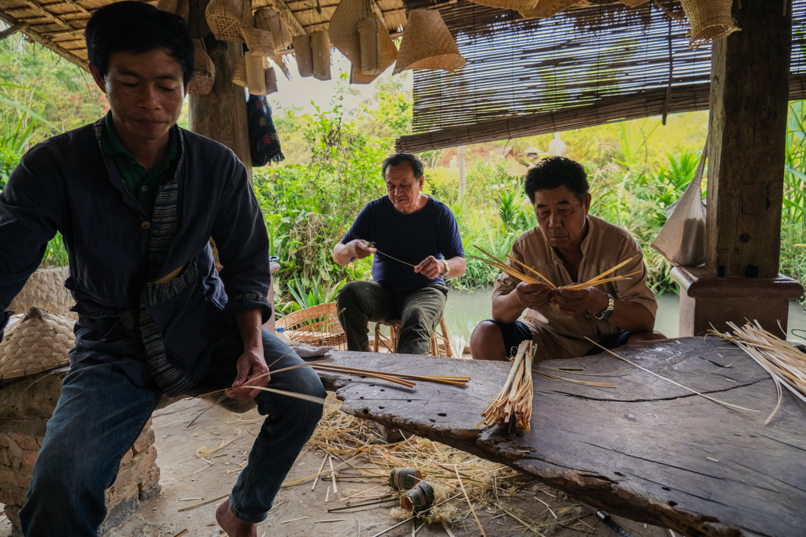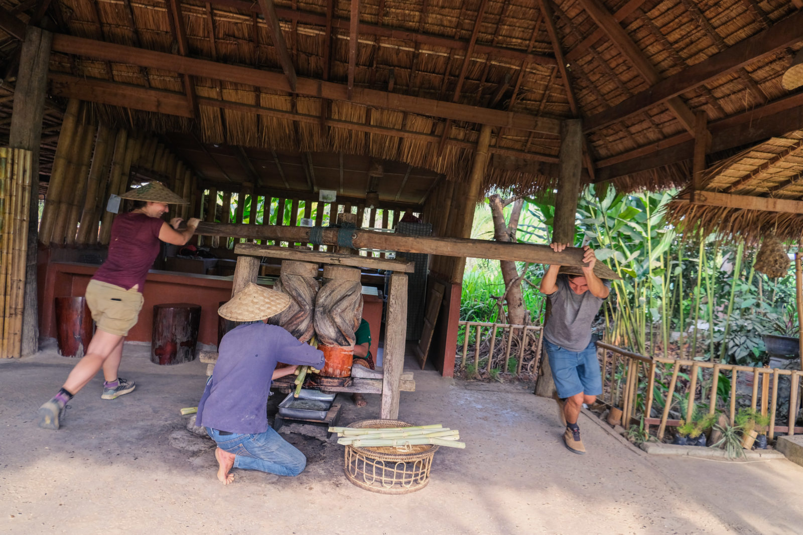 C’était vraiment sympa ! En continuant plus loin dans le village, une autre dame nous a accueilli en habit traditionnel (juste pour le folklore et les touristes car en vrai ils sont habillés comme nous) et nous a montré les différents outils leurs permettant de chasser, de transformer le riz ou le maïs en poudre pour les utiliser comme farine par exemple. C’est du vrai travail manuel et comme le riz est la base de leur alimentation, les étapes d’égrainage (du riz) et de broyage sont réalisées quotidiennement. C’est intéressant mais on voit que c’est un « circuit » très touristique ! Après nous c’est pas moins de vingt personnes qui sont arrivées pour faire la même chose.