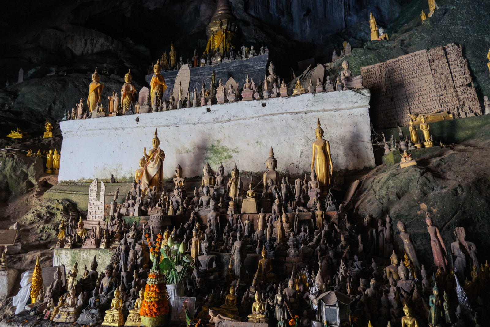 Nous continuions notre croisière sur le Mékong avec au programme de l’après-midi, visite de la grotte de Pak Ou. Cette dernière est connue pour ses 5000 statues de bouddha disposées un peu partout et répartis dans les deux chambres du haut et du bas. Je m’attendais à quelque chose de vraiment impressionnant car quasiment tous les guides, site internet ou blog que j’ai pu lire en parlaient. Ça me paraissait être un véritable incontournable des alentours de Luang Prabang. En réalité je n’dirais pas ça ! Pour nous c’était plus un trou dans la roche décoré de bouddha donc payer une entrée pour visiter ce site, bif bof ! Ensuite nous avons rejoins un petit village situé en bord de rive où les habitants produisent du « whisky ». C’est évidemment pas celui qu’on connaît mais c’était sympa d’aller voir comment ils produisent cet alcool local. On a aussi pu faire une dégustation que je n’ai pas vraiment apprécié contrairement à Tom ! Vous avez vu c’est sympa les serpents et scorpions dans les bouteilles, huuuum ! 🙂