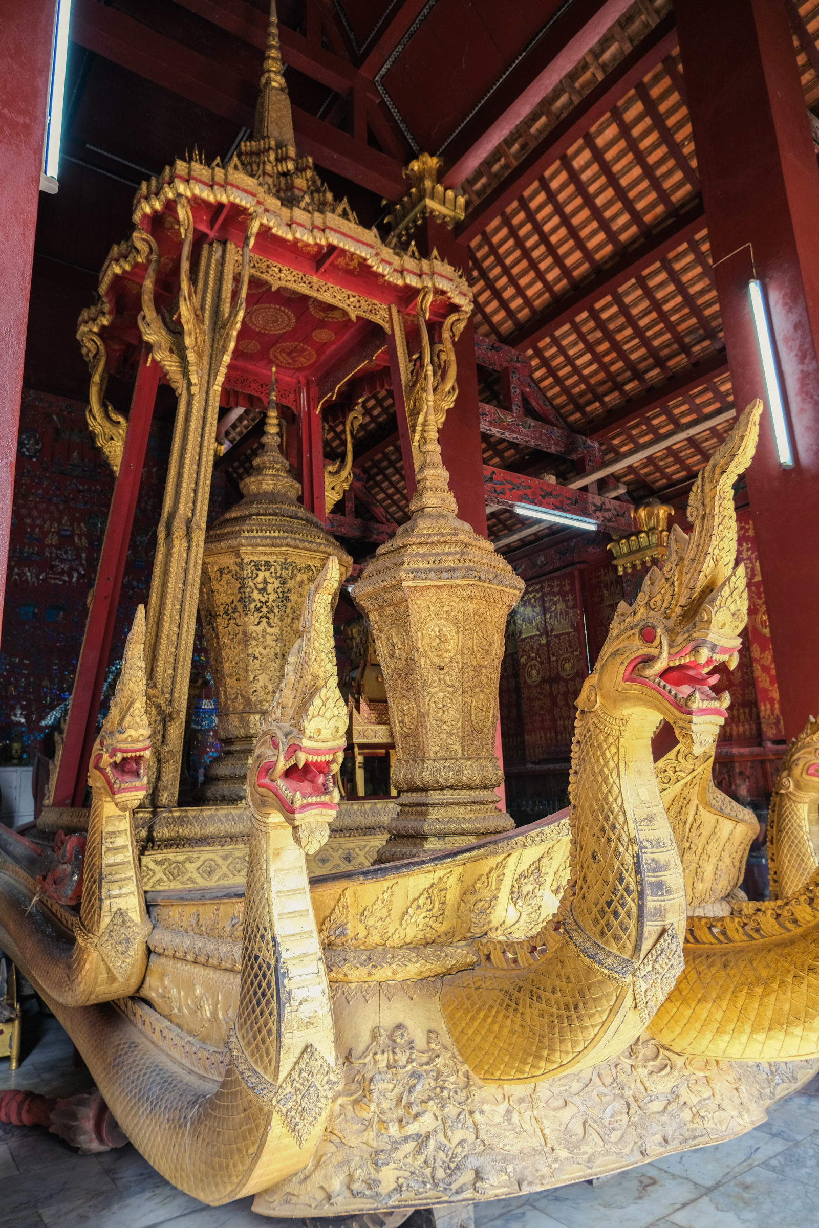 Notre premier jour à Luang Prabang me fera confirmer mon impression de la veille : j’adore cette ville. L’ambiance qui y règne a fait son p’tit effet, les maisons sont mignonnes, le Mékong qui borde la ville et qui nous incite à suivre les jolies rives… Pour cette journée nous n’avions rien prévu de spécial à part découvrir les alentours. Ça nous a emmené vers un temple. Même si on s’était dit qu’on les mettrait désormais de côté (je pense qu’on a fait une overdose de temple en Thaïlande), on s’est laissé tenter. Il était sympa. À l’intérieur d’une des annexes se trouve le char funéraire de la famille royale. Voilà, rien de bien foufou ! On a continué à découvrir les beautés de cette ville et les petites boutiques de madames qui fabriquent tout plein de chose en bambou (paniers pour cuire le riz et pour le présenter à table, des pailles, des chapeaux…) et qui tissent pas mal de truc sympa (vêtement, sac, écharpe même si ça doit pas leur servir souvent ici, doudou, plaid…). C’est vraiment tout joli ce qu’elles font ! Là j’ai eu envie d’avoir une grande valise pour leur acheter toutes ces belles choses.