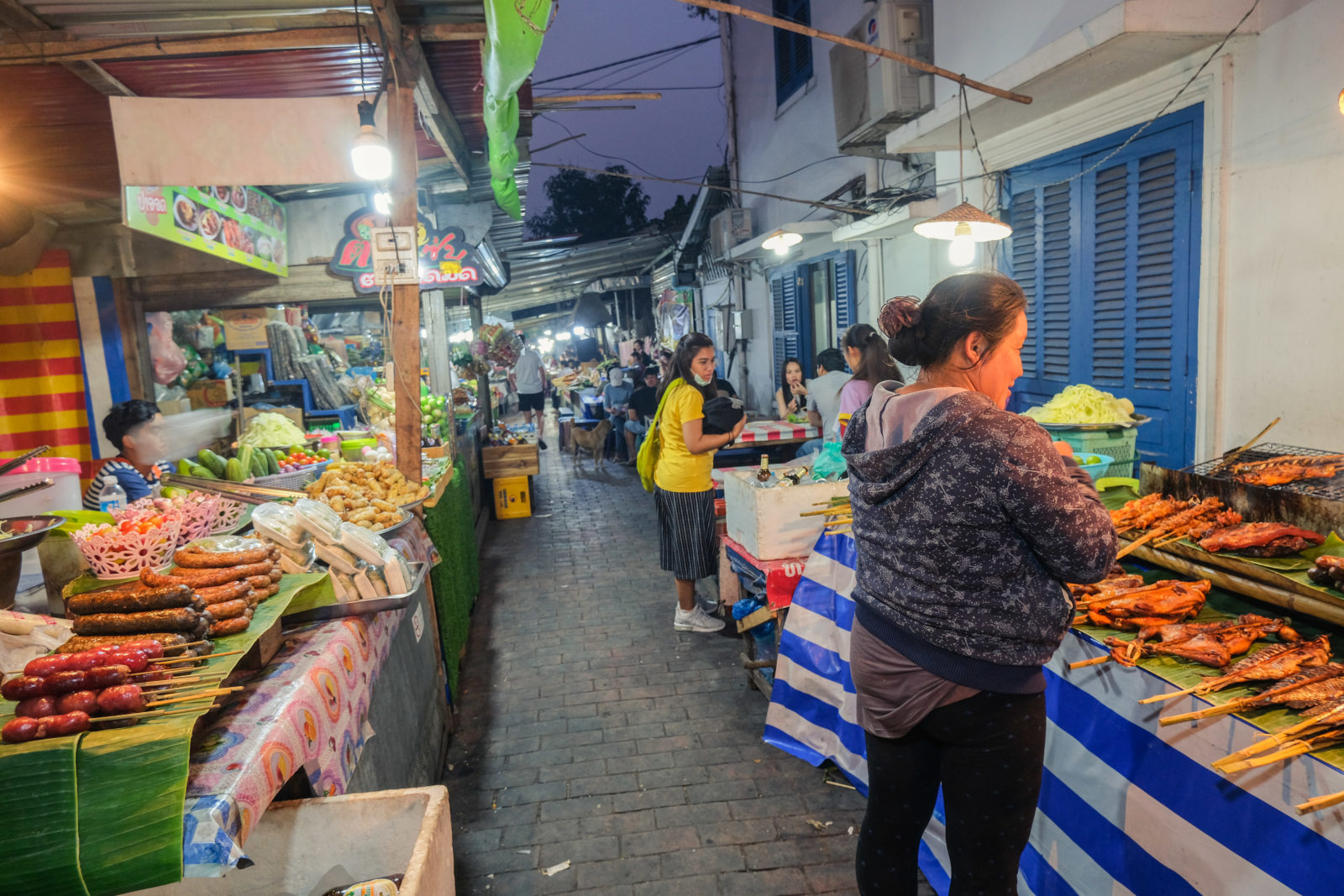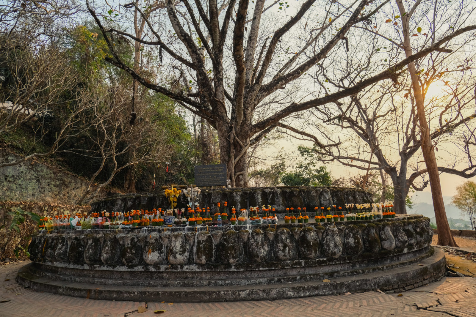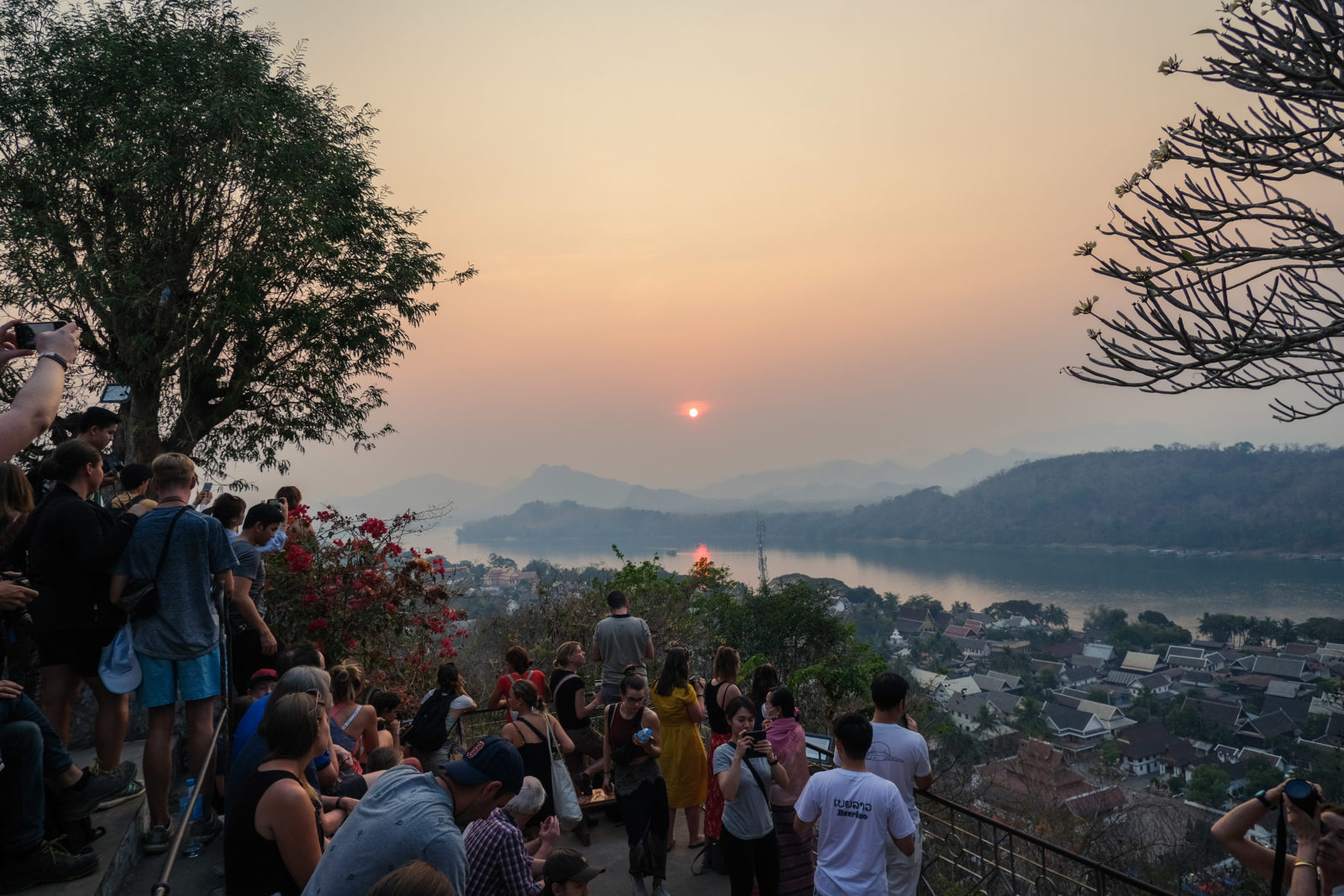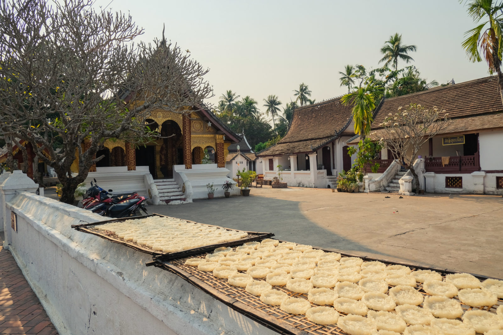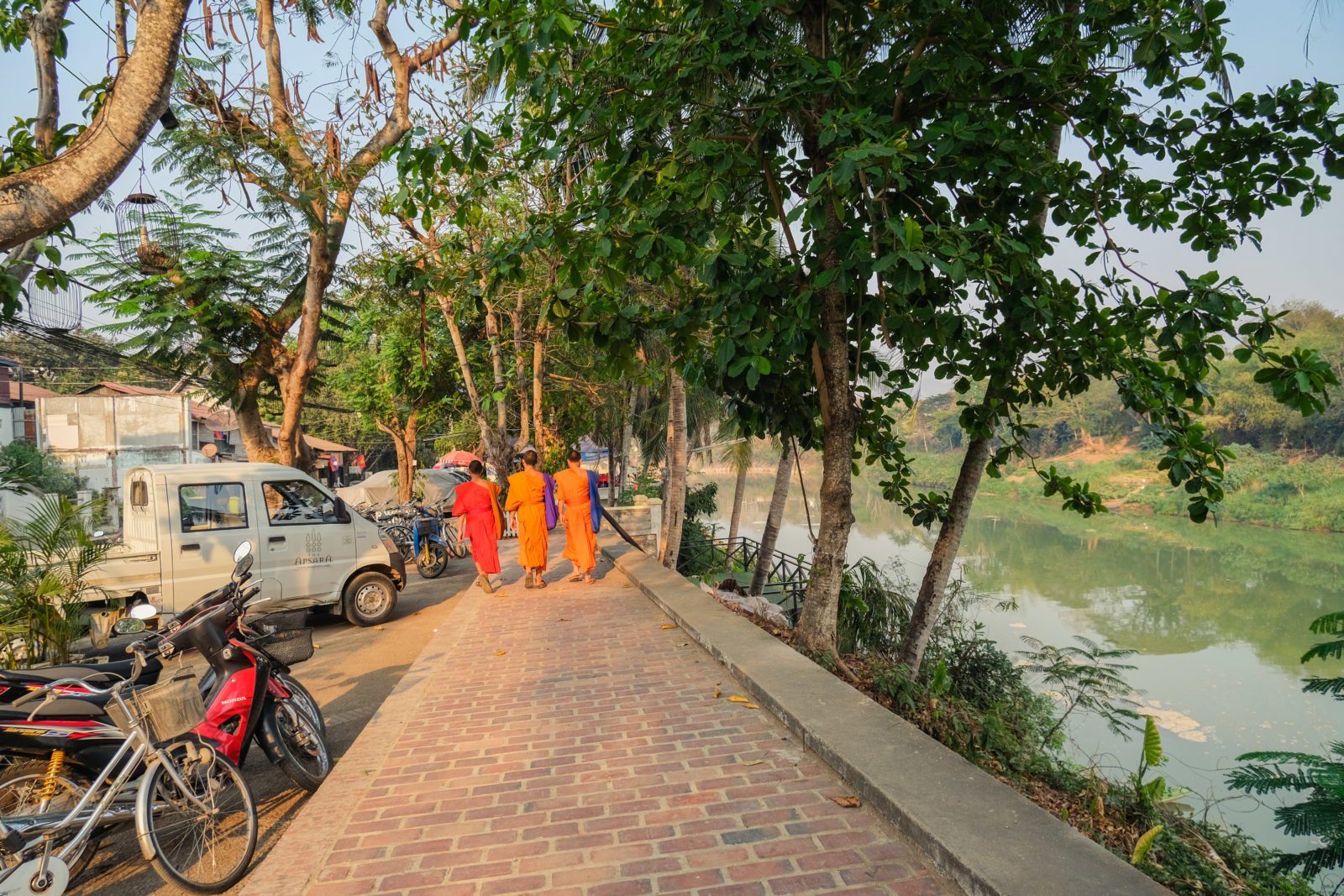 Ce matin là je me suis levée très tôt pour aller découvrir le rituel appelé « lak bat » qui a lieu chaque matin dans les rues de Luang Prabang. C’est vers 5h15 que je suis arrivée (Tom est resté au lit, c’était beaucoup trop tôt pour lui 😊) au niveau de la rue principale de la ville pour observer l’une des pratiques bouddhistes. C’est au petit matin que les moines et novices (les plus jeunes) défilent dans les rues pour récolter les offrandes des locaux et des touristes souhaitant participer à ce rituel. Avant que les moines passent, des femmes sont venues installer des sièges le long du trottoir. Ces derniers ont été investis par des locaux (souvent des femmes) mais aussi beaucoup de touristes. Les offrandes données servent d’abord à nourrir les moines et à ce que ces derniers prient pour les offrants. Dans leur panier les moines recueillent des boulettes de riz collant (ce qu’ils vont pouvoir aller manger ensuite), de l’eau, de l’argent et des petits paquets en feuille de bananier (qui doivent sûrement renfermer quelque chose à manger). Ce n’est que vers 6h que des dizaines de moines sont passés recueillir l’aumône avant de regagner l’un des temple situé aux alentours. J’étais curieuse de voir ce rituel sur lequel je ne m’étais volontairement pas trop renseigné pour observer par moi-même et tenter de le comprendre à ma façon. Sauf que j’ai été très déçu car forcément d’autres touristes étaient là mais ils ne cherchaient pas vraiment à comprendre ce qu’il se passait. Ils étaient surtout là pour le folklore et évidemment certains n’ont pas su respecter la cérémonie en se postant à 30cm des moines pour les photographier. Après avoir regardé les différents passages de moine je suis reparti vers l’auberge un peu dégoûté.