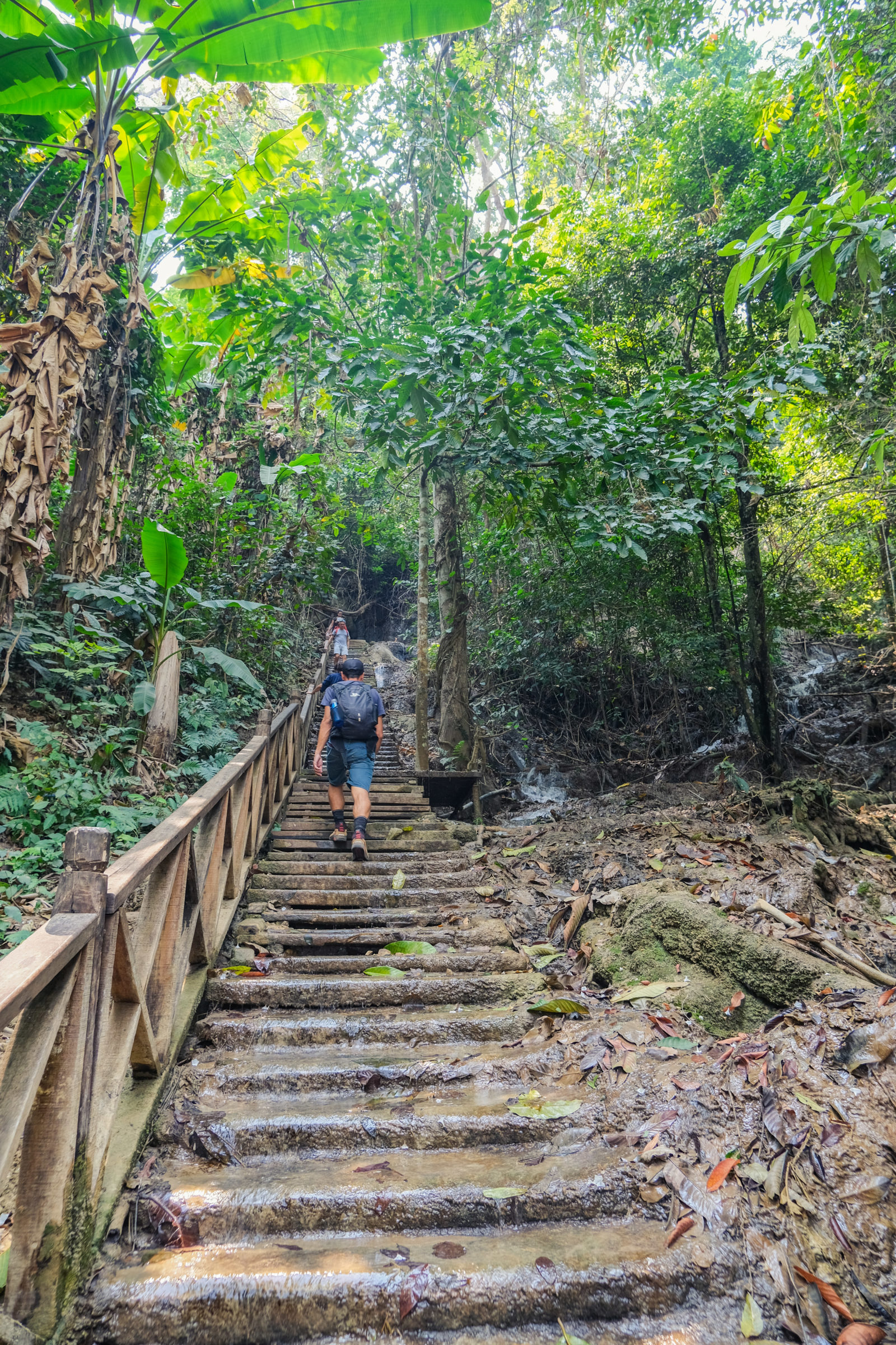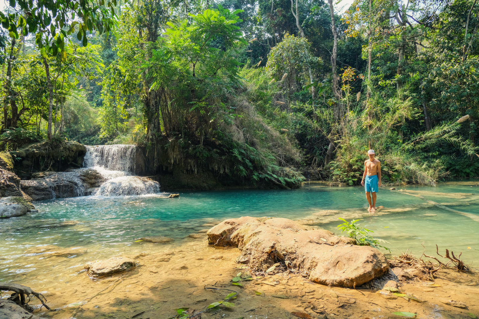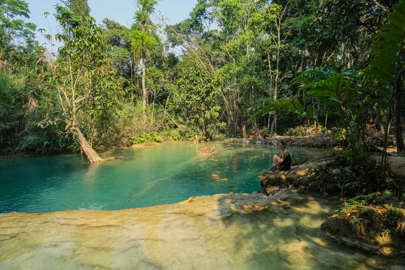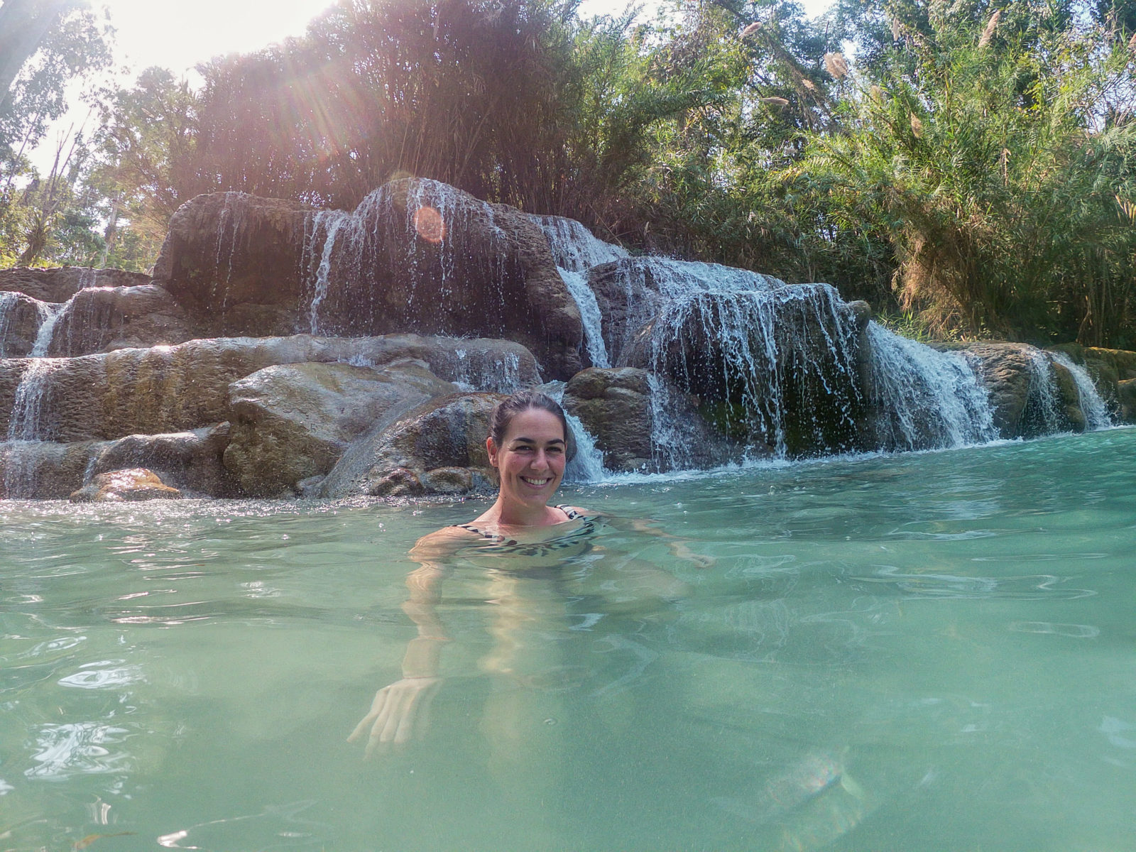 En faisant le tour du village on se rend compte du peu de chose que les Hmong possèdent. L’intérieur des maisons est vide, ils mangent à même le sol avec leur poule à leur côté. C’est vraiment triste et malheureusement on ne peut pas acheter de boui boui à chacune des dames, ça faisait mal au cœur ! Une fois le village visité nous avons rejoint les cascades. La chaleur était bien présente et on avait hâte de nous baigner mais avant nous sommes monté tout en haut du site. On s’est vite rendu compte que l’eau manquait cruellement. Les bassins n’étaient pas vraiment rempli et l’eau qui coulait des cascades ne représentait qu’un mince filet. La grande cascade située à mi-chemin entre le haut et bas du site était vraiment jolie, la couleur de l’eau bleu lacté est très particulière à cet endroit car c’est le jeu de la lumière et la couleur de la terre qui donne cette combinaison magique. Après s’être émerveillé, on avons enfilé nos maillots pour nous jeter à l’eau. En vrai, on ne s’est pas vraiment jeté car la température n’est pas très élevée. Peut-être 15 degrés maximum, c’était très rafraîchissant et en prime on a même eu droit à un nettoyage de pied grâce aux poissons qui venaient nous grignoter les orteils !! C’était une bonne après-midi passé là bas. À notre retour à Luang Prabang, nous nous sommes posé dans un bar-restau très chouette, situé au bord du Mékong et avec une déco très singulière et sympathique ma foi.