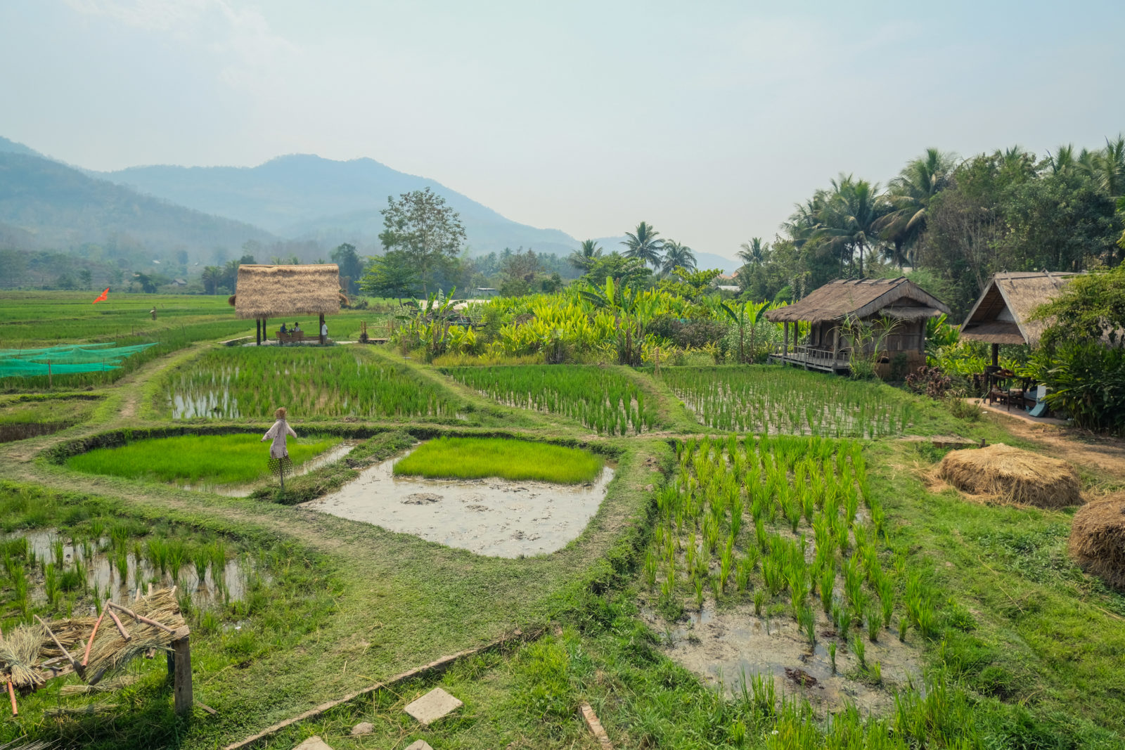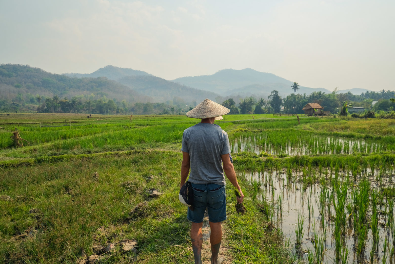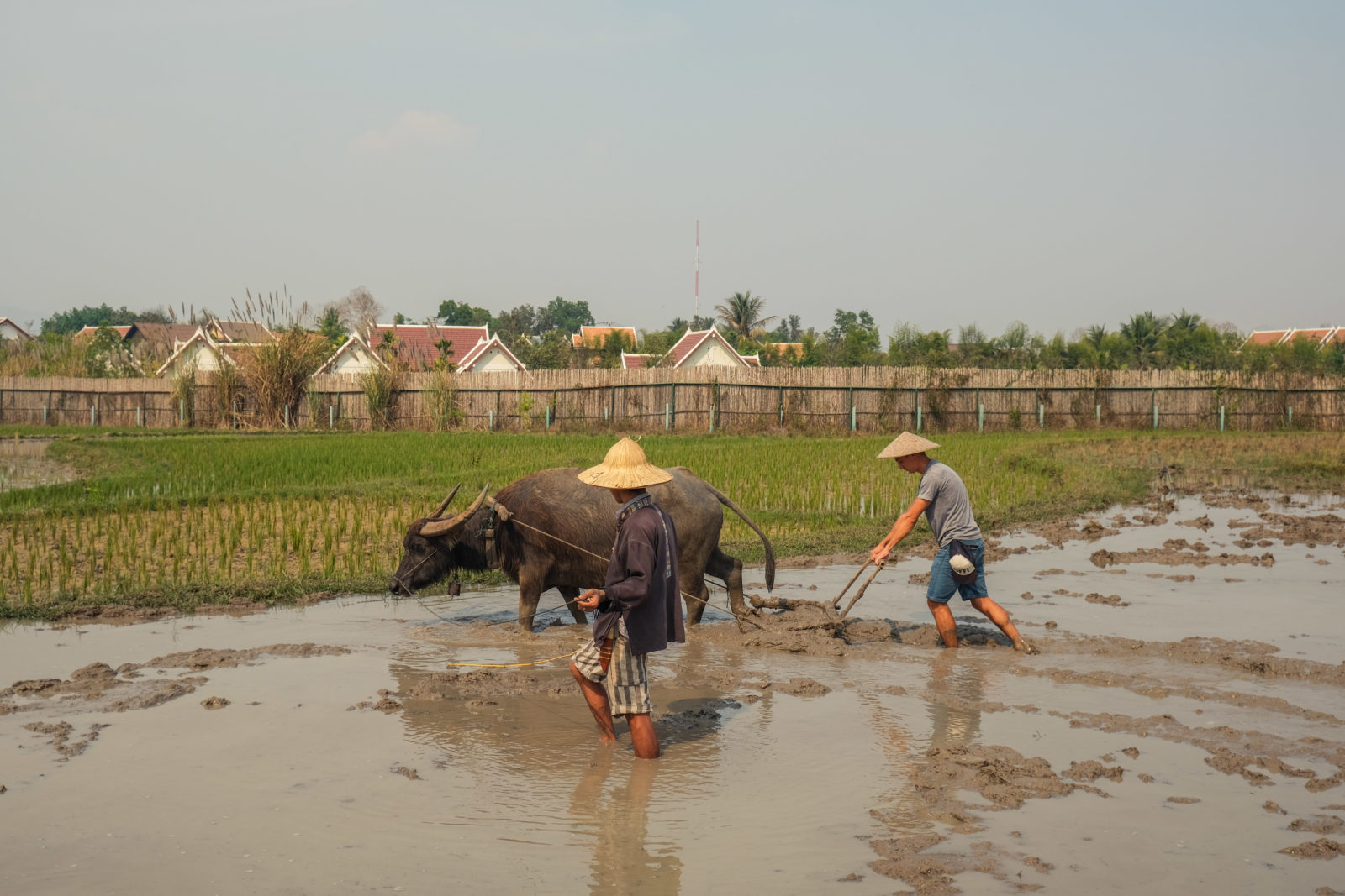 Pour plus de légèreté dans cette journée, nous sommes partis en direction d’une ferme où la culture du riz est reine. Nous avions prévu la visite des rizières et l’apprentissage des différentes étapes de cette culture et là nous n’avons pas été déçu !! C’était vraiment très très bien et on a vite compris pourquoi les laotiens ne sont pas bien gros, pour eux la salle de sport c’est tous les jours dans les champs ! C’est avec le fermier puis le jardinier que nous avons appris les 13 étapes pour faire du riz. Je vais essayer de me souvenir de chacune d’elle :