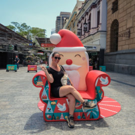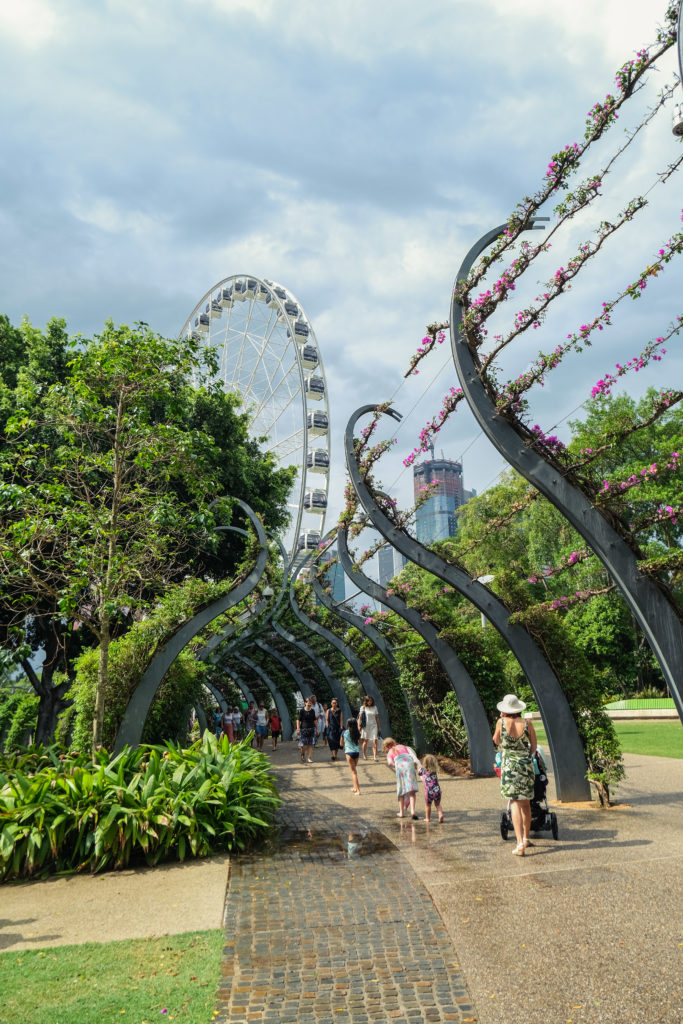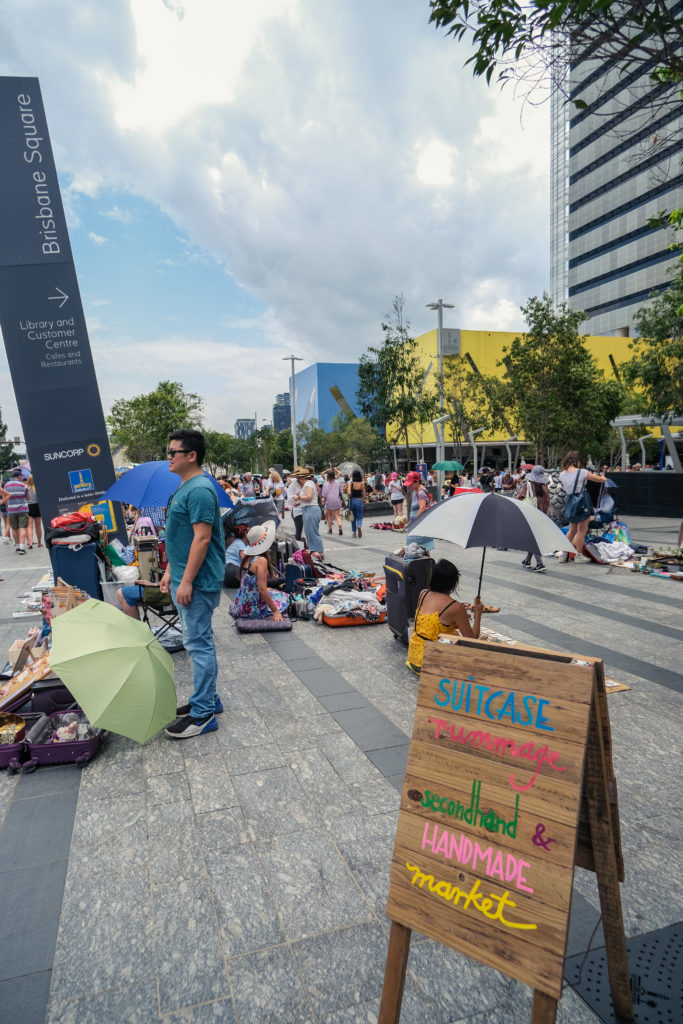 Nous étions dimanche ce jour là mais les quartiers étaient tout de même très animés ! La grande rue commerçante qui accueille toute les grandes enseignes bien connues étaient ouverte. Après avoir descendu cette avenue décorée pour l’arrivée du père-noël nous nous sommes rendu dans le jardin botanique. Et là oh surprise, tous les dimanches il y a un petit marché d’artisan et des stands de miam comme on les aime. Ça sentait bon et en plus il y avait un français qui vendait ses viennoiseries !! Bon, l’heure du p’tit dej était passé et ça n’était pas encore l’heure du dej alors on n’a fait que regarder (de toute façon un pain au chocolat à 3€ ça l’aurait peut-être pas fait, faut pas exagérer, on n’est pas en manque à ce point là) ! Après avoir flâné dans le jardin nous sommes partis en direction du quartier South Bank. Juste avant d’y arriver nous sommes passé devant une sorte de vide dressing à moitié improvisé, l’ambiance était chouette.