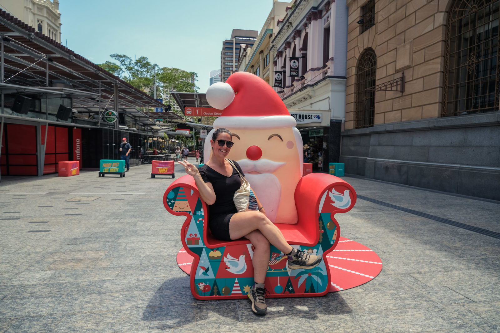 Nous étions dimanche ce jour là mais les quartiers étaient tout de même très animés ! La grande rue commerçante qui accueille toute les grandes enseignes bien connues étaient ouverte. Après avoir descendu cette avenue décorée pour l’arrivée du père-noël nous nous sommes rendu dans le jardin botanique. Et là oh surprise, tous les dimanches il y a un petit marché d’artisan et des stands de miam comme on les aime. Ça sentait bon et en plus il y avait un français qui vendait ses viennoiseries !! Bon, l’heure du p’tit dej était passé et ça n’était pas encore l’heure du dej alors on n’a fait que regarder (de toute façon un pain au chocolat à 3€ ça l’aurait peut-être pas fait, faut pas exagérer, on n’est pas en manque à ce point là) ! Après avoir flâné dans le jardin nous sommes partis en direction du quartier South Bank. Juste avant d’y arriver nous sommes passé devant une sorte de vide dressing à moitié improvisé, l’ambiance était chouette.
