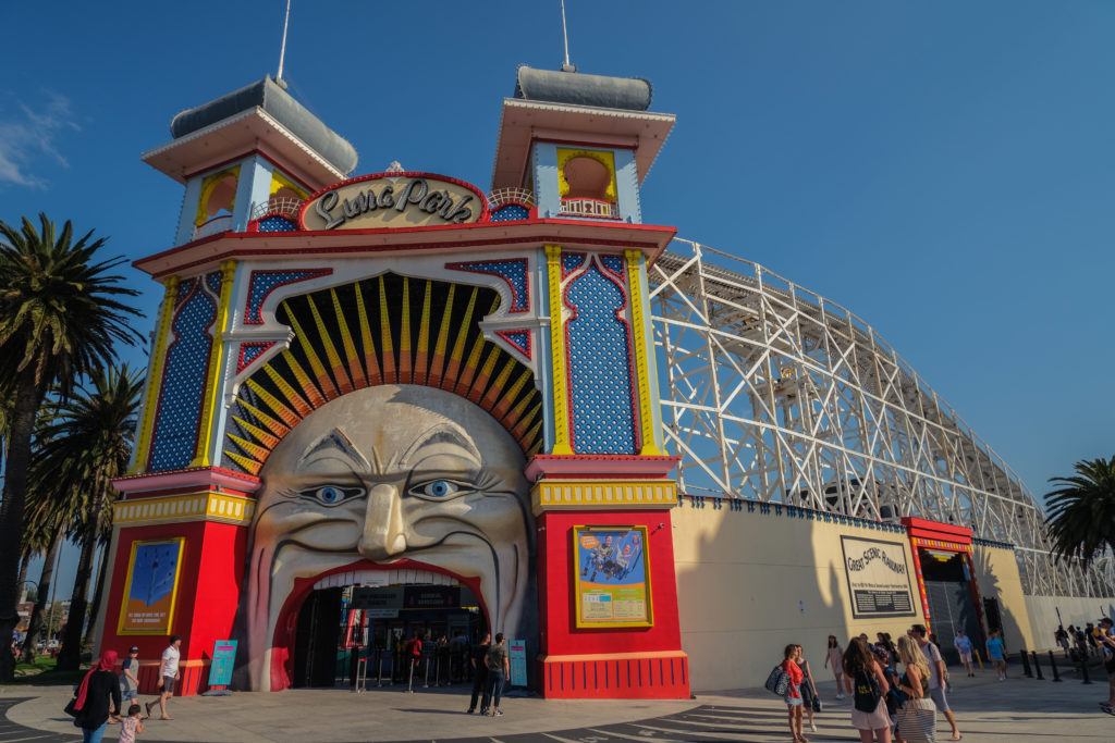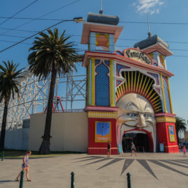 Ensuite nous avons pris la direction de la plage… dernière plage australienne à St Kilda. C’était comment dire, une plage de ville !! Pas très sexy, bondé de monde, pas d’ombre mais c’était cool quand même de se poser là. On y est resté tout l’aprem et en partant on a découvert le Luna Park de Melbourne (on savait même pas qu’il y en avait un). Le bonhomme d’entrée est toujours aussi flippant voire plus que celui de Sydney, j’adoooore !!