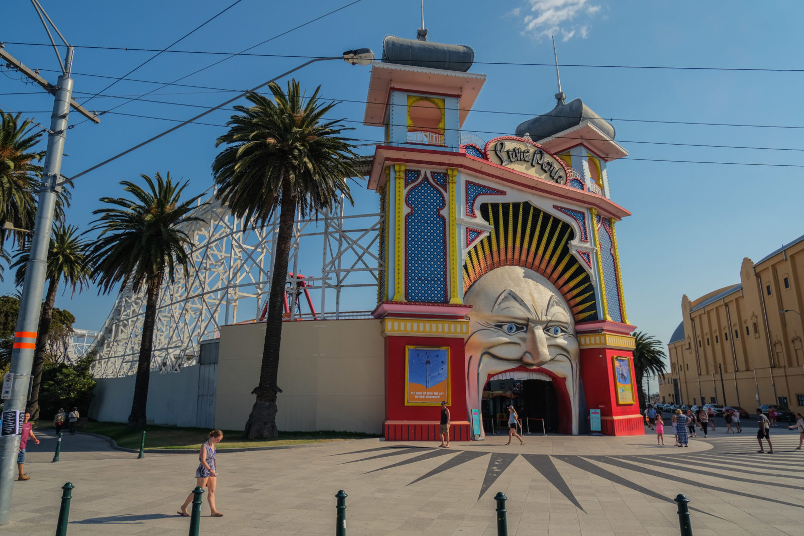 Ensuite nous avons pris la direction de la plage… dernière plage australienne à St Kilda. C’était comment dire, une plage de ville !! Pas très sexy, bondé de monde, pas d’ombre mais c’était cool quand même de se poser là. On y est resté tout l’aprem et en partant on a découvert le Luna Park de Melbourne (on savait même pas qu’il y en avait un). Le bonhomme d’entrée est toujours aussi flippant voire plus que celui de Sydney, j’adoooore !!