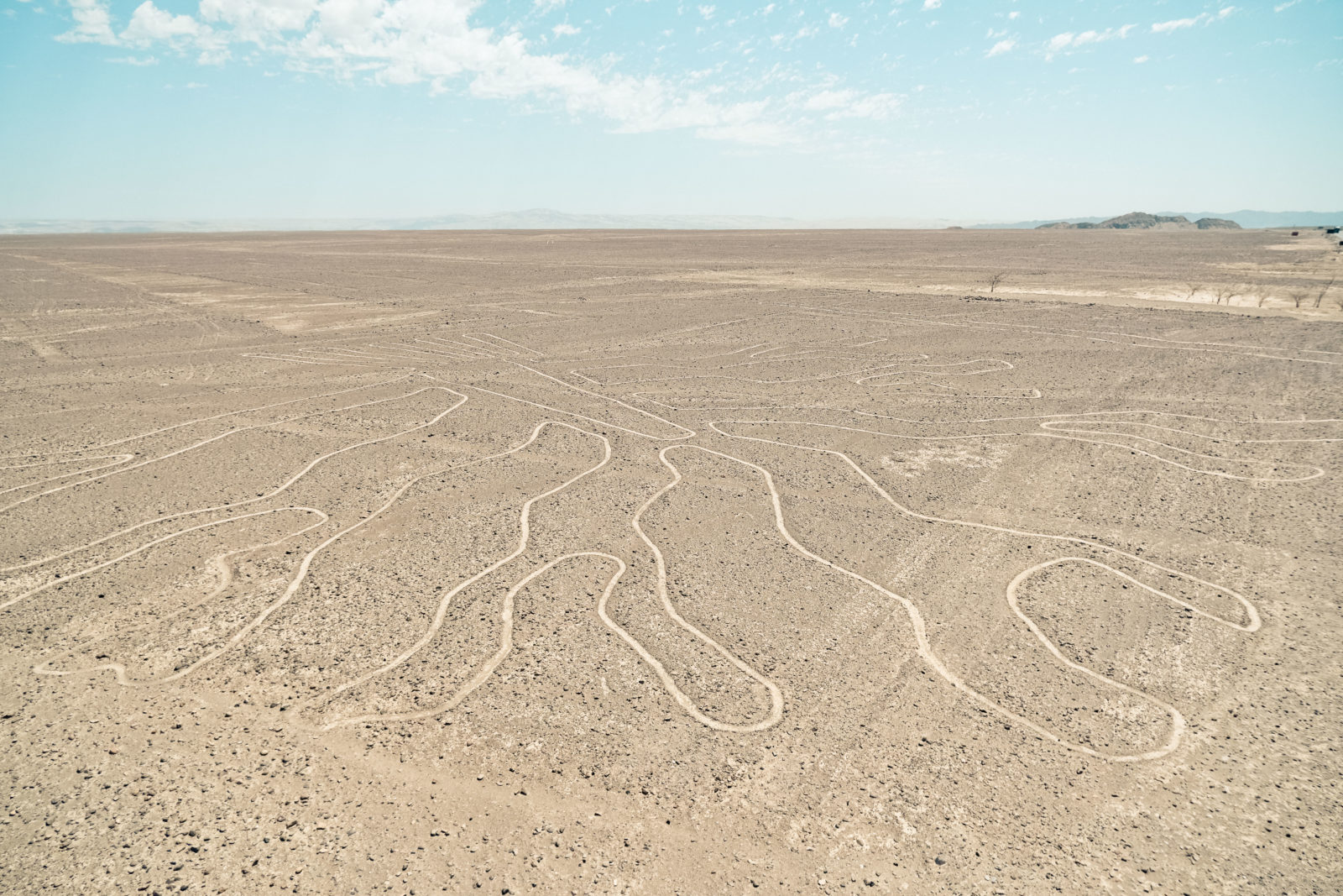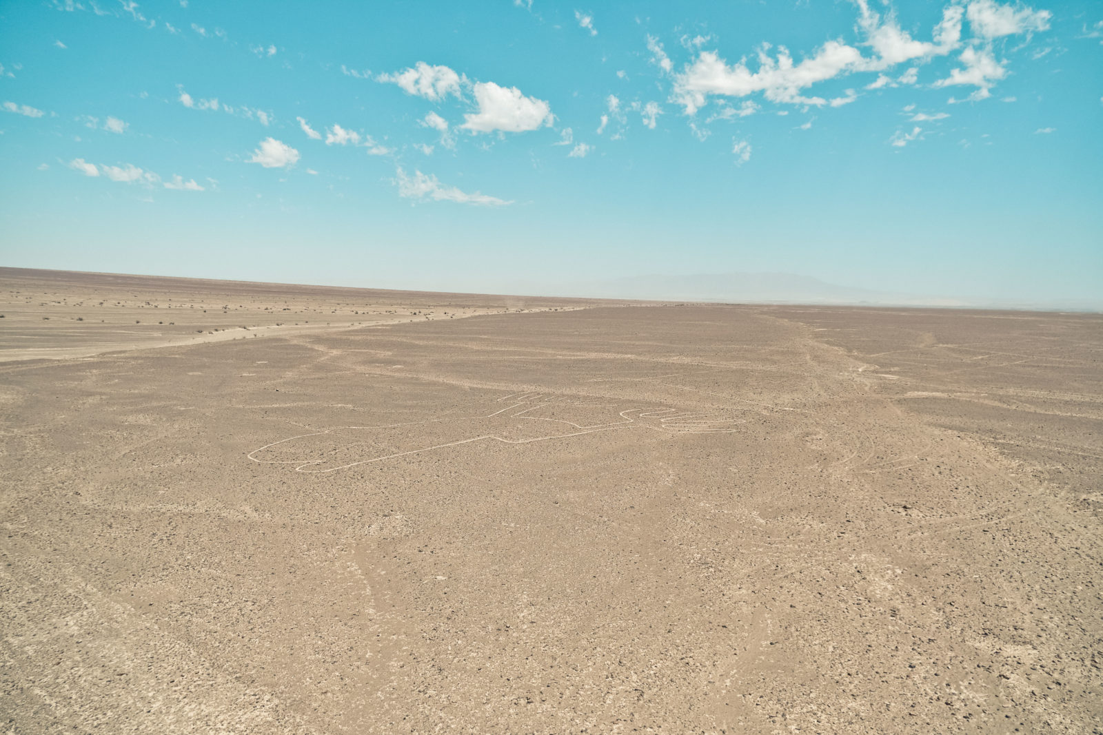 Comme de toute façon il aurait fallu qu’on appelle un taxi, on a décidé d’accepter parce qu’en plus on ne savait pas qu’il existait deux autres miradors. Nous voilà parti pour 2 bonnes heures de visite avec notre guide Arturo. On part direction Palpa car c’est là-bas que les lignes les plus anciennes s’y trouvent. On a pu voir les lignes formant une famille, un chamane et deux hommes.