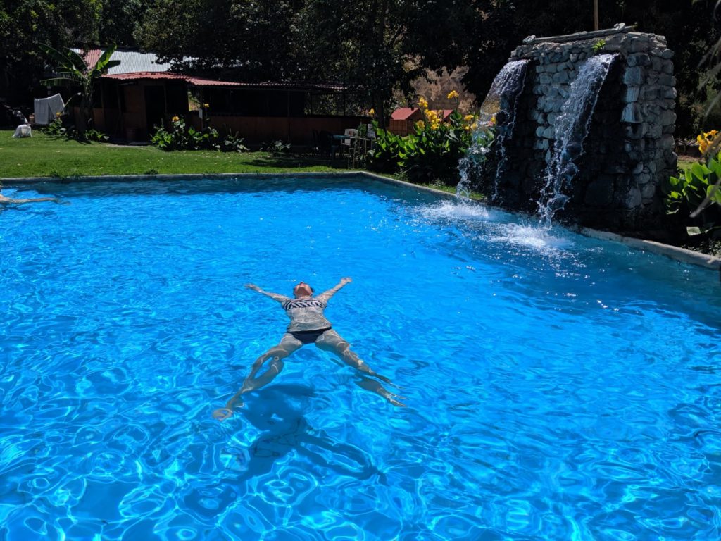 Départ vers 8h30 de l’hôtel, on est parti tranquille. J’appréhendais un peu cette journée car j’avais des grosses ampoules aux orteils. Ce qui était plus appréciable que sur la précédente étape c’est qu’il n’y avait pas que des descentes. Et même si les montées étaient un peu raides, ça restait plus agréable que de descendre tout le temps. Par contre on a eu quelques souci d’orientation car cette étape, contrairement à celle de la veille, n’était pas fléché ni indiqué par des panneaux. Donc dès fois on a dû passer chez des gens ou traverser un flan de montagne un peu à l’arrache mais ça s’est bien fait. Et on a encore vu des colibris, c’était chouette mais ils sont trop rapide pour pouvoir les prendre en photo c’est un peu frustrant ! Bref, cette étape était dure mais moins que celle de la précédente pour moi en tout cas. On a mis 3h30 pour arrivé à l’hôtel donc juste à temps pour manger le repas du midi. Parfait ! Et après ben pour pas trop changer, on a profité de la piscine de l’hôtel, il faisait tellement chaud ça nous a fait du bien !