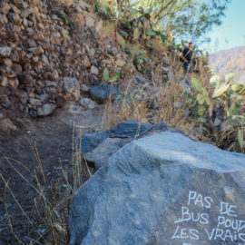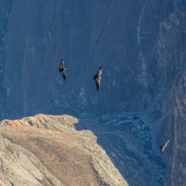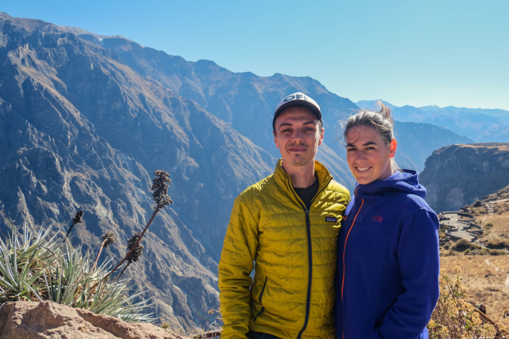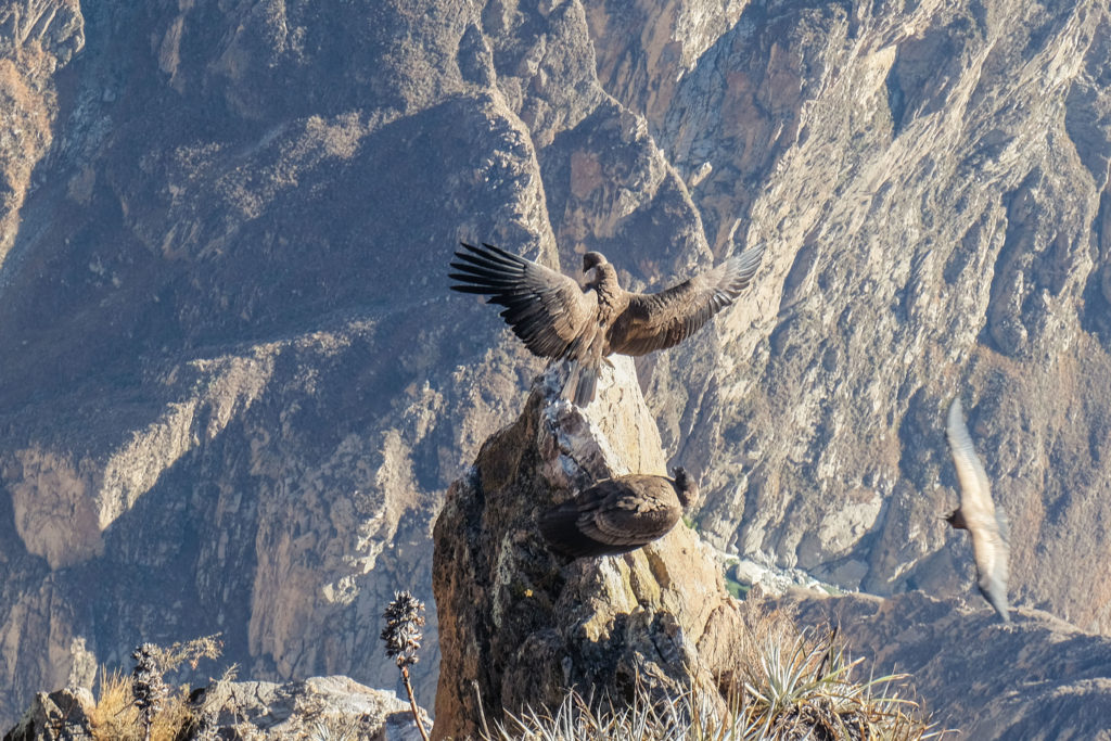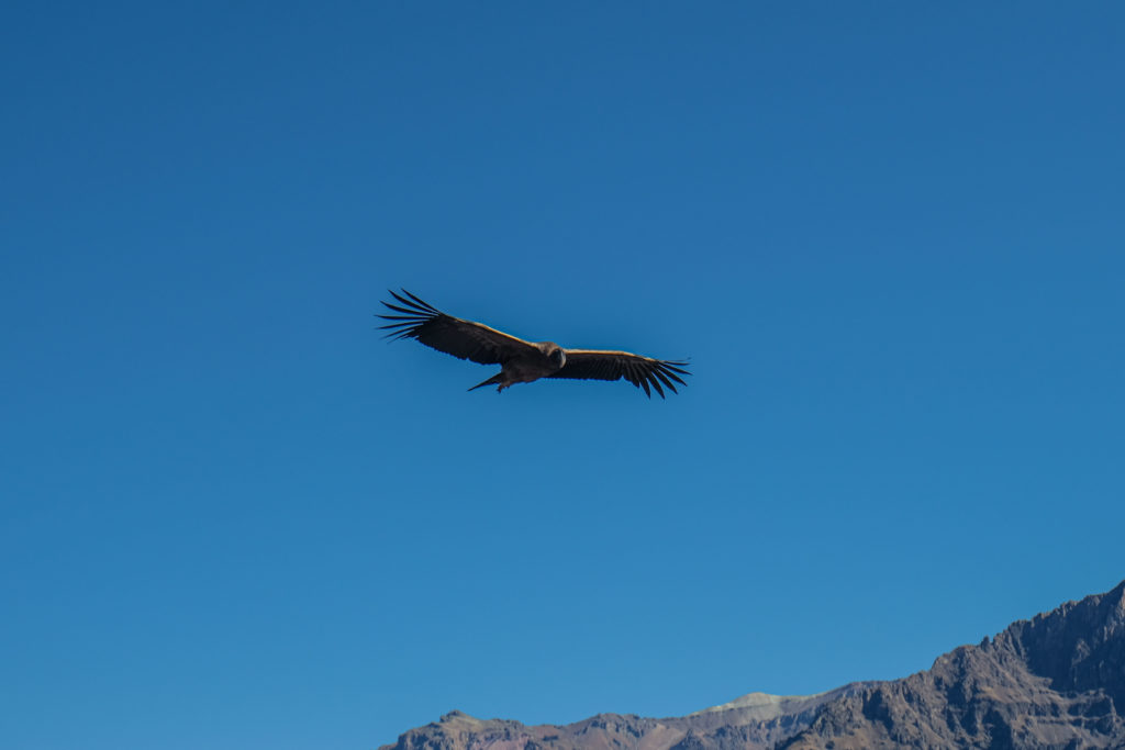 Départ vers 7h depuis Cabanaconde, comme annoncé par l’hôtel il suffit de monter dans le bus, y’a pas de ticket ou de resa à faire… ok ! Donc c’est ce qu’on a fait et bim on s’est fait dégagé de nos sièges par deux locaux qui avaient un ticket avec nos numéros de place… rrr ! Pas cool mais en même temps, c’était pas si mal car je me suis retrouvé assise à côté du « petit gars » (en vrai il était très grand) hollandais avec qui on avait sympathisé pendant nos étapes de pause du trek (à chaque fois on se retrouvait dans la même auberge). Et il me dit que son hôtel lui a conseillé de descendre au mirador Cruz del Condor (un point de vue sur les montagnes et surtout le lieu pour voir des condors voler) et de reprendre un autre bus ensuite. Trop bien, merci pour le plan, on fait la même !! Grâce à ce p’tit gars au nom imprononçable (qui comment par un T et fini par un N, c’est ce qu’on a cru comprendre) on a pu profiter d’un nouveau spectacle d’oiseaux. Cette fois-ci ils n’étaient pas colorés mais c’était impressionnant quand même. De voir cette grosse poule voler juste au-dessus de nos têtes c’était énorme ! Et en plus on a eu la chance d’en voir 10 en même temps. Ils se sont vraiment donné en spectacle…on ne remerciera jamais assez le p’tit gars !