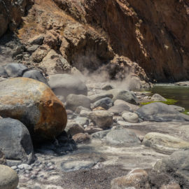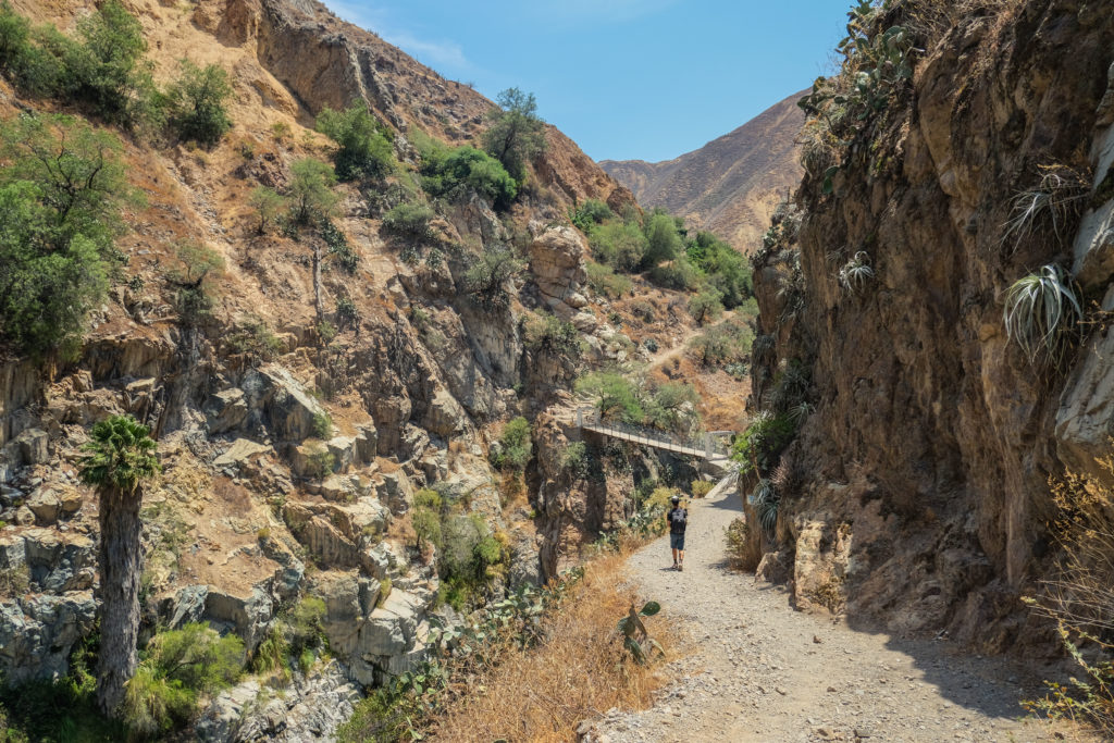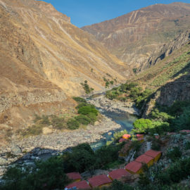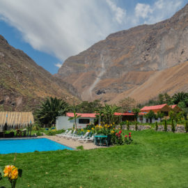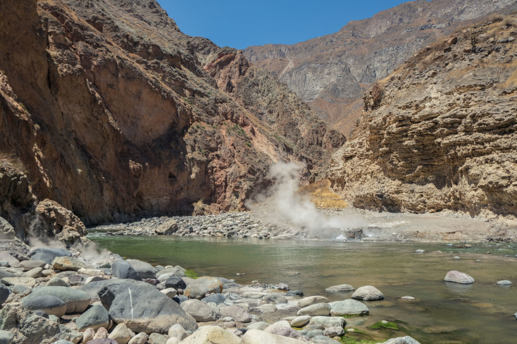 Le début était plutôt facile, pas de montée pas de vraie descente. On a pu profiter du paysage et en levant la tête on a eu la chance de voir un condor voler juste au dessus de nous. Il faut savoir que le condor (cet énorme rapace d’environ 3,20 voire 3,50 mètres d’envergure) est le symbole du canyon de Colca. C’est l’endroit pour les voir. Alors on était encore plus content. En continuant la marche, ça commençait à bien descendre et de plus en plus… nous nous enfoncions dans le fond du canyon. Au bout de 2h30 de marche les orteils commençaient vraiment à souffrir de ces descentes. On peut croire que c’est facile les chemins en descente mais là il s’agissait de belles pentes et avec des petits, des moyens et des gros cailloux voire des très gros alors c’était pas si facile. Après 3h de marche on est arrivé sur un pont duquel on apercevait des geysers situés dans la rivière qui coulait juste en dessous. On s’est fait une pause photo de geysers et on a papoté avec un français qui faisait aussi une étape du canyon avec des potes. Ensuite on est reparti pour peu de temps car en fait même pas 30 minutes plus tard nous tombions sur notre hôtel perché dans les montagnes. On était content d’arriver car nos pieds avaient pris cher, surtout les miens et aussi car on avait hâte d’aller profiter des sources chaudes de l’hôtel (c’est d’ailleurs pour ça qu’on l’a choisi !!). Donc ni une ni deux, on a enfilé nos maillots pour aller se poser dans l’eau chaude. Quel plaisir après tant d’effort ! Et voilà, on était encore content 😀 !! Comme on était arrivé avant 12h on a pris de temps de profiter avant de manger et l’aprem ben pareil. On a fini la soirée par une partie de billard et même si Tom a gagné c’est moi qui ai entré toutes mes boules avant lui, j’étais trop fière de moi !!