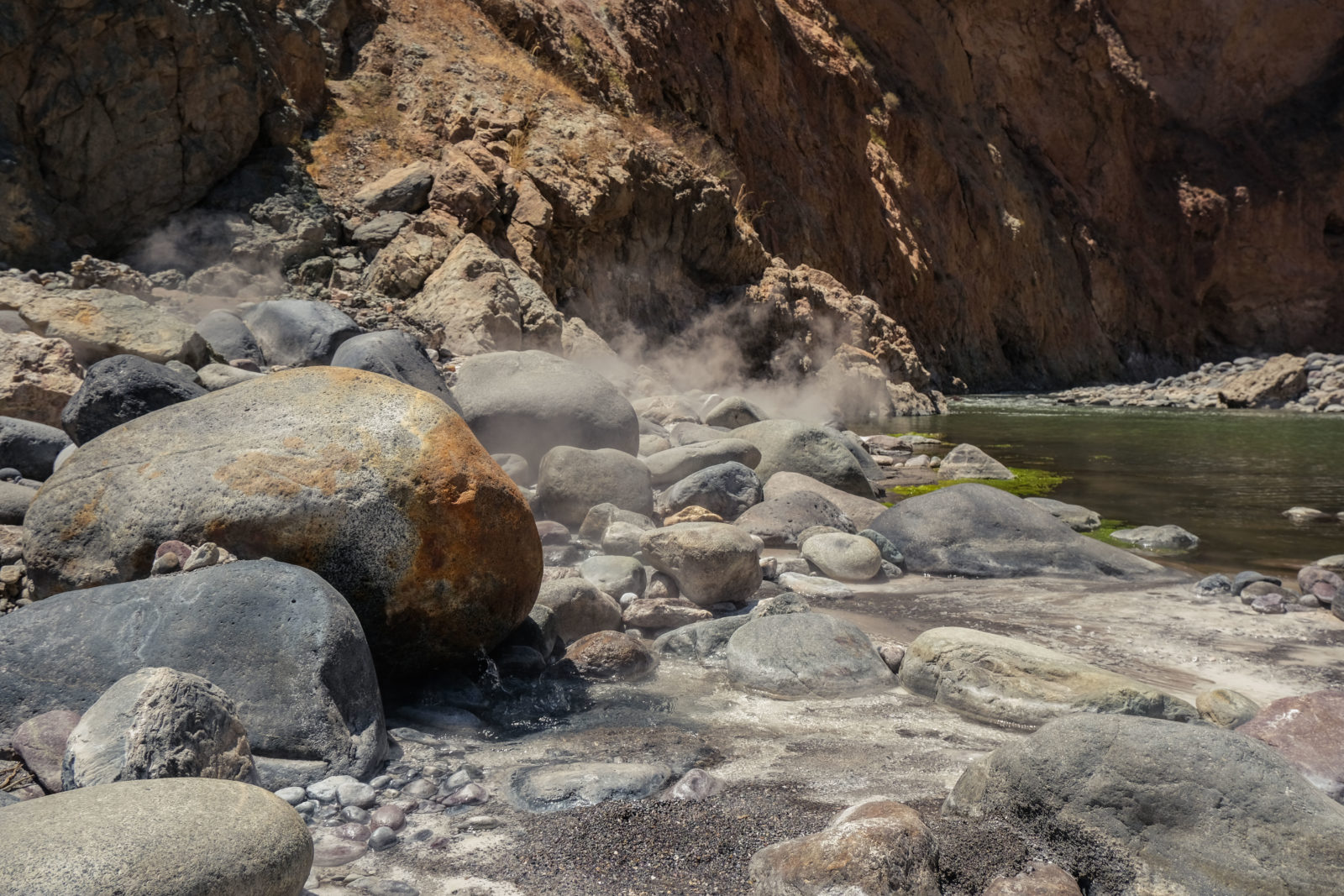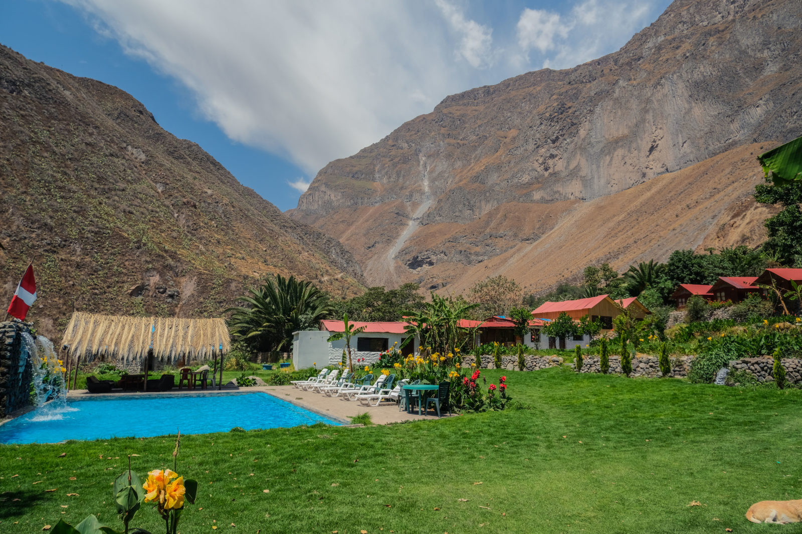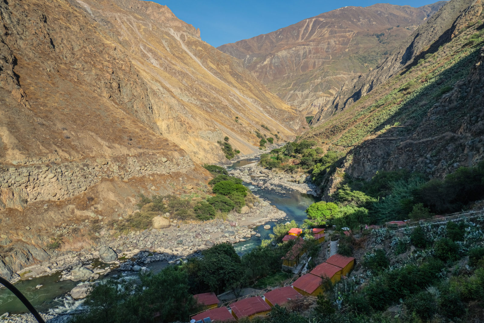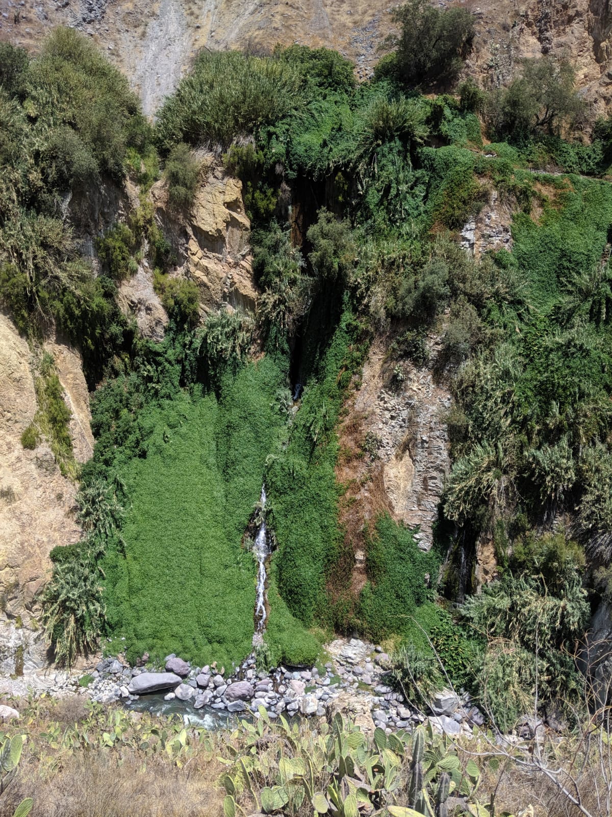 Le début était plutôt facile, pas de montée pas de vraie descente. On a pu profiter du paysage et en levant la tête on a eu la chance de voir un condor voler juste au dessus de nous. Il faut savoir que le condor (cet énorme rapace d’environ 3,20 voire 3,50 mètres d’envergure) est le symbole du canyon de Colca. C’est l’endroit pour les voir. Alors on était encore plus content. En continuant la marche, ça commençait à bien descendre et de plus en plus… nous nous enfoncions dans le fond du canyon. Au bout de 2h30 de marche les orteils commençaient vraiment à souffrir de ces descentes. On peut croire que c’est facile les chemins en descente mais là il s’agissait de belles pentes et avec des petits, des moyens et des gros cailloux voire des très gros alors c’était pas si facile. Après 3h de marche on est arrivé sur un pont duquel on apercevait des geysers situés dans la rivière qui coulait juste en dessous. On s’est fait une pause photo de geysers et on a papoté avec un français qui faisait aussi une étape du canyon avec des potes. Ensuite on est reparti pour peu de temps car en fait même pas 30 minutes plus tard nous tombions sur notre hôtel perché dans les montagnes. On était content d’arriver car nos pieds avaient pris cher, surtout les miens et aussi car on avait hâte d’aller profiter des sources chaudes de l’hôtel (c’est d’ailleurs pour ça qu’on l’a choisi !!). Donc ni une ni deux, on a enfilé nos maillots pour aller se poser dans l’eau chaude. Quel plaisir après tant d’effort ! Et voilà, on était encore content 😀 !! Comme on était arrivé avant 12h on a pris de temps de profiter avant de manger et l’aprem ben pareil. On a fini la soirée par une partie de billard et même si Tom a gagné c’est moi qui ai entré toutes mes boules avant lui, j’étais trop fière de moi !!
