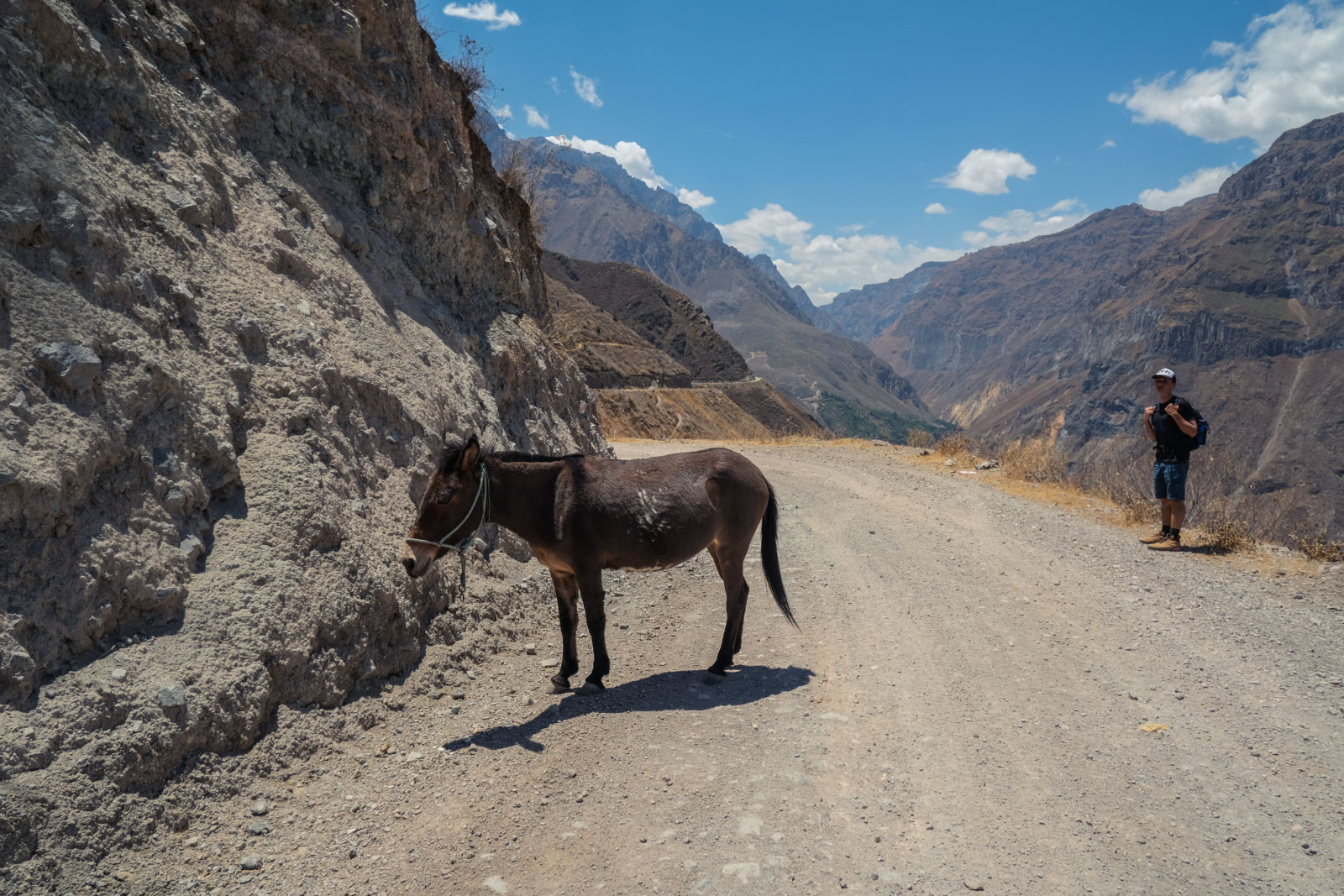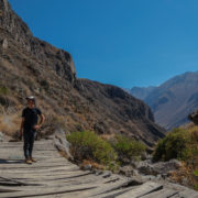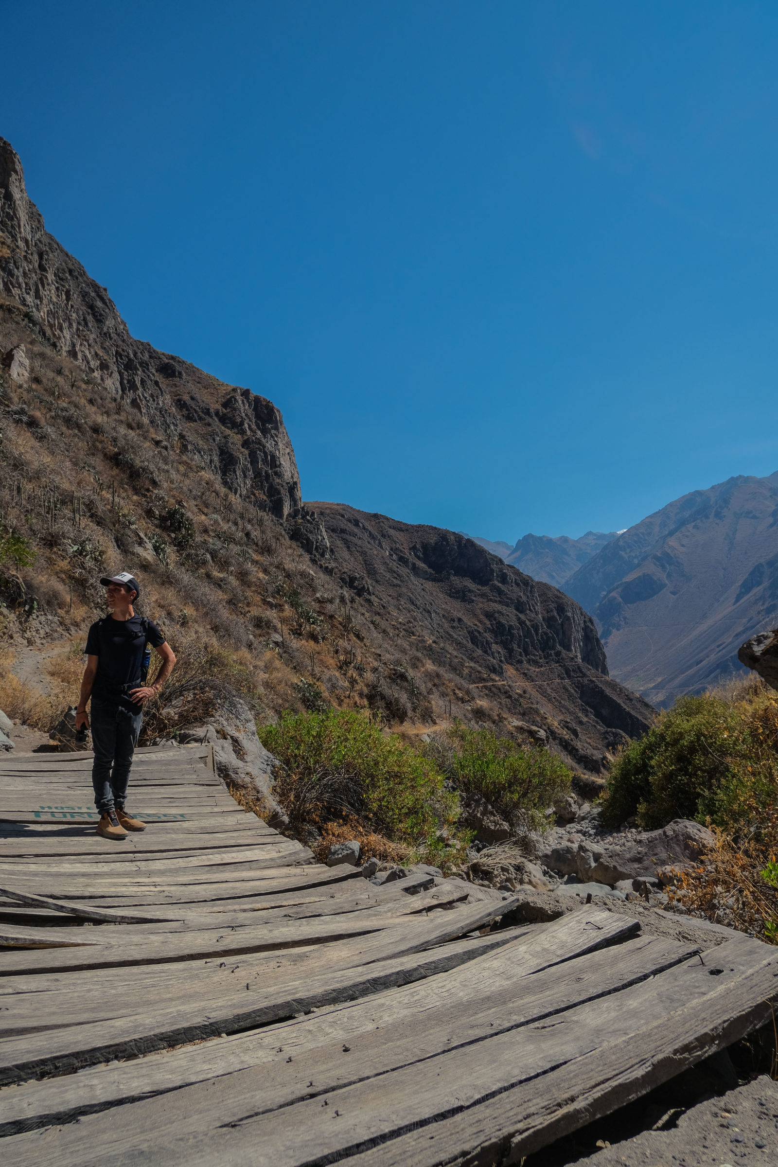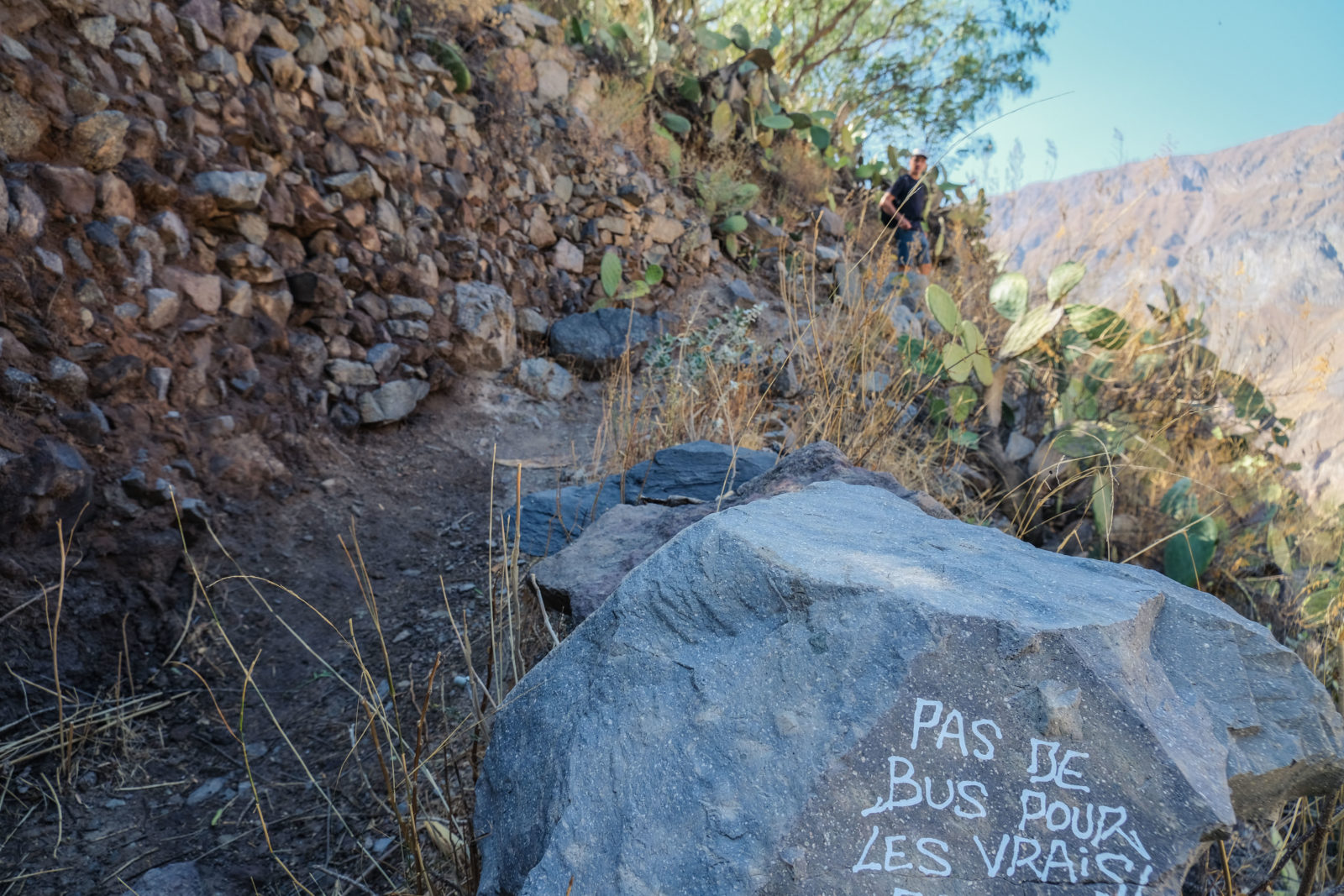 Levé comme d’hab vers 6h45 pour partir vers 8h. Après deux matinées à marcher j’étais pas hyper motivé pour cette dernière sachant que cette fois nous n’aurions que de la montée (et bien raide en plus). On a quitté l’hôtel à peine avant 8h et c’était parti pour 3h30 de montée comme indiqué sur le plan que l’office du tourisme nous avait fourni. Dès le début l’effort se faisait ressentir dans les jambes et le souffle. Et plus on montait plus j’avais l’impression que le sommet s’éloignait…bah c’était interminable en fait ! Au bout d’une heure de montée on a ressenti un grand besoin de faire une pause. Aïe, on aurait peut-être pas du, ça m’a coupé les pattes ! J’en pouvais plus mais y’avait encore beaucoup de chemin à faire. On a tenu bon, on a même doublé des gens !! Au final on devait quand même avoir un bon rythme parce qu’on est arrivé à Cabanaconde après 2h30 de marche ! Ce trek nous aura un peu lessivé, la première et dernière étape étaient corsées et la chaleur ne nous a pas aidé mais les paysages étaient géniaux et surtout on était tout seul ! Pas de centaine de touriste à l’horizon et ça, ça fait du bien. On aura pu voir deux condors et plusieurs colibris pendant ce trek. On aura rencontré pas mal de français et on aura sympathisé avec une allemande, un hollandais et un canadien. Si c’était à refaire je dirais sûrement oui mais pas tout de suite !!