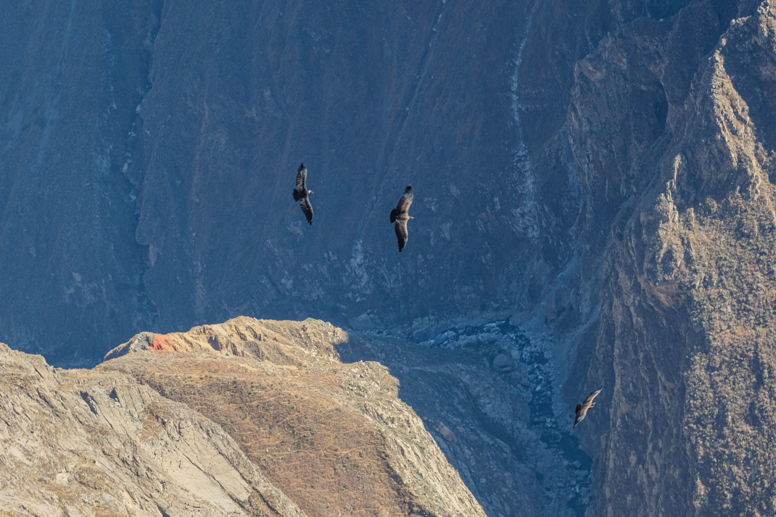 Départ vers 7h depuis Cabanaconde, comme annoncé par l’hôtel il suffit de monter dans le bus, y’a pas de ticket ou de resa à faire… ok ! Donc c’est ce qu’on a fait et bim on s’est fait dégagé de nos sièges par deux locaux qui avaient un ticket avec nos numéros de place… rrr ! Pas cool mais en même temps, c’était pas si mal car je me suis retrouvé assise à côté du « petit gars » (en vrai il était très grand) hollandais avec qui on avait sympathisé pendant nos étapes de pause du trek (à chaque fois on se retrouvait dans la même auberge). Et il me dit que son hôtel lui a conseillé de descendre au mirador Cruz del Condor (un point de vue sur les montagnes et surtout le lieu pour voir des condors voler) et de reprendre un autre bus ensuite. Trop bien, merci pour le plan, on fait la même !! Grâce à ce p’tit gars au nom imprononçable (qui comment par un T et fini par un N, c’est ce qu’on a cru comprendre) on a pu profiter d’un nouveau spectacle d’oiseaux. Cette fois-ci ils n’étaient pas colorés mais c’était impressionnant quand même. De voir cette grosse poule voler juste au-dessus de nos têtes c’était énorme ! Et en plus on a eu la chance d’en voir 10 en même temps. Ils se sont vraiment donné en spectacle…on ne remerciera jamais assez le p’tit gars !