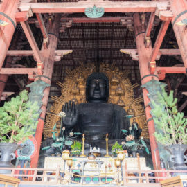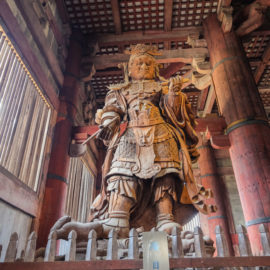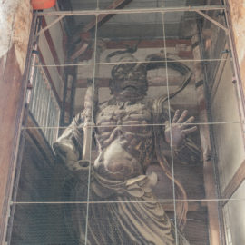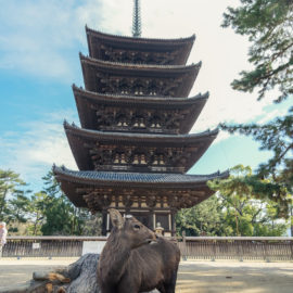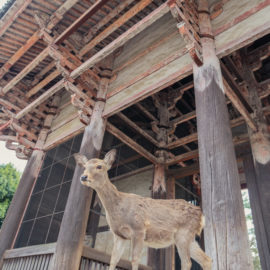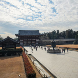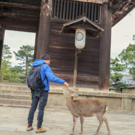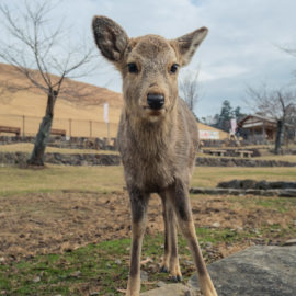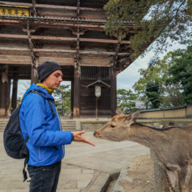 Pour cette belle journée qui nous attendait, nous avons décidé de reprendre le train en direction de la ville de Nara. Là bas il y a aussi pas mal de chose à faire mais ce qui nous intéressait c’était le temple autour duquel habitent des petits cerfs !! À peine arrivé près du site, nous étions déjà accueilli par ces p’tites bêtes. Évidemment, comme c’est un endroit très touristique, ils n’ont pas du tout peur de nous et il y a même énormément de gens qui leur donne à manger (nul !!) ! Nous sommes passé faire un p’tit coucou aux cerfs en traversant le parc du temple puis nous sommes aller visiter ce fameux temple dans lequel se trouve un énorme bouddha. Ensuite nous avons fait une bonne marche de deux heures pour aller voir la vue sur la ville depuis la colline. C’était froid (je crois qu’on n’est pas suffisamment équipé pour les grands froids) mais chouette !