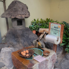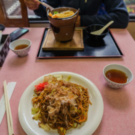 Nous avons poursuivi la découverte des lieux par une balade dans le petit village de Shibu Kogen où nous avons trouvé un petit resto traditionnel très sympa et surtout très bon. Ensuite et comme il faisait très froid et que nous n’étions pas vraiment équipé pour ce temps, nous voulions trouver un « onsen ». C’est un bain d’eau chaude issue des sources volcaniques. Il y en a partout dans la région où nous nous trouvions et on se disait qu’on allait pouvoir nous aussi nous prélasser. Mais le problème est que entrer dans un onsen signifiait respecter la tradition japonaise c’est-à-dire accepter d’y entrer nu !! Et oui, les maillots de bain sont interdit. Mouais bof, bah temps pis, on est resté dans le froid polaire et d’ailleurs il faisait pas si froid finalement !! 😉 nan de toute façon je me serais fait recaler car les tatouages ne sont pas non plus autorisée et je me voyais mal lui demander de rester dehors, mon pauvre moineau des bois !! Mais finalement on est tombé sur un onsen prévu juste pour les pieds donc on s’en est contenté !! C’était carrément génial, une petite eau au alentour de 42 degrés ça nous a fait un grand bien ! On y est resté quelques instants avant de reprendre un train pour Nagano.