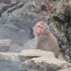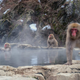 Comme déjà dit plus haut, Nagano est une ville qui se trouve du côté des Alpes. Elle dessert donc plusieurs stations de ski et des parcs naturels comme celui où il est possible d’admirer des singes. Des siiiinges les gars, eh oh, c’est complètement fou ça !! Des singes… dans la neige… bah oui j’vous assure ! Alors ce jour là nous sommes partis à leur rencontre. Le parc est leur milieu naturel, ils vivent dans les arbres des forêts enneigées, ils ne sont pas enfermés mais par contre, et c’est là où nous étions déçu, ils sont nourris ! C’est sûrement pour être sûr de les voir dans cette partie du parc qui est accessible aux touristes et donc payante !! Nul ! Nous étions tout de même impressionnés de voir des macaques par un temps si froid et ce qui est génial c’est que lorsqu’ils ont trop froid, ben ils font comme nous, ils se mettent au chaud dans les bains des sources naturelles !! La colonie de macaque présente était assez grande, il y avait peut-être une cinquantaine d’individus. Une femelle se prélassait dans l’eau pendant que les autres se chamaillent une place sur un rocher ou se chicanait un bout de graine qui trainait ! Cette rencontre était chouette et inattendue et malgré ce petit bémol du business touristique (on aurait largement préféré les trouver par nous mêmes dans les arbres ou dans les bains chauds), nous étions ravis de les avoir vu.