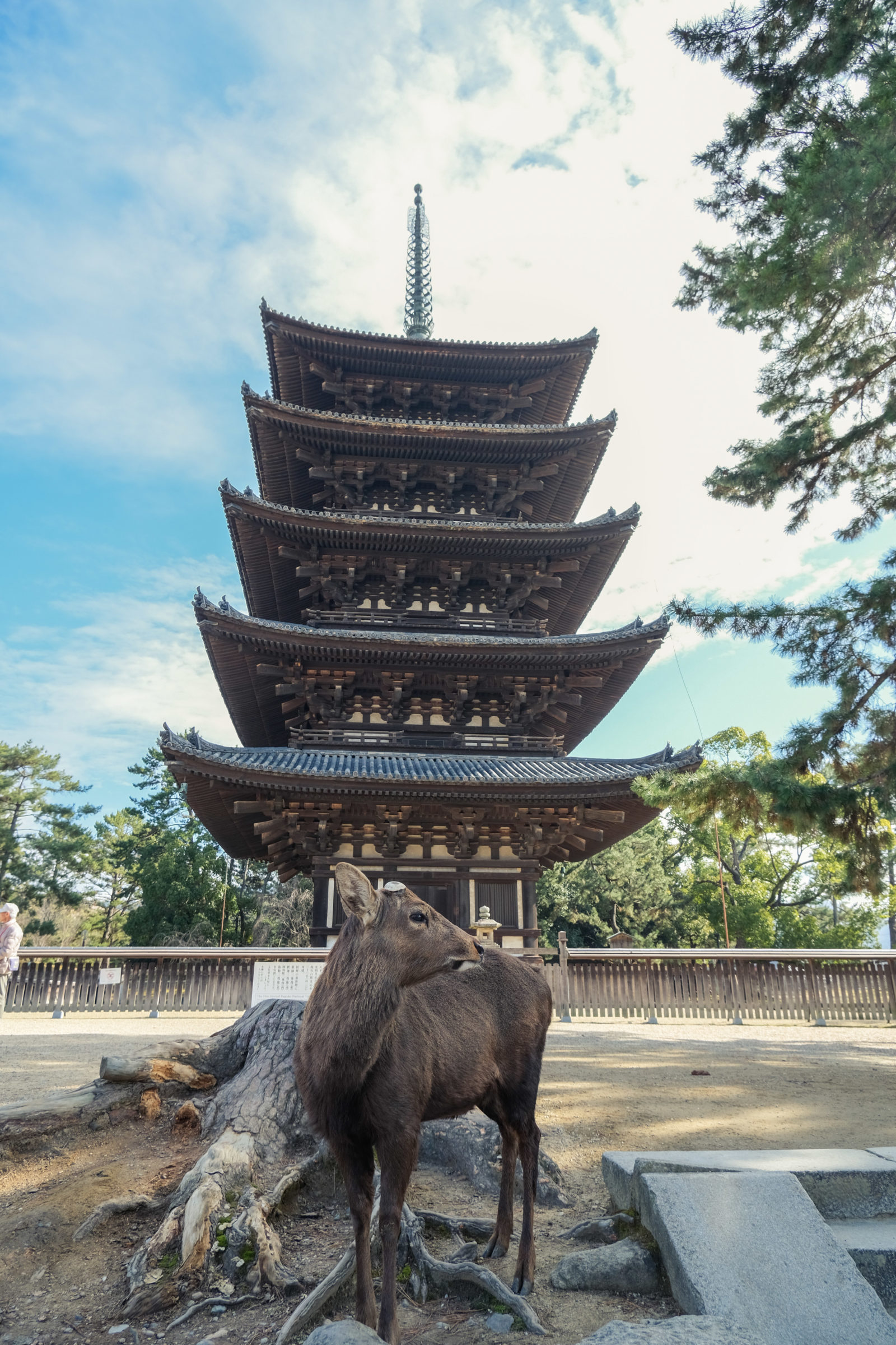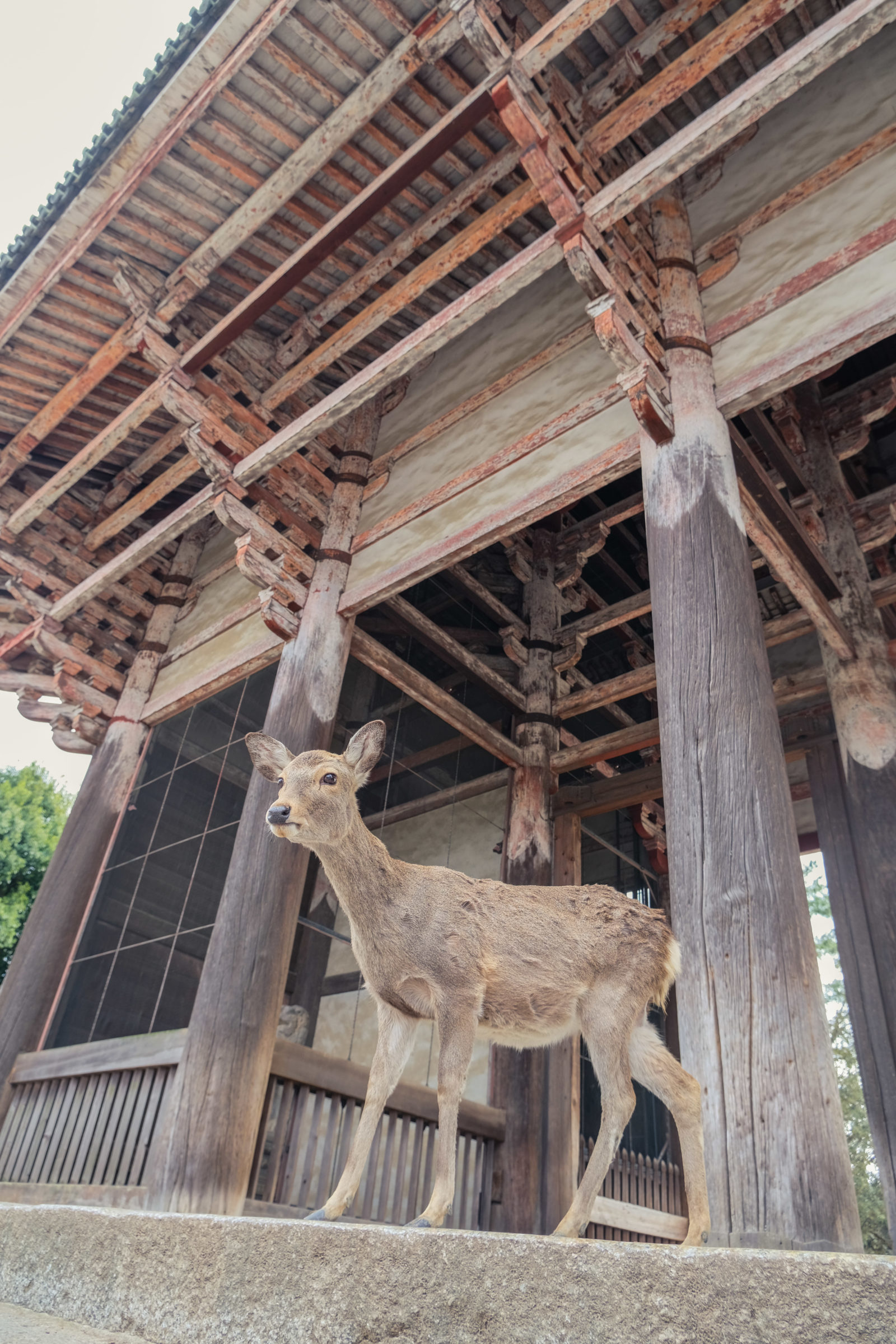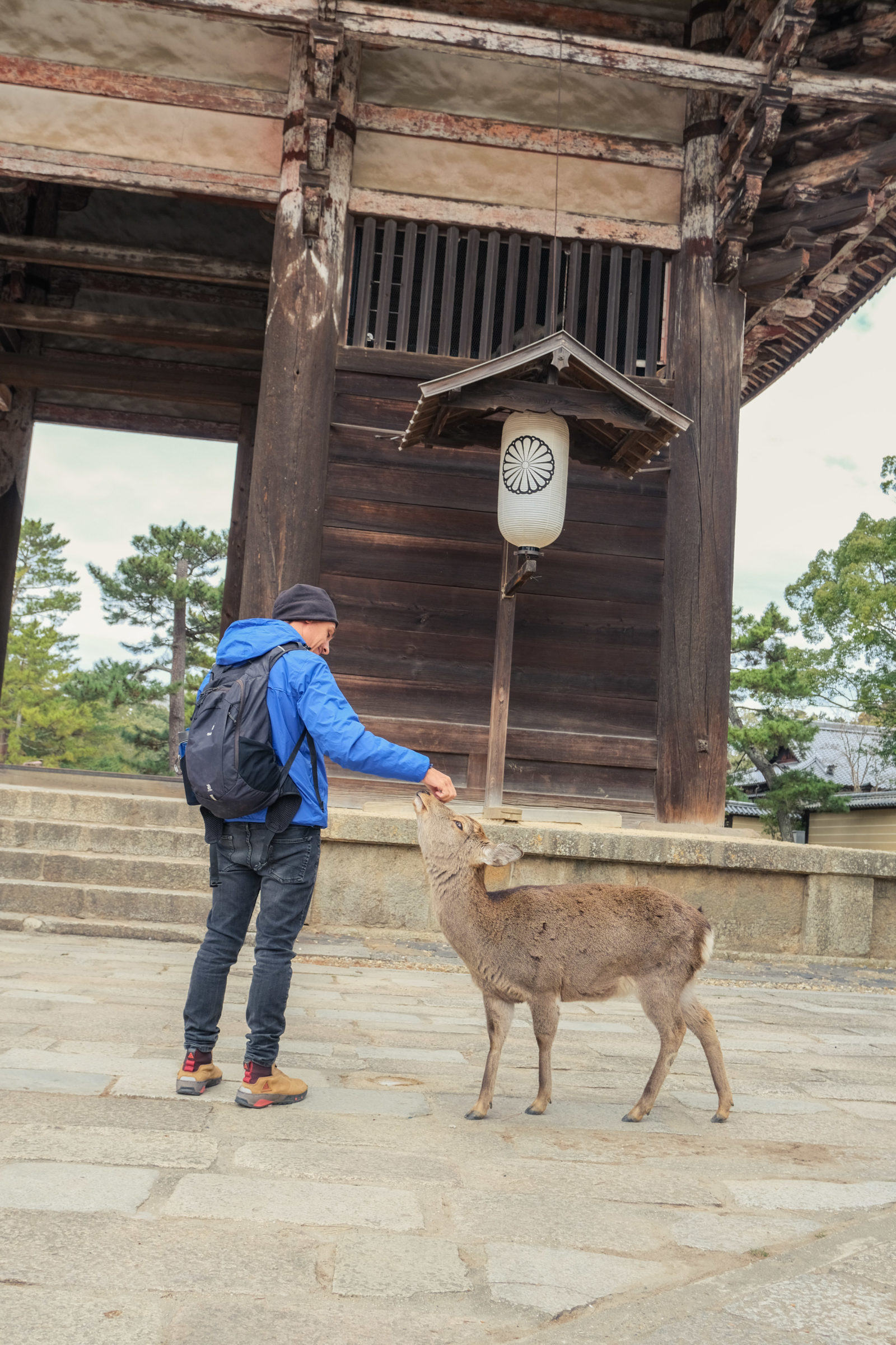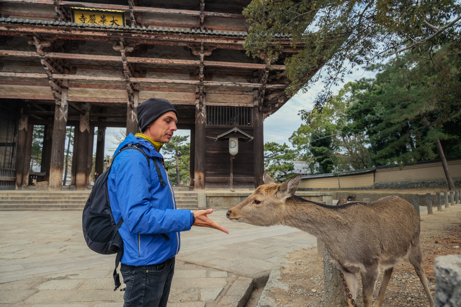 Pour cette belle journée qui nous attendait, nous avons décidé de reprendre le train en direction de la ville de Nara. Là bas il y a aussi pas mal de chose à faire mais ce qui nous intéressait c’était le temple autour duquel habitent des petits cerfs !! À peine arrivé près du site, nous étions déjà accueilli par ces p’tites bêtes. Évidemment, comme c’est un endroit très touristique, ils n’ont pas du tout peur de nous et il y a même énormément de gens qui leur donne à manger (nul !!) ! Nous sommes passé faire un p’tit coucou aux cerfs en traversant le parc du temple puis nous sommes aller visiter ce fameux temple dans lequel se trouve un énorme bouddha. Ensuite nous avons fait une bonne marche de deux heures pour aller voir la vue sur la ville depuis la colline. C’était froid (je crois qu’on n’est pas suffisamment équipé pour les grands froids) mais chouette !