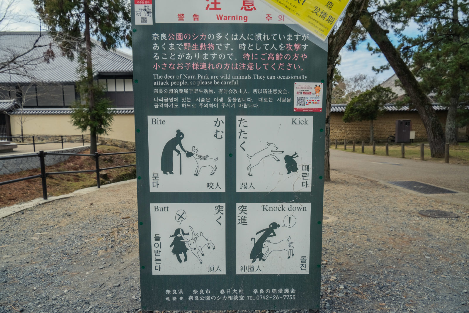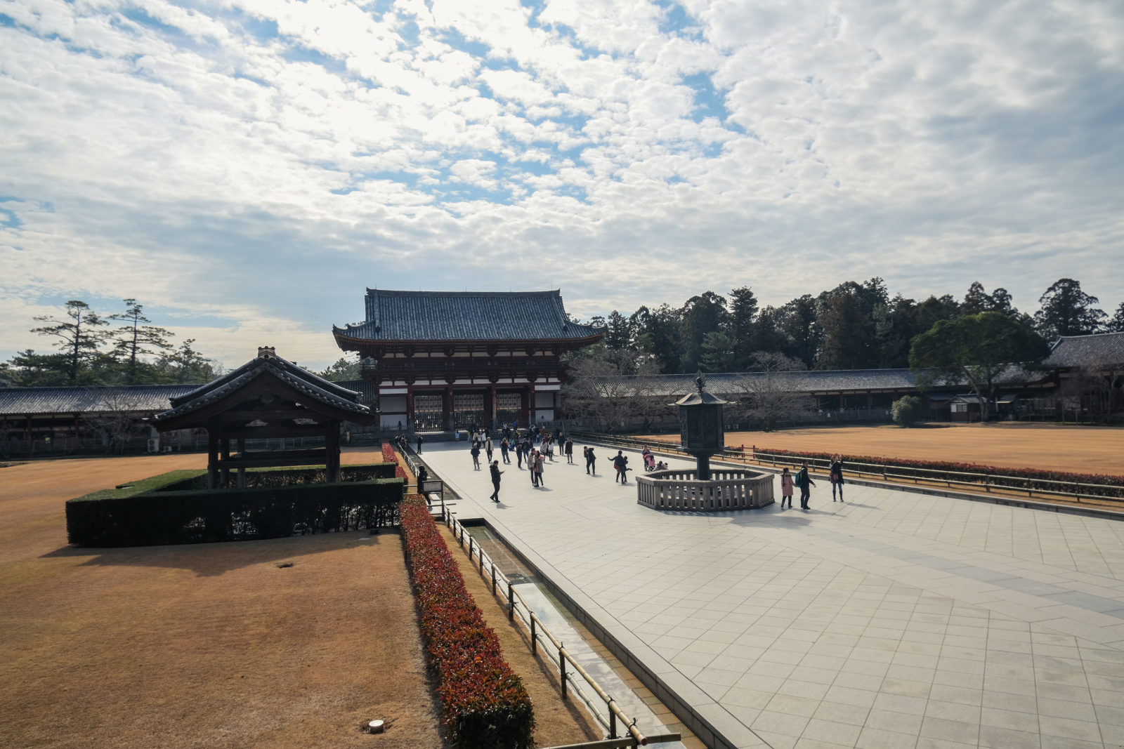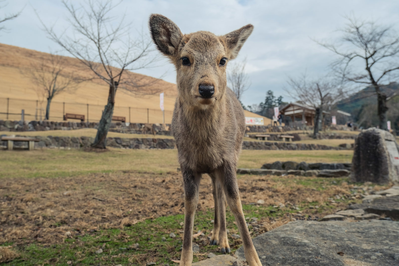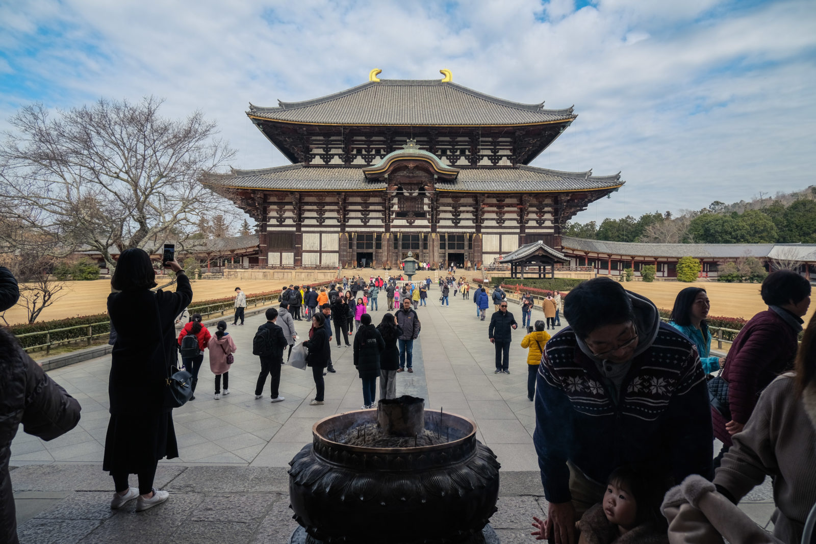 Pour cette belle journée qui nous attendait, nous avons décidé de reprendre le train en direction de la ville de Nara. Là bas il y a aussi pas mal de chose à faire mais ce qui nous intéressait c’était le temple autour duquel habitent des petits cerfs !! À peine arrivé près du site, nous étions déjà accueilli par ces p’tites bêtes. Évidemment, comme c’est un endroit très touristique, ils n’ont pas du tout peur de nous et il y a même énormément de gens qui leur donne à manger (nul !!) ! Nous sommes passé faire un p’tit coucou aux cerfs en traversant le parc du temple puis nous sommes aller visiter ce fameux temple dans lequel se trouve un énorme bouddha. Ensuite nous avons fait une bonne marche de deux heures pour aller voir la vue sur la ville depuis la colline. C’était froid (je crois qu’on n’est pas suffisamment équipé pour les grands froids) mais chouette !