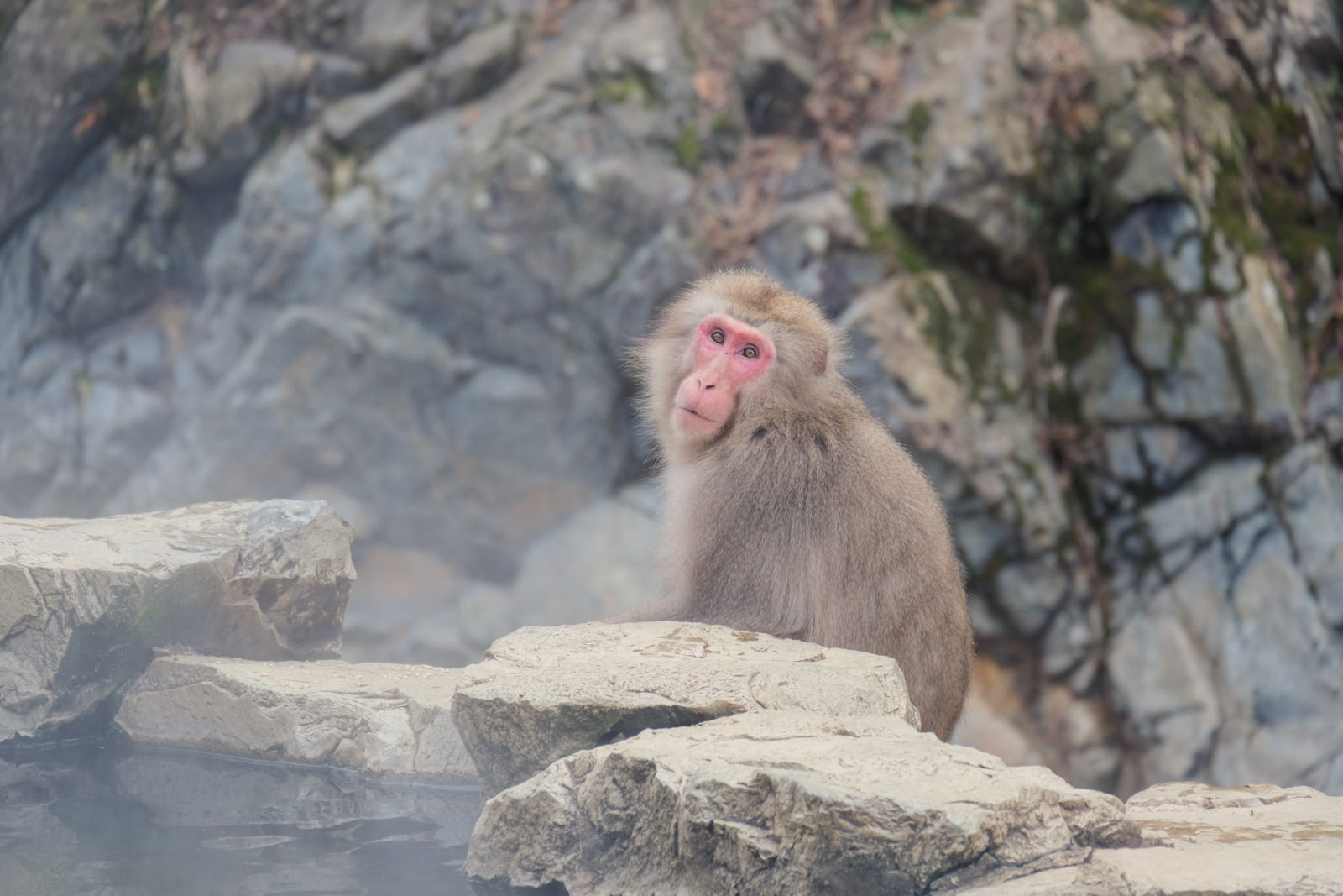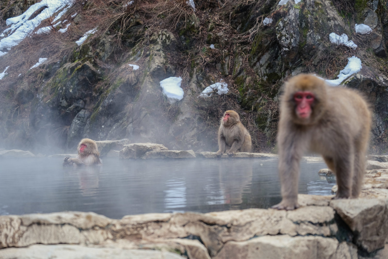 Comme déjà dit plus haut, Nagano est une ville qui se trouve du côté des Alpes. Elle dessert donc plusieurs stations de ski et des parcs naturels comme celui où il est possible d’admirer des singes. Des siiiinges les gars, eh oh, c’est complètement fou ça !! Des singes… dans la neige… bah oui j’vous assure ! Alors ce jour là nous sommes partis à leur rencontre. Le parc est leur milieu naturel, ils vivent dans les arbres des forêts enneigées, ils ne sont pas enfermés mais par contre, et c’est là où nous étions déçu, ils sont nourris ! C’est sûrement pour être sûr de les voir dans cette partie du parc qui est accessible aux touristes et donc payante !! Nul ! Nous étions tout de même impressionnés de voir des macaques par un temps si froid et ce qui est génial c’est que lorsqu’ils ont trop froid, ben ils font comme nous, ils se mettent au chaud dans les bains des sources naturelles !! La colonie de macaque présente était assez grande, il y avait peut-être une cinquantaine d’individus. Une femelle se prélassait dans l’eau pendant que les autres se chamaillent une place sur un rocher ou se chicanait un bout de graine qui trainait ! Cette rencontre était chouette et inattendue et malgré ce petit bémol du business touristique (on aurait largement préféré les trouver par nous mêmes dans les arbres ou dans les bains chauds), nous étions ravis de les avoir vu.
