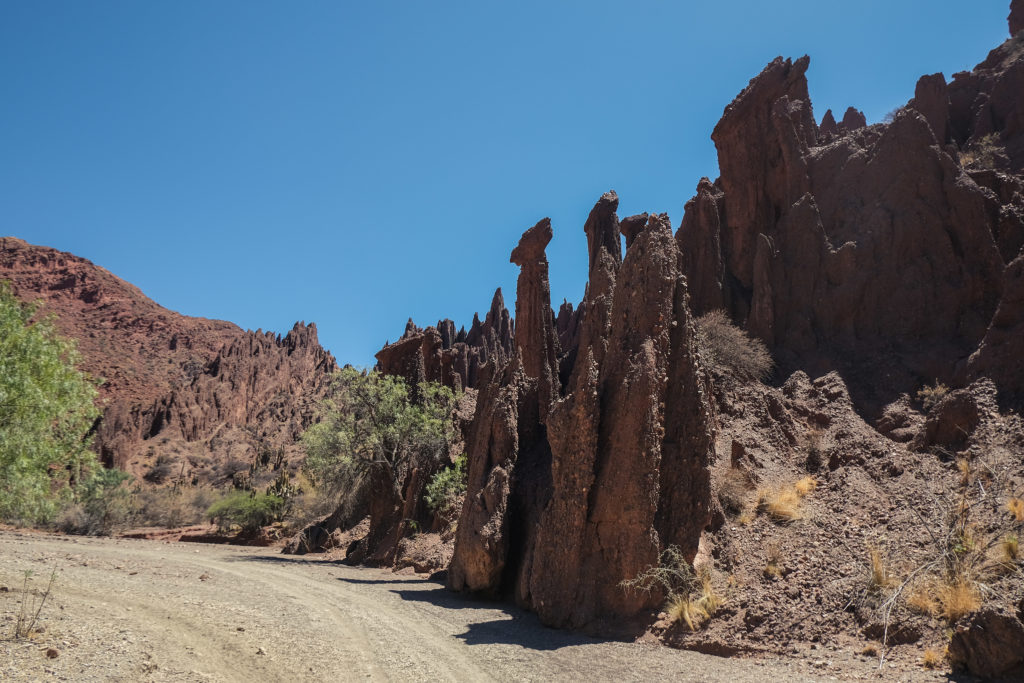 On s’est levé tôt pour aller choper notre bus qui nous emmenait de Potosí à Tupiza. Le départ était annoncé à 8h15, nous sommes arrivés au terminal de bus à 7h30… bien trop tôt car comme déjà dis avant la ponctualité n’est pas leur fort en Bolivie. Notre bus est arrivé vers 8h15, le temps que le chauffeur se prenne son café ou je n’sais quoi (il a disparu bien 15 minutes) ensuite le temps de charger les sacs et autres cargaisons des passagers, de faire grimper les passagers, ben il était 8h40. Bon après on est en vacances donc on n’est pas pressé mais on ne voulait pas se faire avoir deux fois et arriver dans la prochaine ville quasiment à la tombée de la nuit. Le vrai départ a eu lieu vers 8h50 car à peine démarré et sorti du terminal, le bus s’arrêtait déjà pour prendre de nouveaux passagers ! Le dernier passager de se bus à être monté n’avait pas de place, il est resté debout. Après que le bus soit reparti, ce monsieur a commencé à parler très fort, vraiment fort pour que tout le monde l’entende (nous on l’entendait très bien, il était juste devant nous) ! En fait pendant plus de 30 minutes ce monsieur nous a fait un « téléshopping » spécial complément alimentaire et laxatif. On n’avait pas encore vu ça mais ça nous a pas tellement étonné ! Charlène t’aurais été trop contente, c’était comme une vente d’Artishot en direct et « à domicile ». Et le pire c’est qu’après avoir fait 3h de route, le chauffeur s’est arrêté pour déjeuner (oui il semblerait que cela soit normal, c’est pas comme si on était sur un long trajet mais c’est comme ça) et au moment de redémarrer un nouveau vendeur d’Artishot est venu squatter devinez où ? Juste devant nous encore une fois ! Bon même si lui parlait moins fort, il est resté quasiment 1h a nous parler de problème urinaire, de digestion ou d’autres trucs très sympa de ce genre. Et à chaque fois, ils précisent : « c’est naturel » mais là, sa démo faisait peur. Il avait un liquide marron dans son gobelet transparent, il nous explique que pour faire disparaître tous les maux il suffit d’un comprimé à avaler, il met sa gélule dans le gobelet et au bout de 10 seconde le liquide est devenu translucide. Je sais pas c’que ça veut dire mais moi j’ai l’impression que son cacheton décape carrément !! Ça fait un peu peur quand même (mais ça va, personne n’a acheté ces pilules).