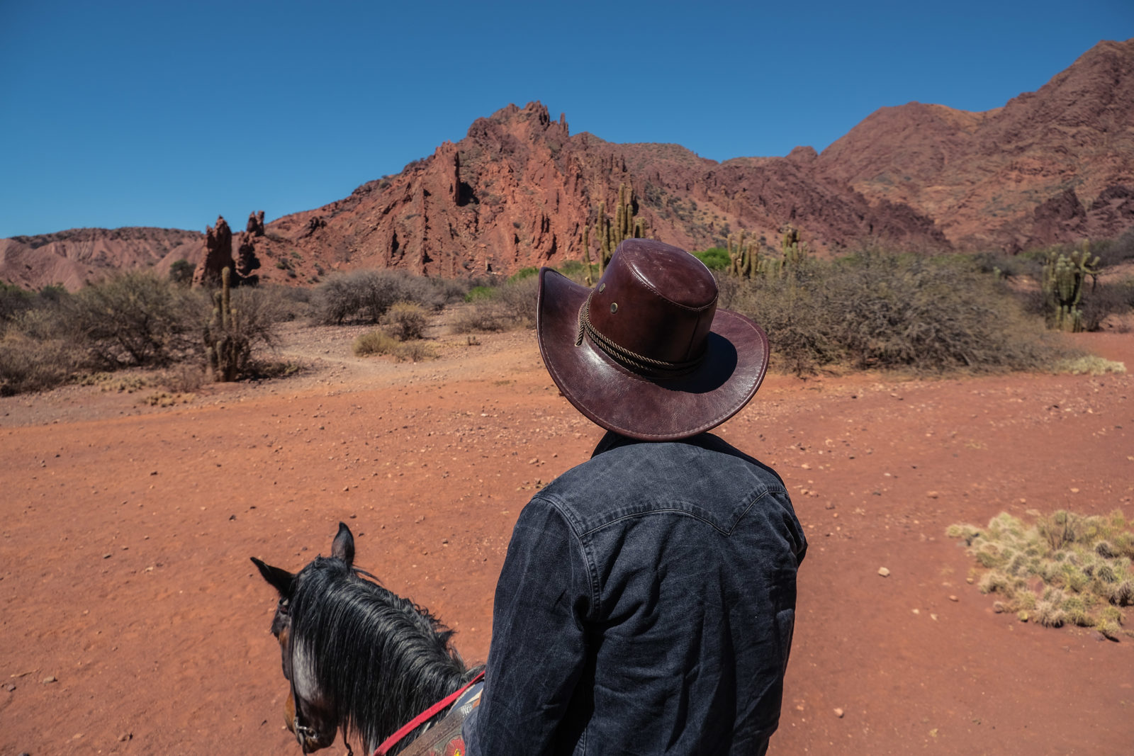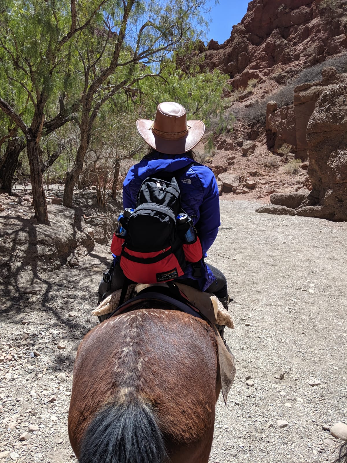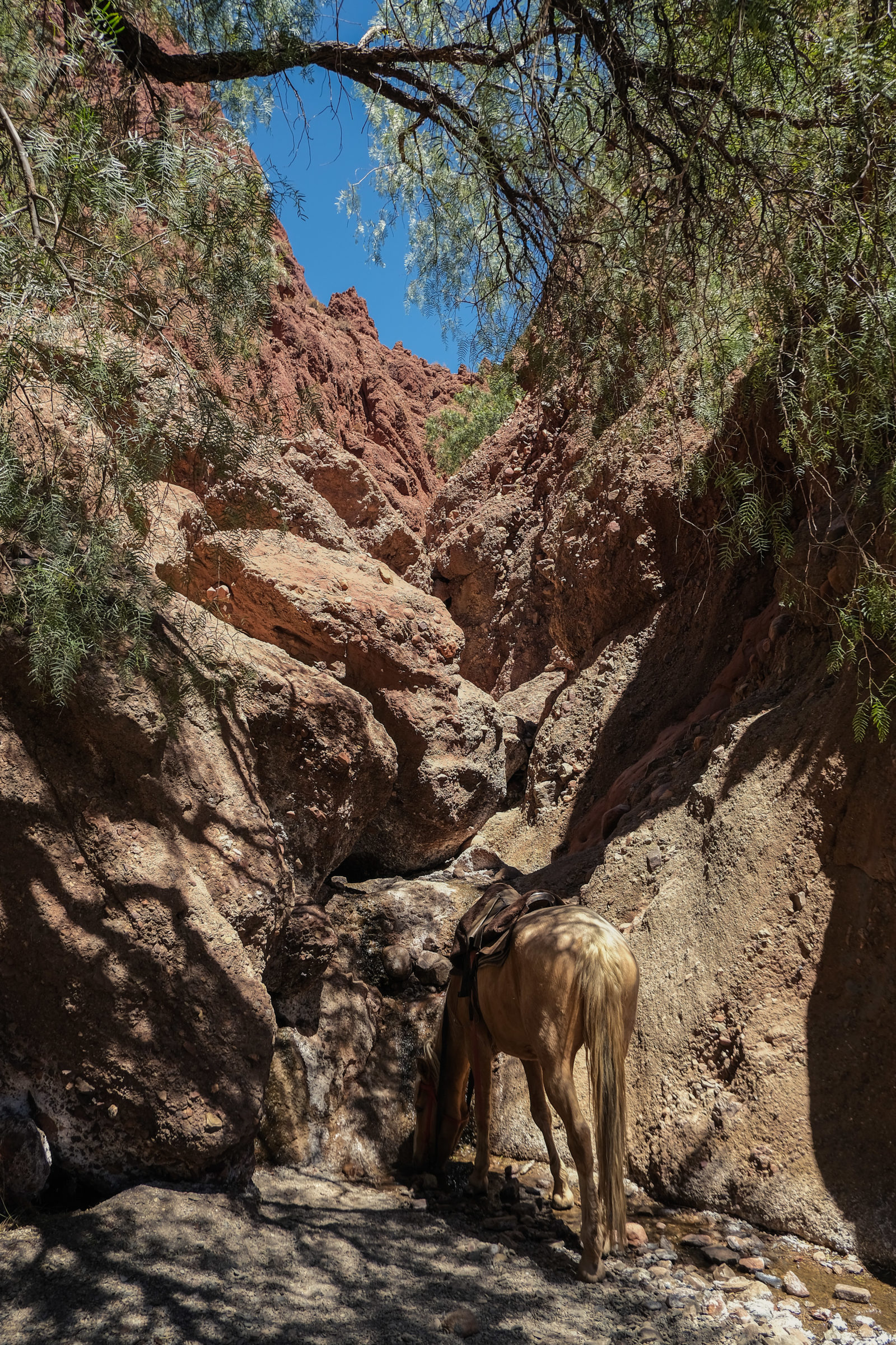 La balade était très jolie et mon cheval était très sympa, contrairement à celui de Tom qui n’avait pas vraiment envi d’être avec nous mais ça s’est bien passé quand même ! Bref, c’était très joli, nous étions dans des paysages de films de western. Il y avait des grandes, nan, des gigantesques montagnes rouges et des grands pics de roches formés par le vent et la pluie. Ils semblaient se détacher de leur montagne et prendre leur liberté ! C’était vraiment chouette. Nous sommes passés par la porte du diable (la légende dit que le diable serait passé par là pour enlever la fille d’un propriétaire du coin et l’aurait faite prisonnière dans une grotte. Personne ne saurait si elle a été retrouvée vivante ou pas mais son père serait parti à la poursuite du diable).