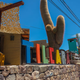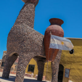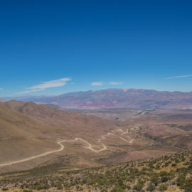 Même si le soleil était bien présent et qu’il n’y avait pas de nuage dans ce ciel bleu, le vent était quand même très froid. Bien moins qu’en haut de la montagne aux 7 couleurs du Pérou car celle-ci ce trouve beaucoup plus haut en altitude mais tout de même la petite laine était de rigueur ! Après s’être émerveillé pendant une dizaine de minutes, nous rebroussions chemin vers la voiture pour continuer notre journée. Le chemin du retour nous offrait également un paysage spectaculaire, depuis le haut de la montagne nous avions vue sur le chemin serpenté que nous avions dû emprunter pour monter et aussi sur des montagnes rouges et à certain endroit colorés situé en arrière plan ! Alors que nous redescendions, plusieurs voitures et tours montaient, on est passé à travers la vague de visite organisée. Pour la suite de cette journée nous n’étions pas décidés car deux choses nous tentaient : les salines et le parc national. Sauf que l’un et l’autre étaient au moins à 3h de route et le lendemain nous devions repartir en direction de Salta ! Sachant que nous n’aurions pas le temps de faire les visites dans l’aprem car les sites seraient fermé à notre arrivée, nous avons finalement décidé de resté du côté de Tilcara, la ville où nous avions dormi la veille et de visiter ce village et les alentours le lendemain matin. Il était presque 15h lorsque nous sommes arrivés dans ce village pour déjeuner ! Aurélie a enfin pu tester le maté. Cette boisson qui ressemble à du thé et que tous les argentins boivent absolument tout le temps et partout ! Comme je ne raffole pas du thé et bien je n’ai pas aimé le maté. Tom pourrait peut-être devenir un buveur de maté, il n’a pas trouvé ça mauvais ! Après le déjeuner nous avons déposés nos affaires à l’auberge et sommes sorti faire la visite du village. C’était assez rapide car c’est plutôt petit mais mignon même si, comme à Purmamarca, il y a des dizaines de boutiques à bibelot pour touriste.