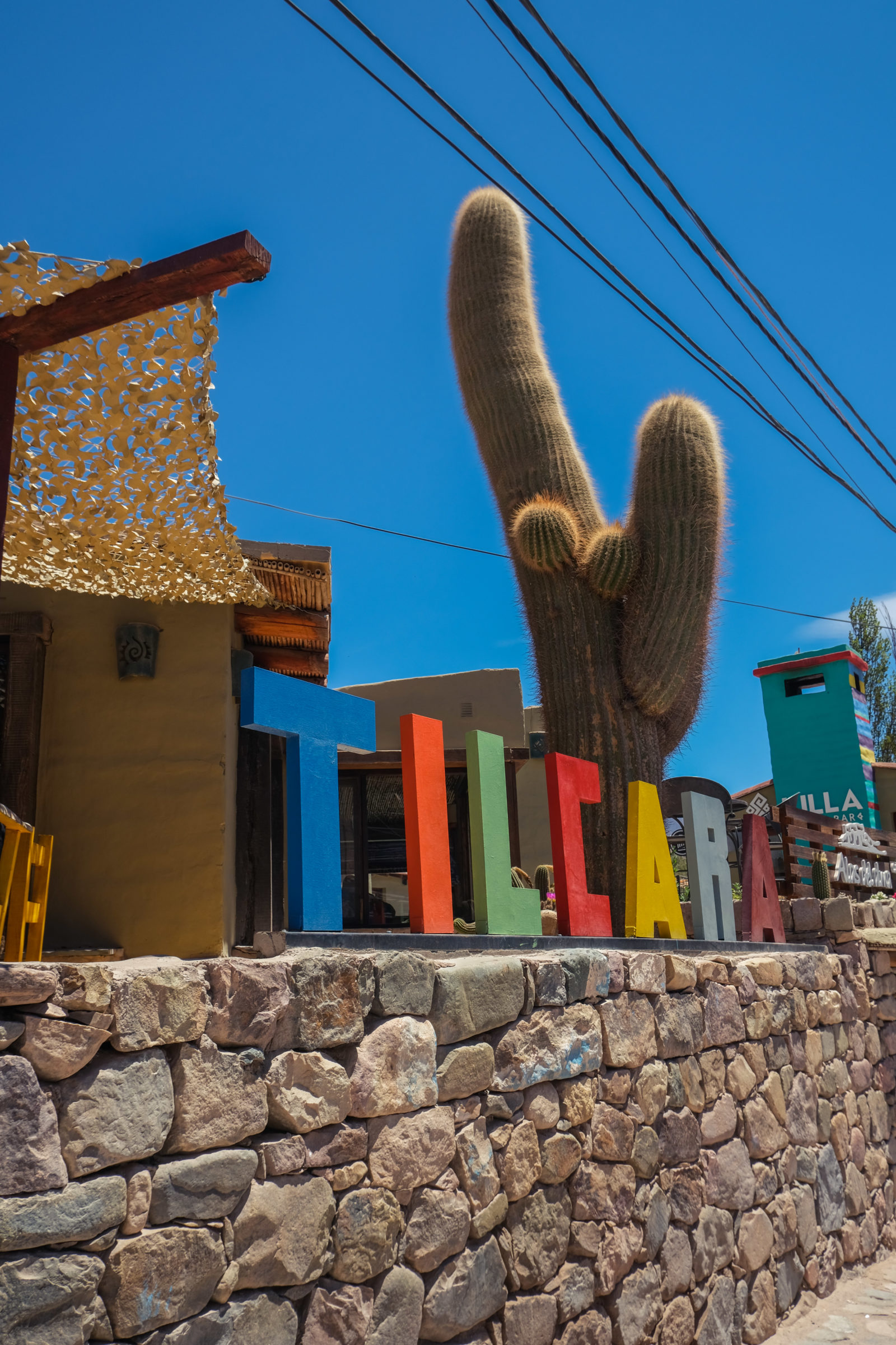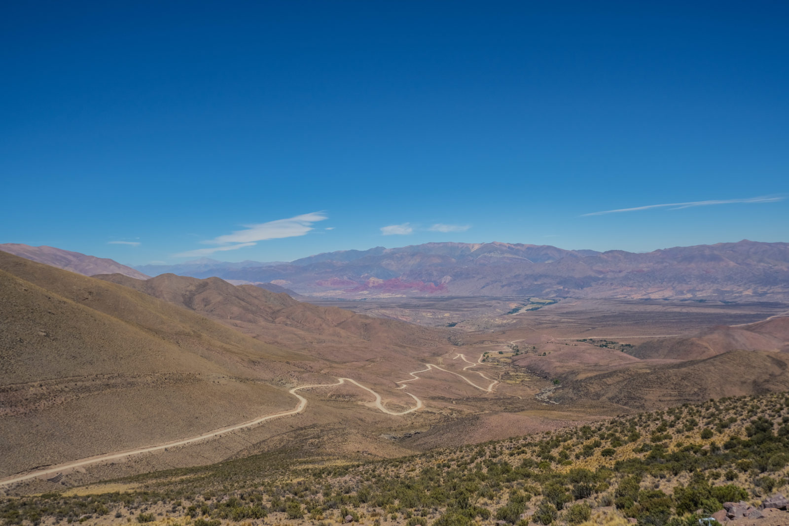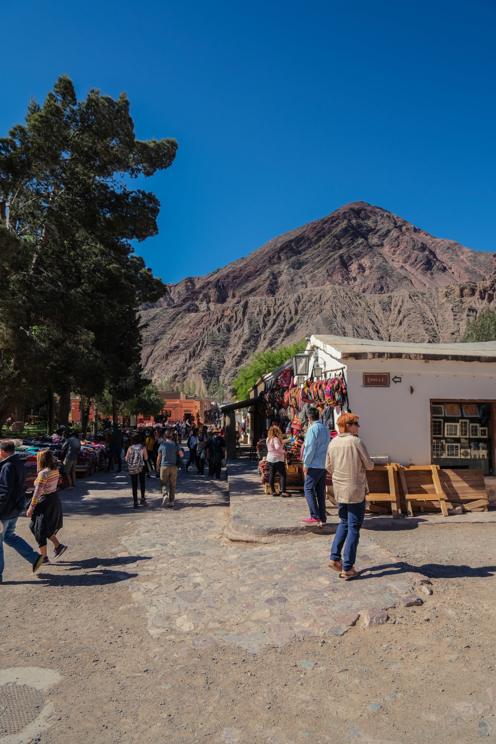 Même si le soleil était bien présent et qu’il n’y avait pas de nuage dans ce ciel bleu, le vent était quand même très froid. Bien moins qu’en haut de la montagne aux 7 couleurs du Pérou car celle-ci ce trouve beaucoup plus haut en altitude mais tout de même la petite laine était de rigueur ! Après s’être émerveillé pendant une dizaine de minutes, nous rebroussions chemin vers la voiture pour continuer notre journée. Le chemin du retour nous offrait également un paysage spectaculaire, depuis le haut de la montagne nous avions vue sur le chemin serpenté que nous avions dû emprunter pour monter et aussi sur des montagnes rouges et à certain endroit colorés situé en arrière plan ! Alors que nous redescendions, plusieurs voitures et tours montaient, on est passé à travers la vague de visite organisée. Pour la suite de cette journée nous n’étions pas décidés car deux choses nous tentaient : les salines et le parc national. Sauf que l’un et l’autre étaient au moins à 3h de route et le lendemain nous devions repartir en direction de Salta ! Sachant que nous n’aurions pas le temps de faire les visites dans l’aprem car les sites seraient fermé à notre arrivée, nous avons finalement décidé de resté du côté de Tilcara, la ville où nous avions dormi la veille et de visiter ce village et les alentours le lendemain matin. Il était presque 15h lorsque nous sommes arrivés dans ce village pour déjeuner ! Aurélie a enfin pu tester le maté. Cette boisson qui ressemble à du thé et que tous les argentins boivent absolument tout le temps et partout ! Comme je ne raffole pas du thé et bien je n’ai pas aimé le maté. Tom pourrait peut-être devenir un buveur de maté, il n’a pas trouvé ça mauvais ! Après le déjeuner nous avons déposés nos affaires à l’auberge et sommes sorti faire la visite du village. C’était assez rapide car c’est plutôt petit mais mignon même si, comme à Purmamarca, il y a des dizaines de boutiques à bibelot pour touriste.