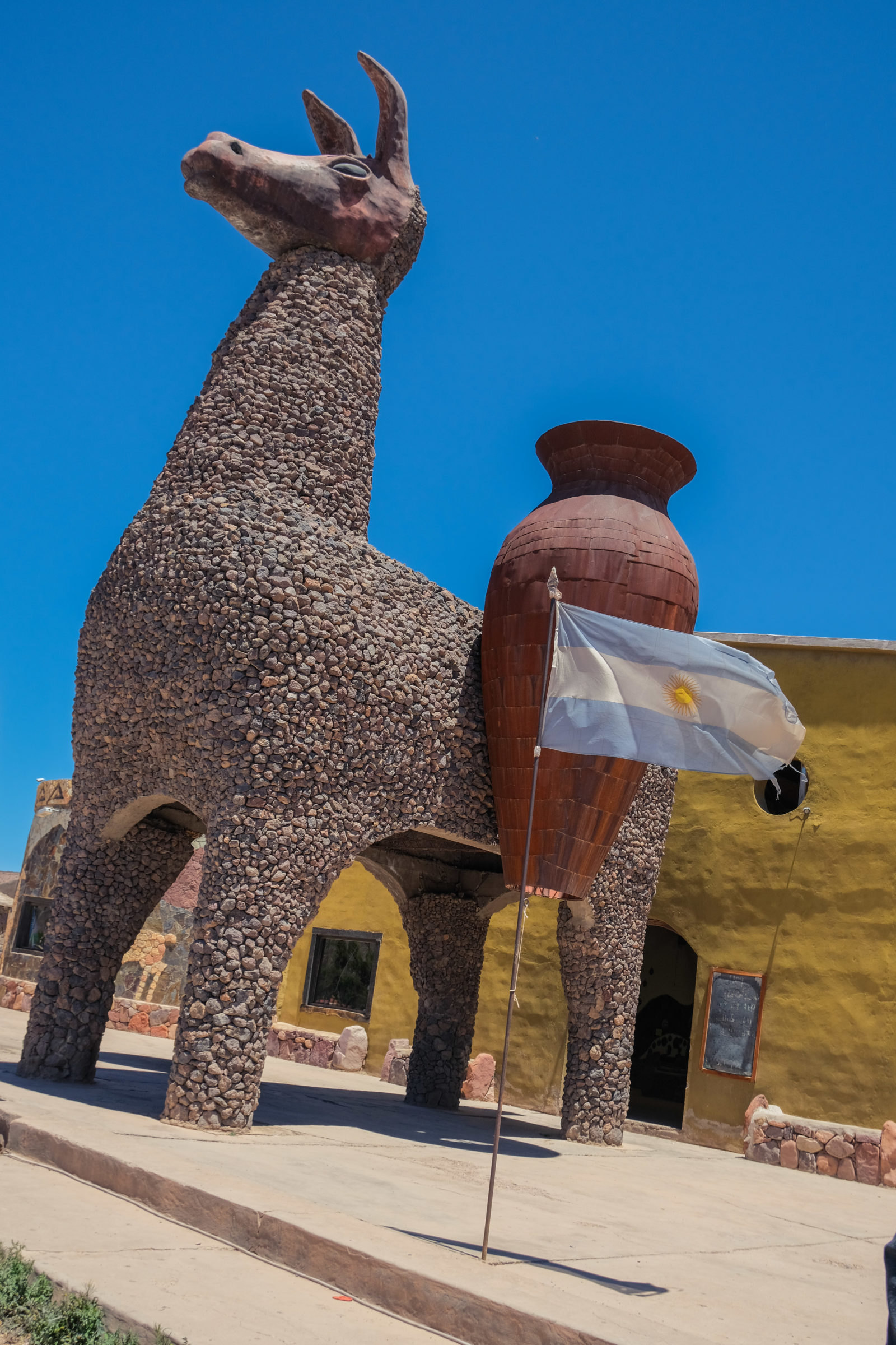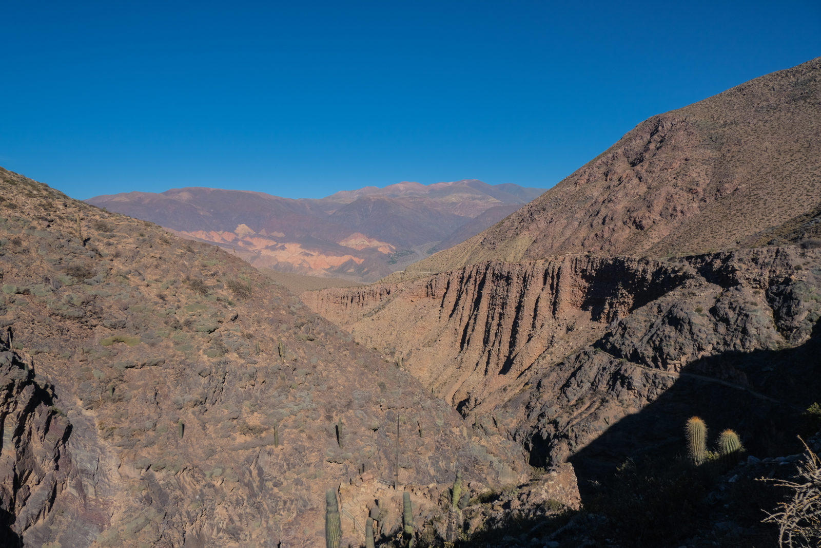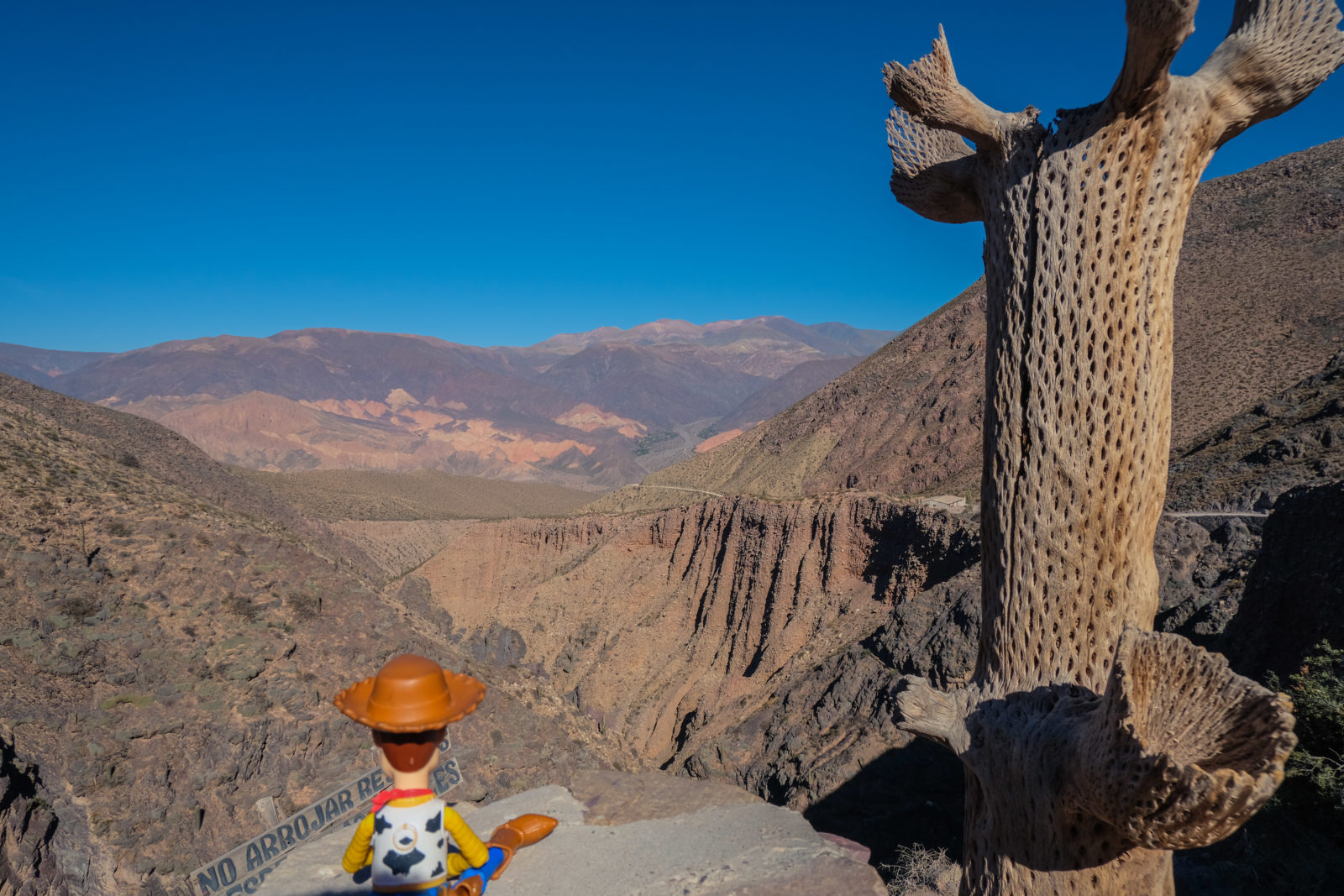 Même si le soleil était bien présent et qu’il n’y avait pas de nuage dans ce ciel bleu, le vent était quand même très froid. Bien moins qu’en haut de la montagne aux 7 couleurs du Pérou car celle-ci ce trouve beaucoup plus haut en altitude mais tout de même la petite laine était de rigueur ! Après s’être émerveillé pendant une dizaine de minutes, nous rebroussions chemin vers la voiture pour continuer notre journée. Le chemin du retour nous offrait également un paysage spectaculaire, depuis le haut de la montagne nous avions vue sur le chemin serpenté que nous avions dû emprunter pour monter et aussi sur des montagnes rouges et à certain endroit colorés situé en arrière plan ! Alors que nous redescendions, plusieurs voitures et tours montaient, on est passé à travers la vague de visite organisée. Pour la suite de cette journée nous n’étions pas décidés car deux choses nous tentaient : les salines et le parc national. Sauf que l’un et l’autre étaient au moins à 3h de route et le lendemain nous devions repartir en direction de Salta ! Sachant que nous n’aurions pas le temps de faire les visites dans l’aprem car les sites seraient fermé à notre arrivée, nous avons finalement décidé de resté du côté de Tilcara, la ville où nous avions dormi la veille et de visiter ce village et les alentours le lendemain matin. Il était presque 15h lorsque nous sommes arrivés dans ce village pour déjeuner ! Aurélie a enfin pu tester le maté. Cette boisson qui ressemble à du thé et que tous les argentins boivent absolument tout le temps et partout ! Comme je ne raffole pas du thé et bien je n’ai pas aimé le maté. Tom pourrait peut-être devenir un buveur de maté, il n’a pas trouvé ça mauvais ! Après le déjeuner nous avons déposés nos affaires à l’auberge et sommes sorti faire la visite du village. C’était assez rapide car c’est plutôt petit mais mignon même si, comme à Purmamarca, il y a des dizaines de boutiques à bibelot pour touriste.